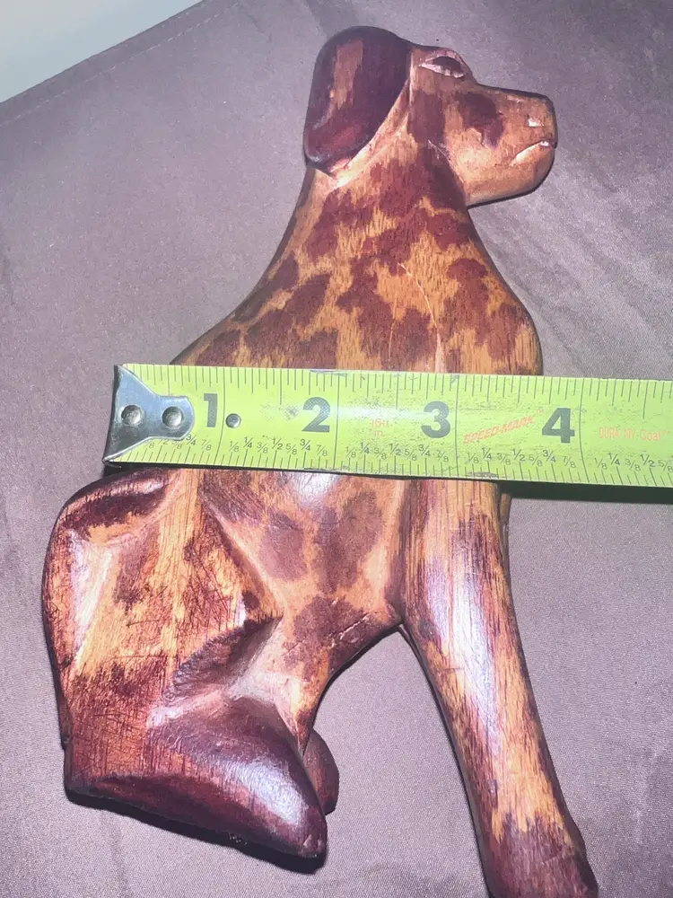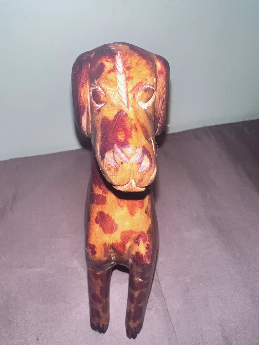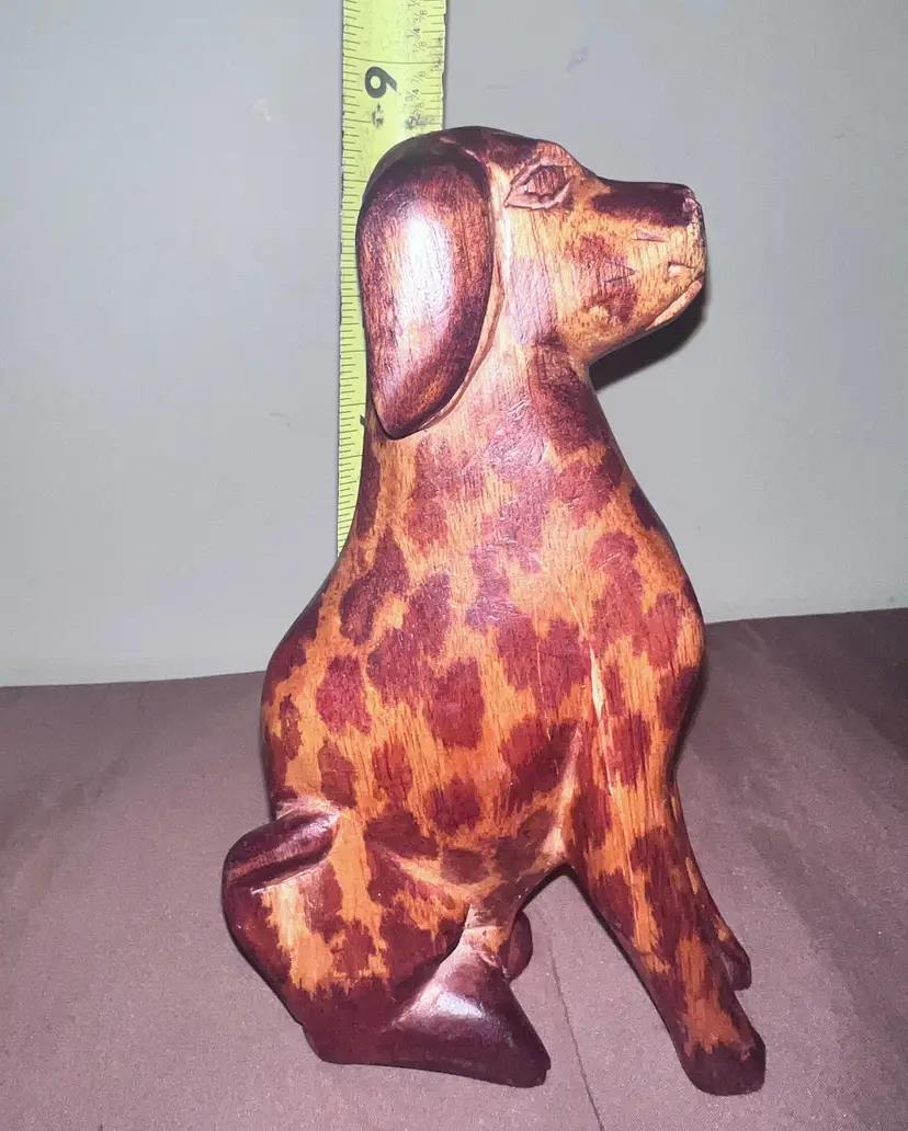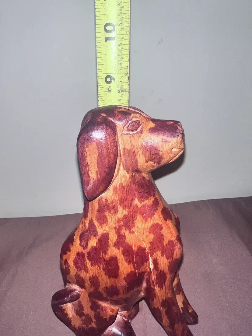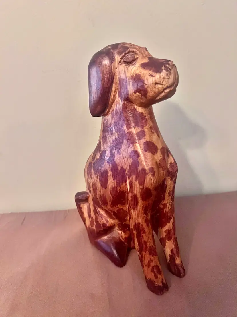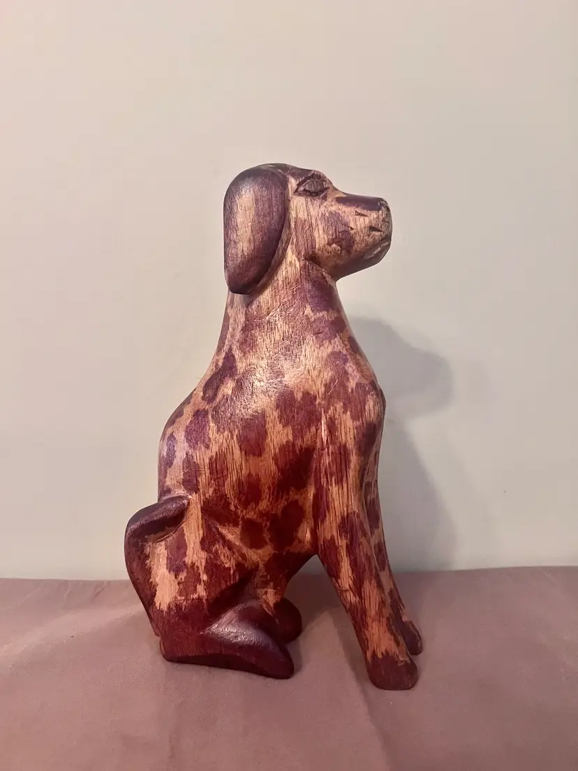 Hand carved wood folk art dog figurine. He is a unique guy with spots. The wood has a distinct grain and color variations. He is in a seated position. On one side you will notice fading of the spots, which gives you an option on which you side you want to display. He measures approximately 8.5 inches tall. There are no cracks in the wood. Just the fading on one side.