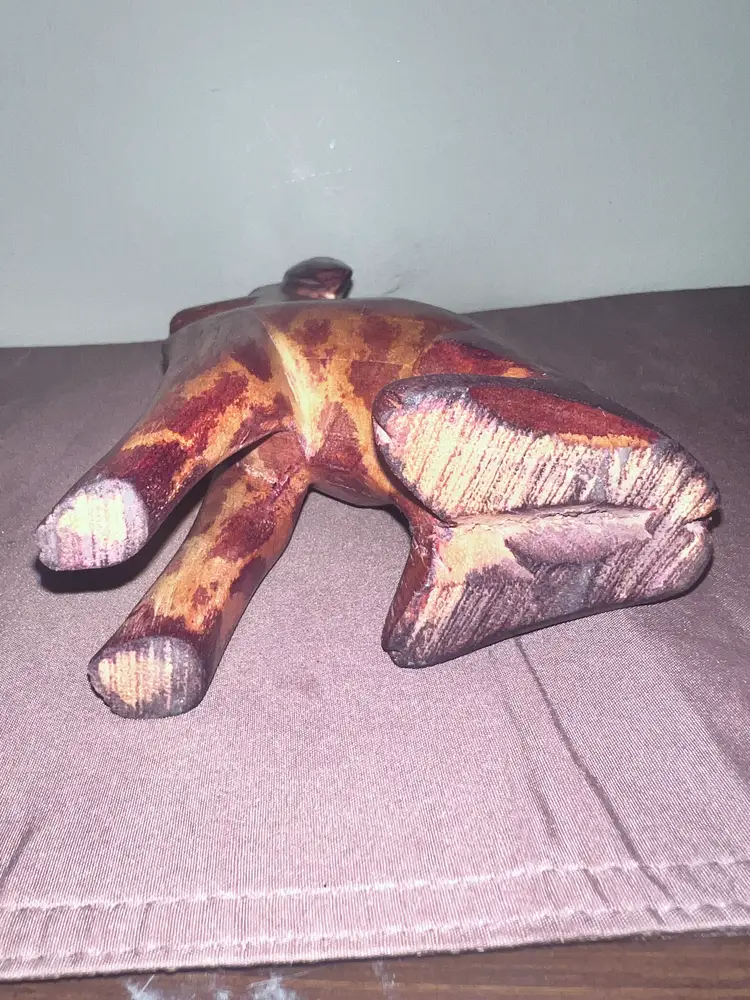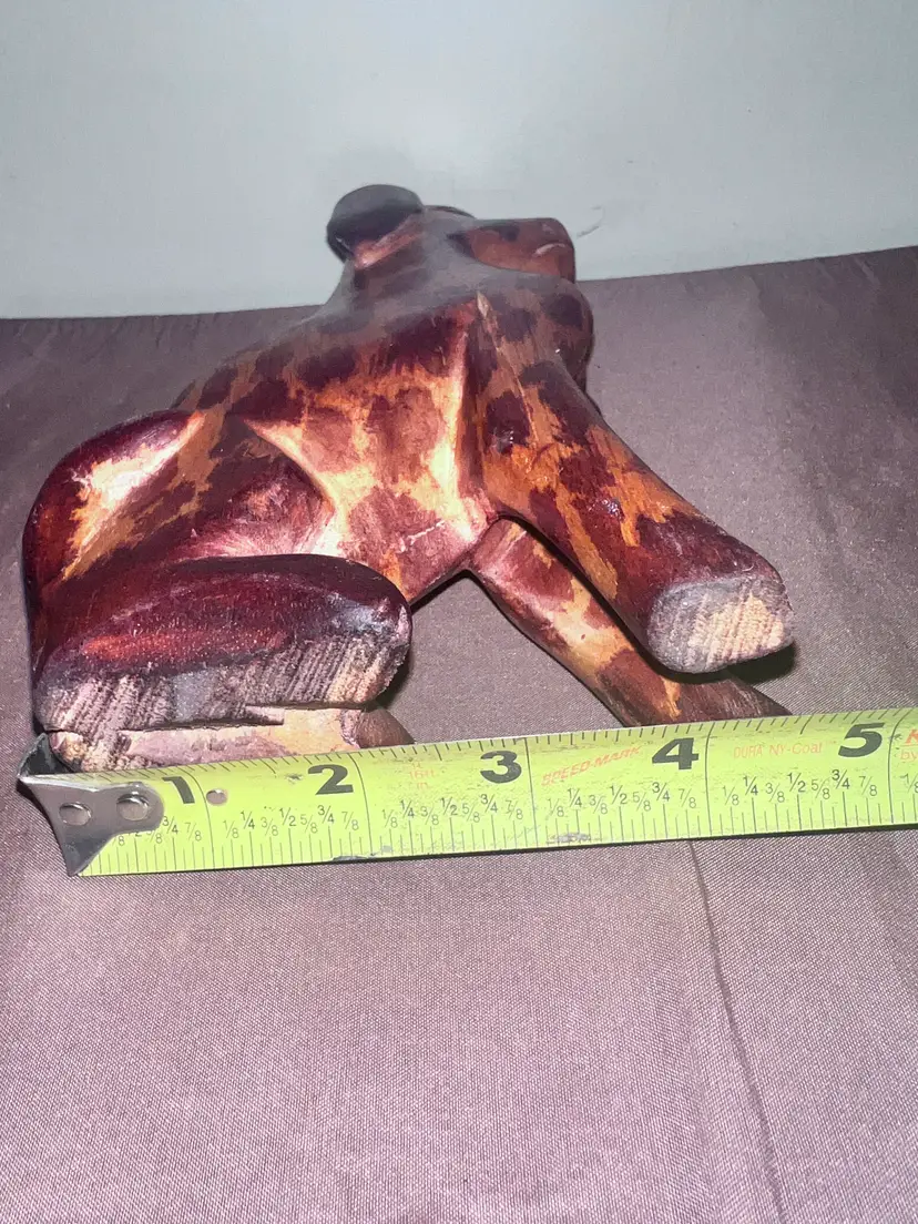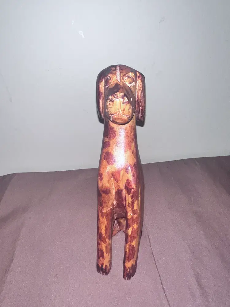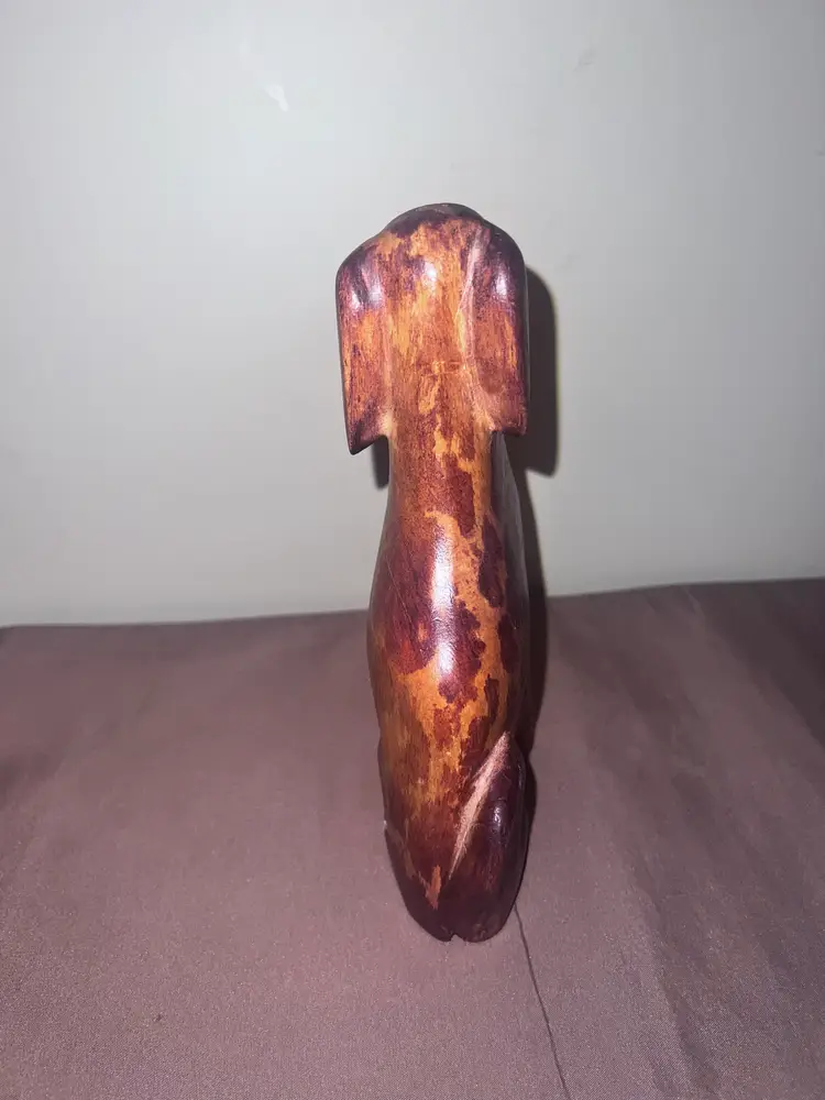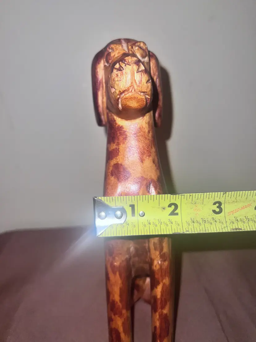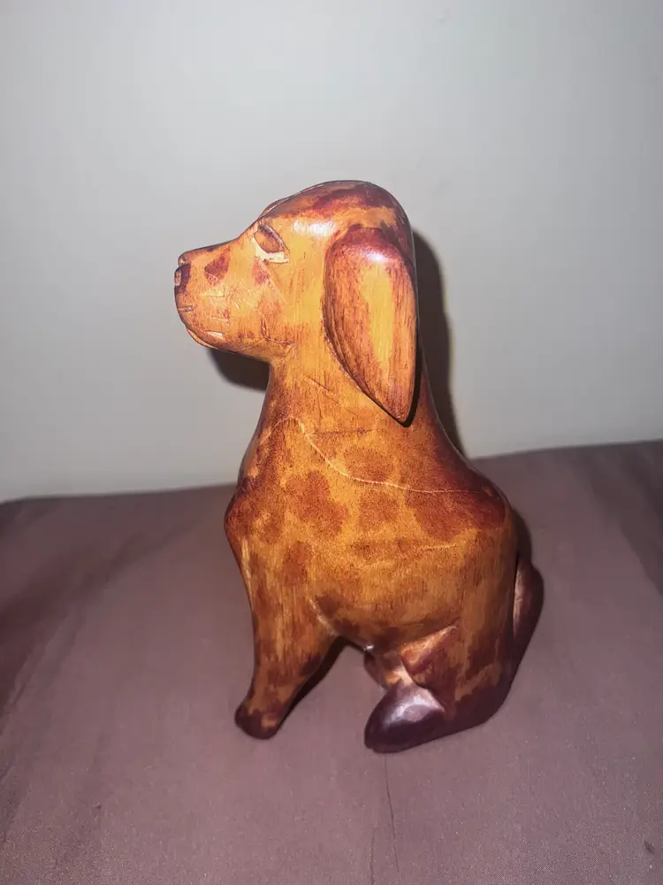 Hand carved wood folk art dog figurine. He is a unique guy with spots. The wood has a distinct grain and color variations. He is in a seated position. On one side you will notice fading of the spots, which gives you an option on which you side you want to display. He measures approximately 8.5 inches tall. There are no cracks in the wood. Just the fading on one side.