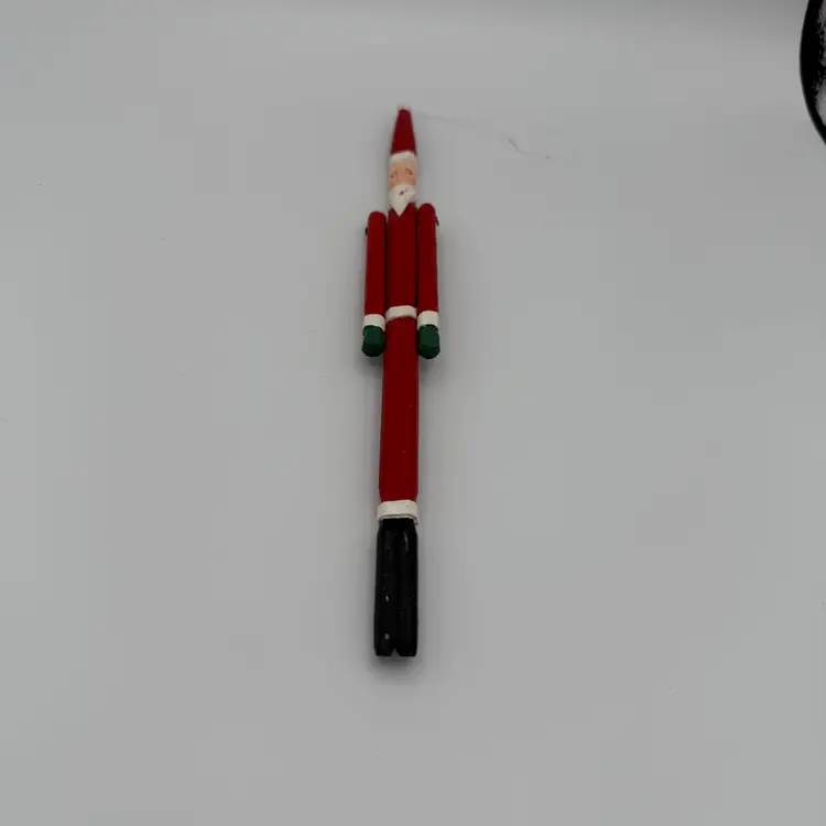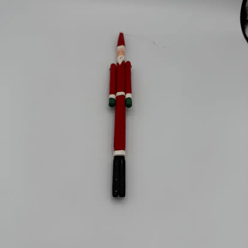 Wooden Handcrafted Santa Claus. Has a loop at the top for hanging on a Christmas Tree. Classic design of Santa Claus with arms that move. Has a red coat and pants with white beard. 10" Long