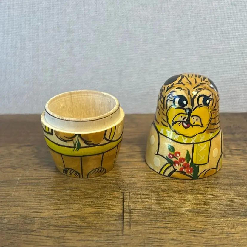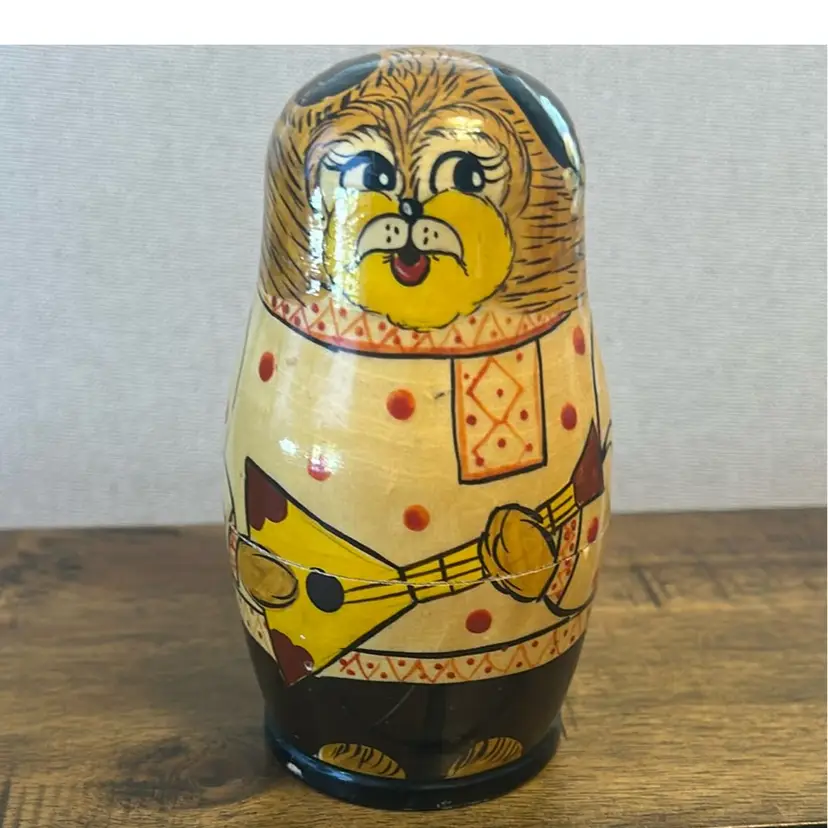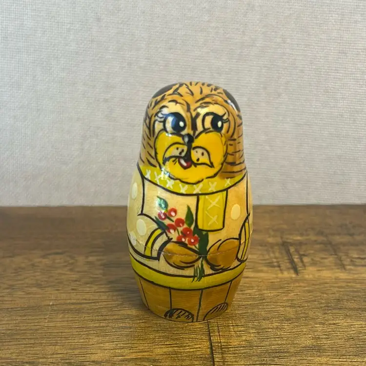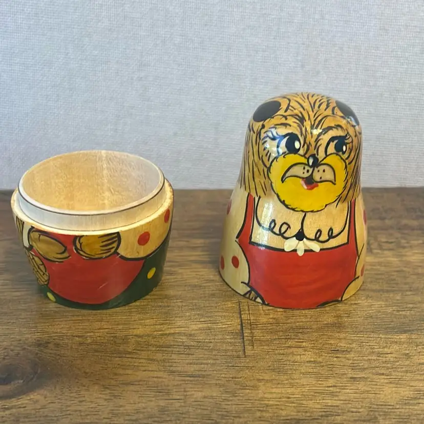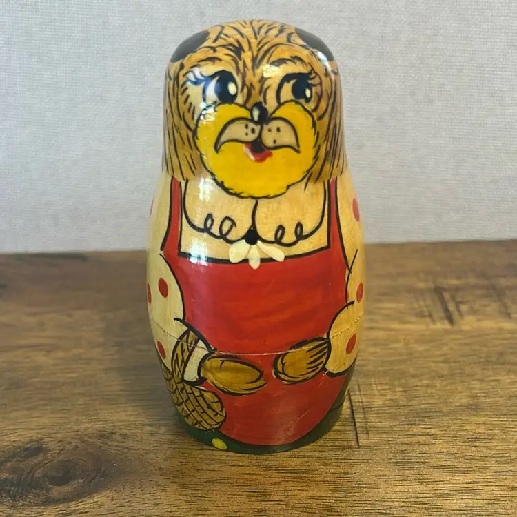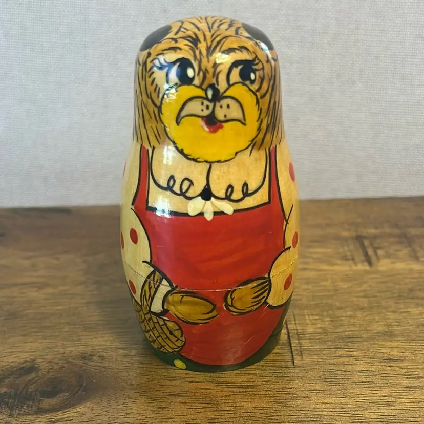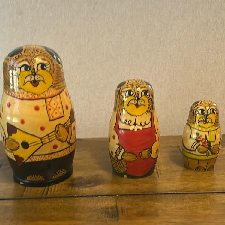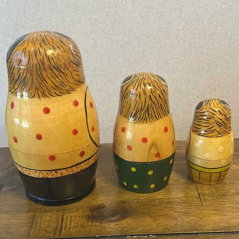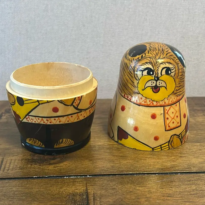 These 3 wooden nesting dolls have a different lion design on each one. They range in heights are 5”, 3.5”, and 2,5”