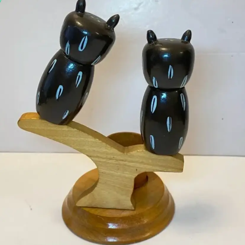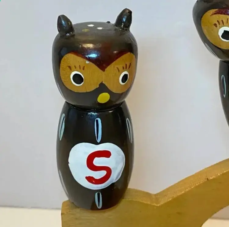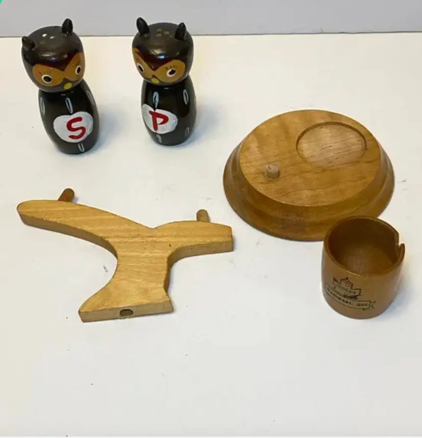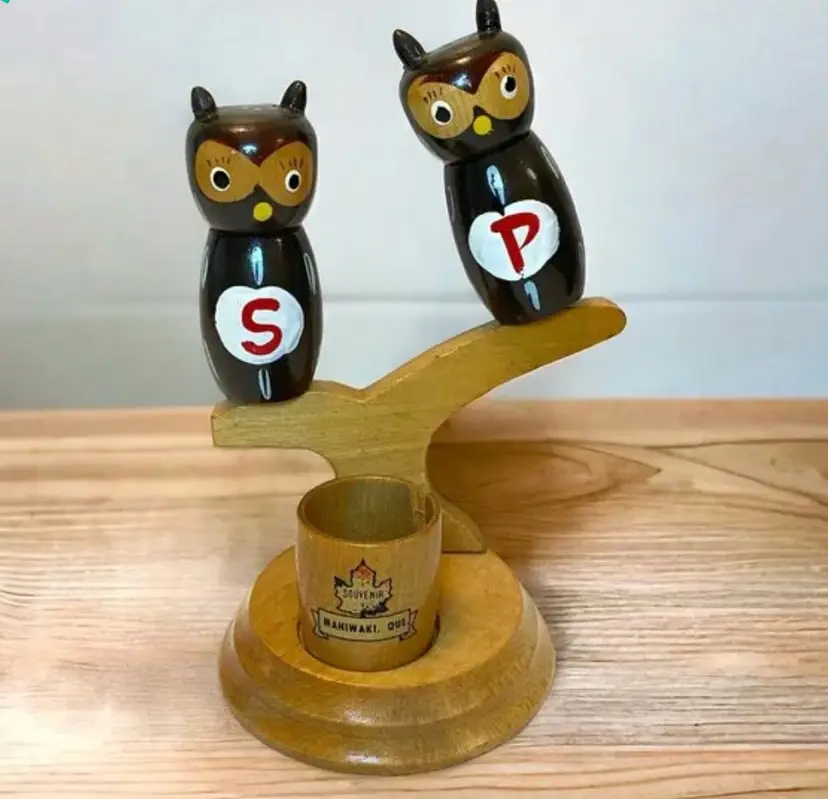 Vintage Wooden Owls on Tree Branch Salt and Pepper Shakers & Toothpick Holder Souvenir from Maniwaki, Quebec, Canada. Dates back from the late 60's to early 70's. Measures 6 inches high 116 grams