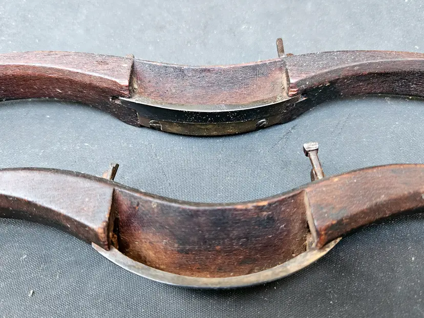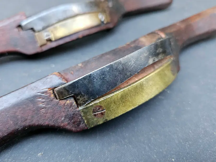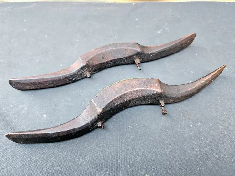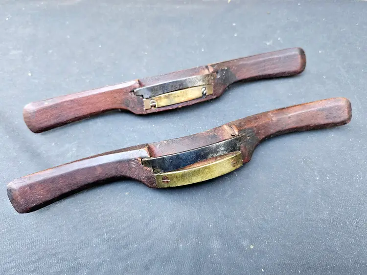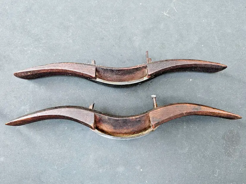 Pair of wooden razor edge spokeshaves. Designed for fine finishing work, where a very smooth surface is required. For intricate shaping, this type of shave can provide a level of finesse that adjustable shaves cannot match. They have some miles on them, but will clean and tune to make nice workers.