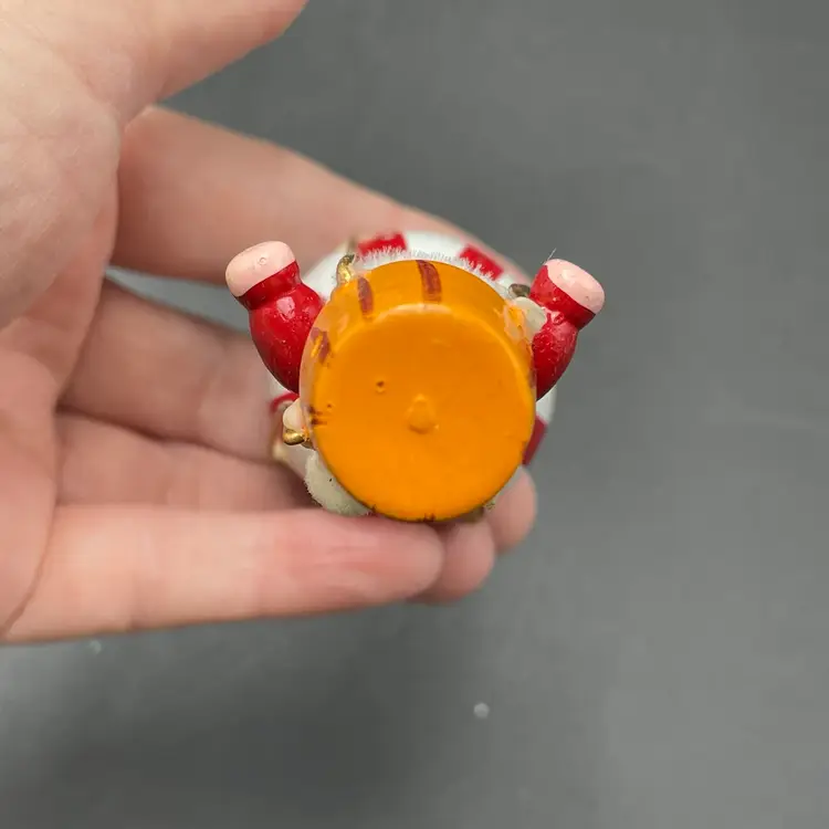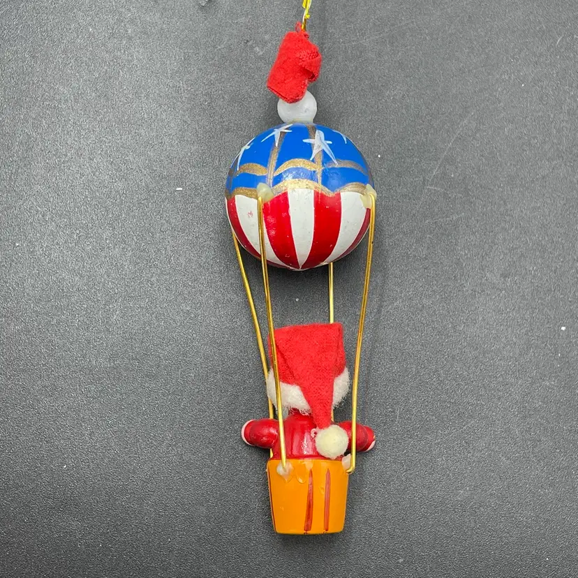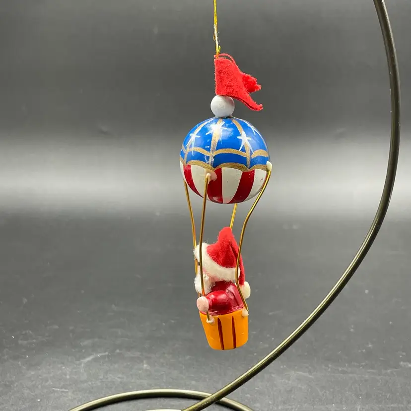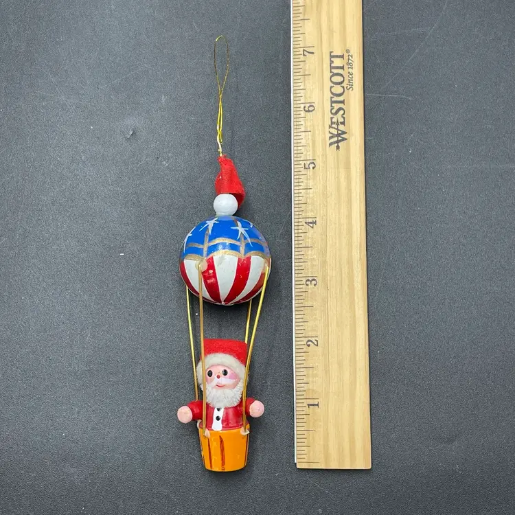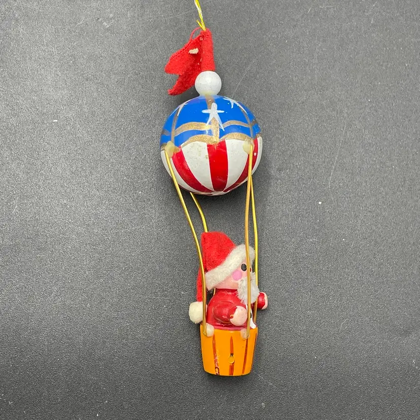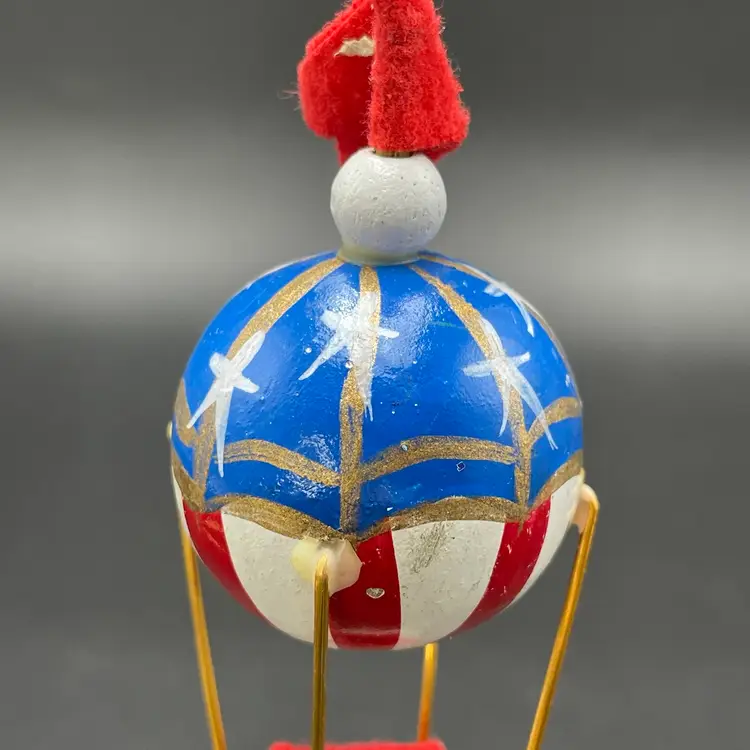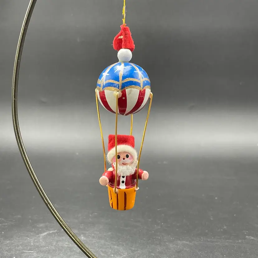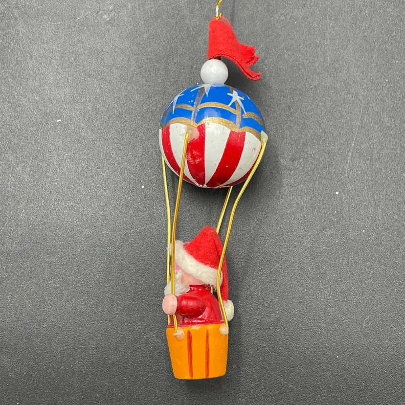 This is a vintage wooden Santa riding in a hot air balloon hanging ornament. The ropes are wire. Measures approximately 4.5" long. No major flaws.