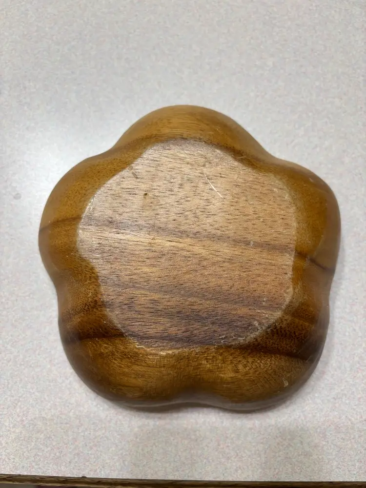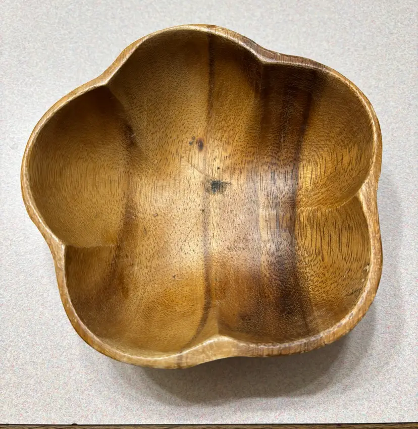 Beautiful wooden bowl with a scalloped shape. Perfect for decor or serving. Some wear on the sides and bottom.