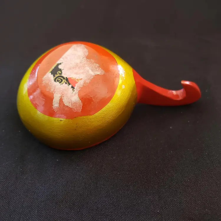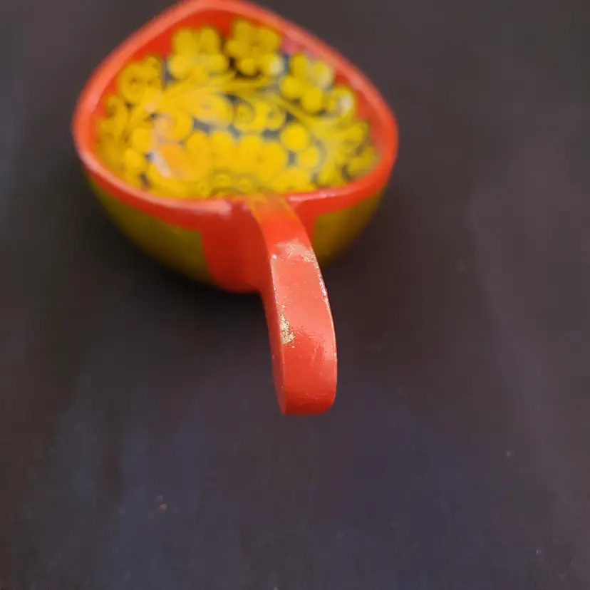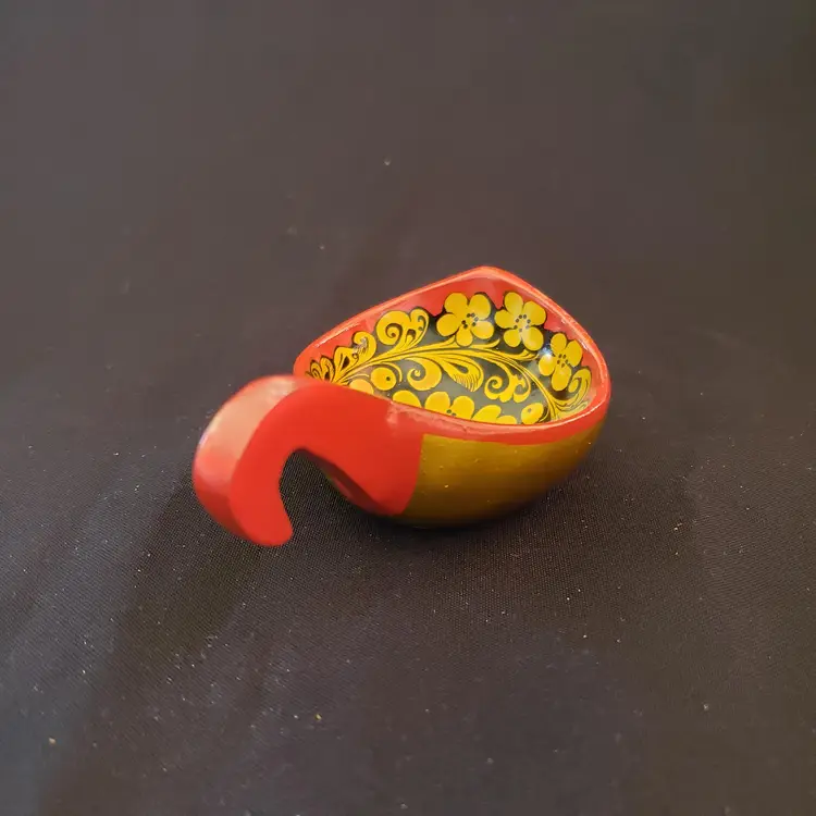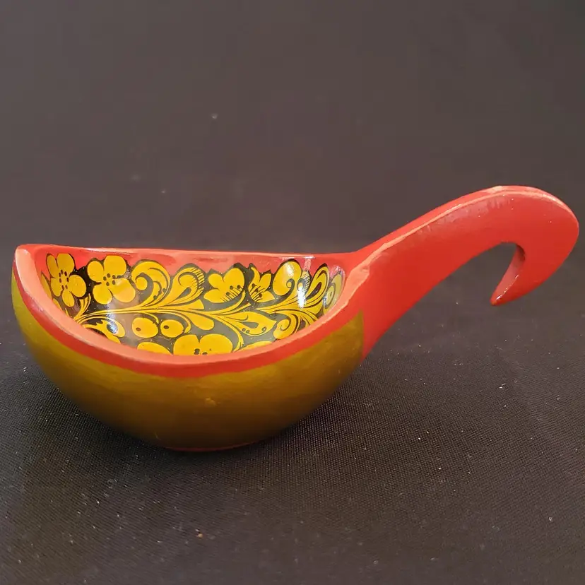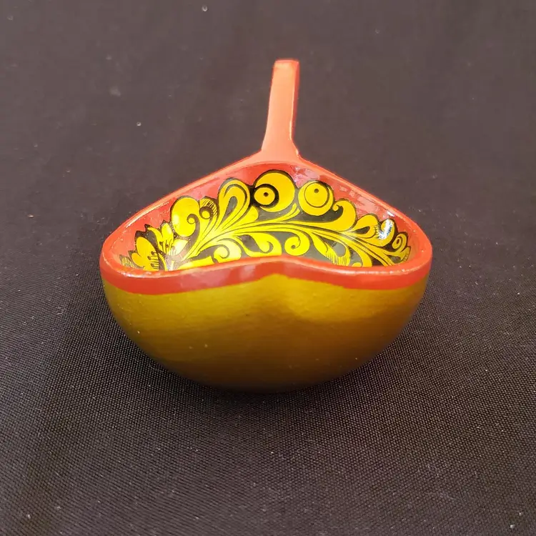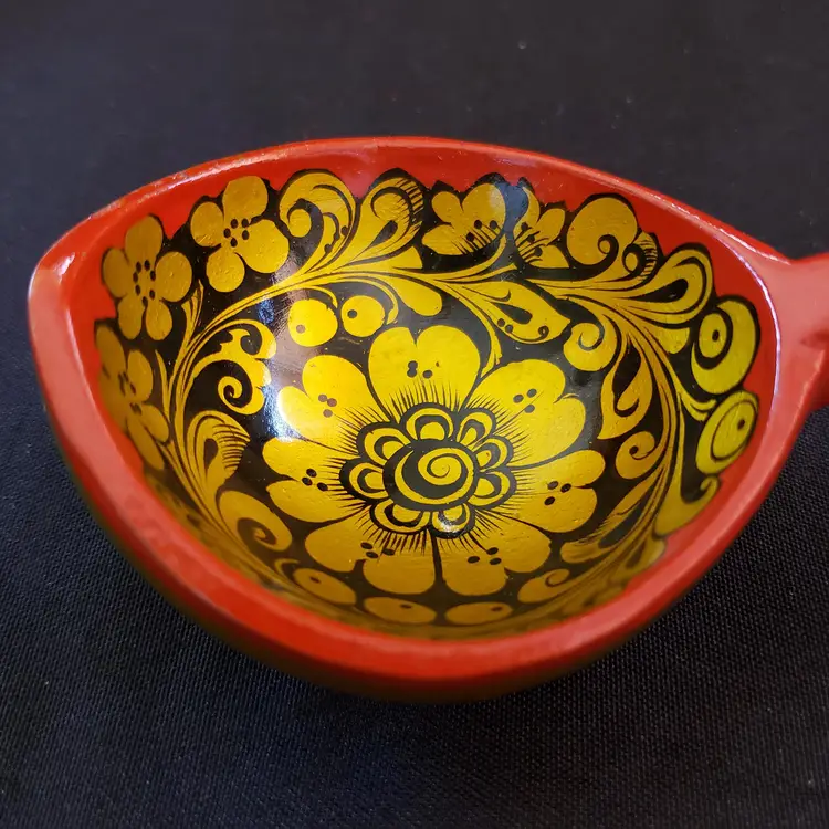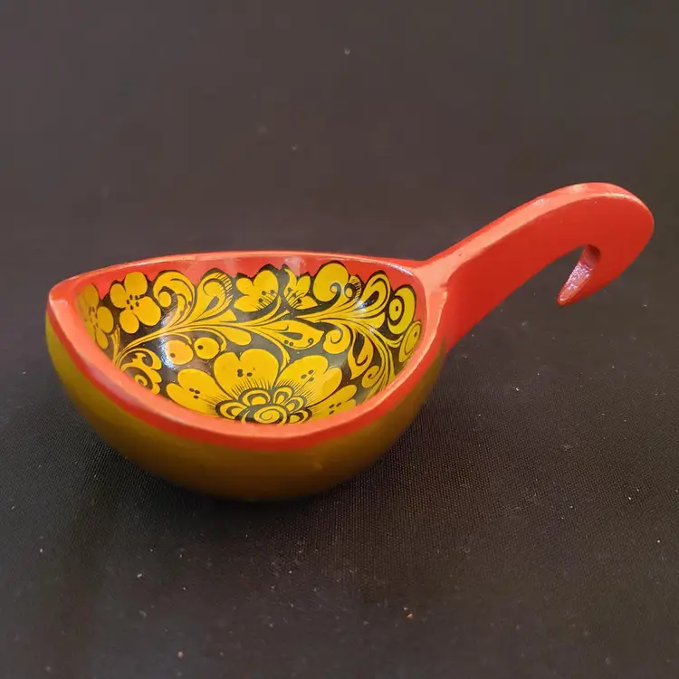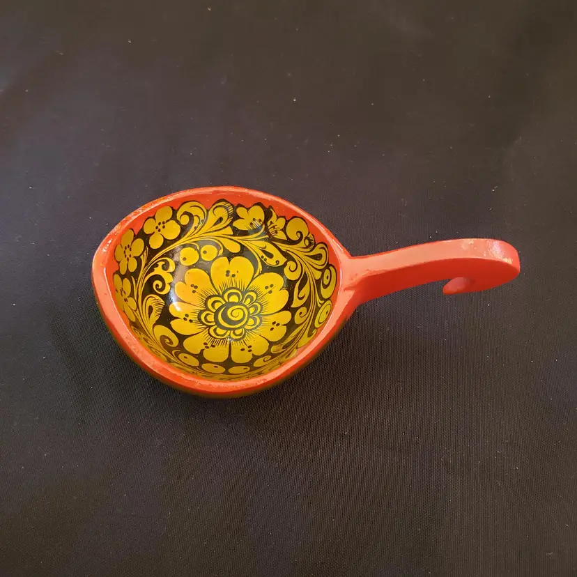 Wooden Scoop Handpainted Soviet Arts and Crafts Handmade USSR Ukraine Vintage 4⅜" long. Used condition missing paint, manufacturer flaws including dirt, bubbles, within the gloss. Please view all the photos and read the entire item description and please ask any questions prior to purchase when possible.