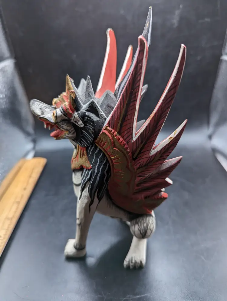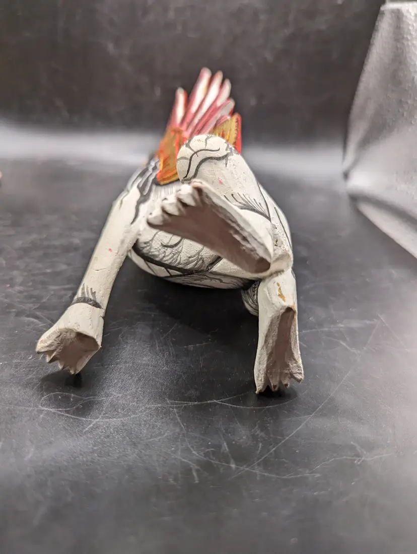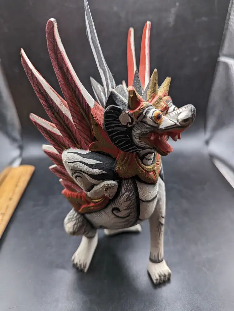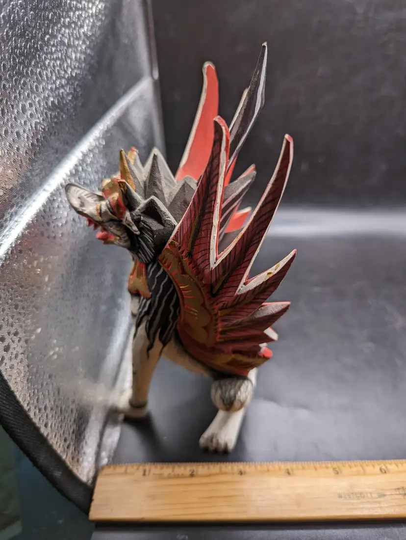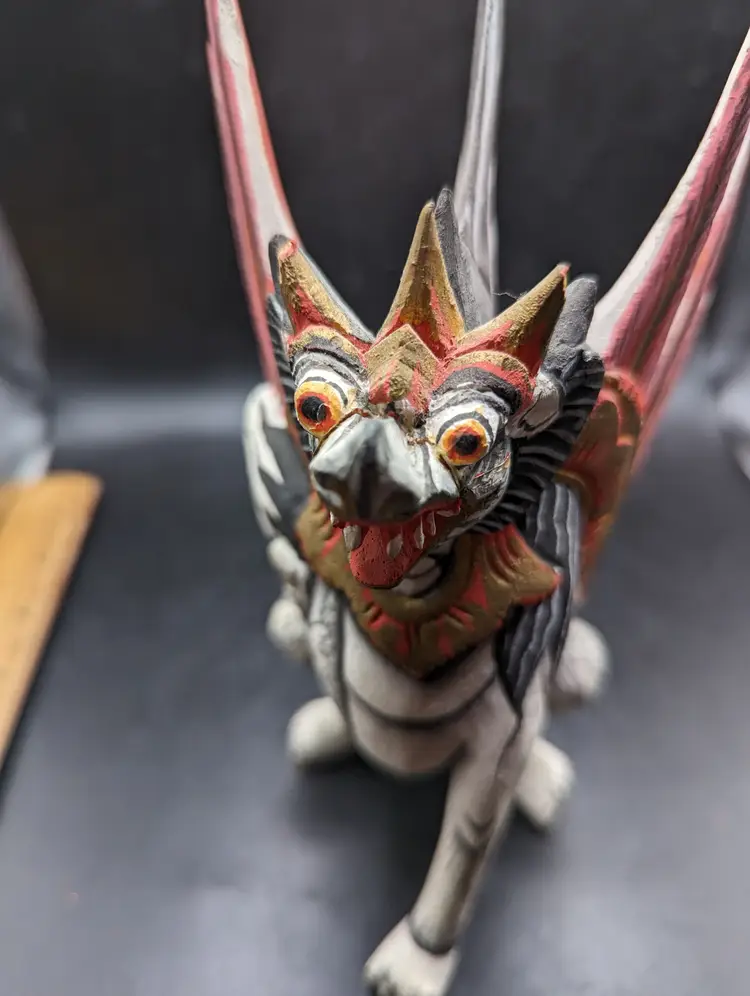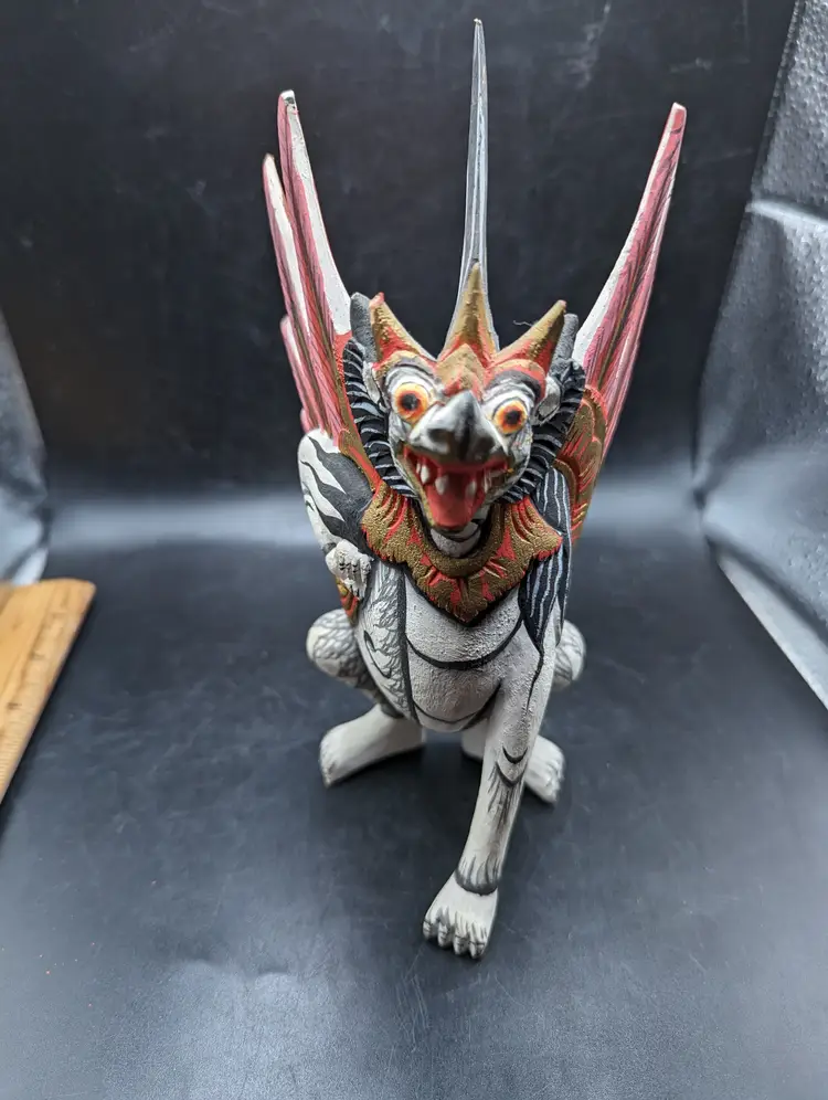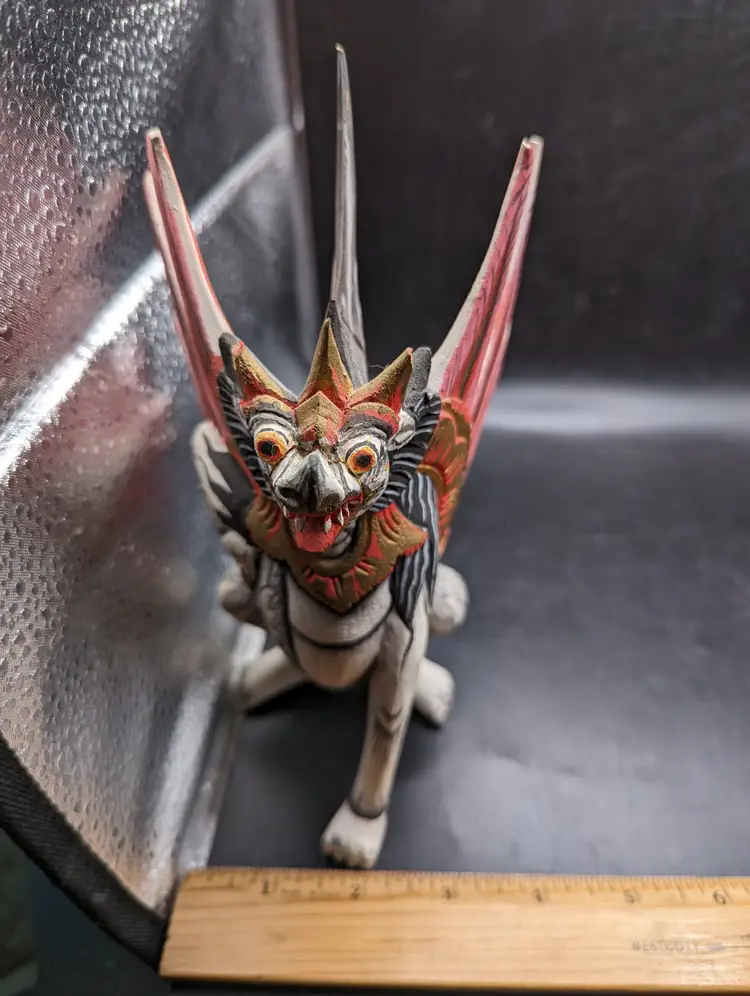 This is a fantastic Wooden Winged Singa Lion Dragon Figurine 7" Balinese Bali Folk Art. He is quite colorful and unique. He does have small chip on his one horn as seen in last picture. Please see all pictures for condition and measurements.