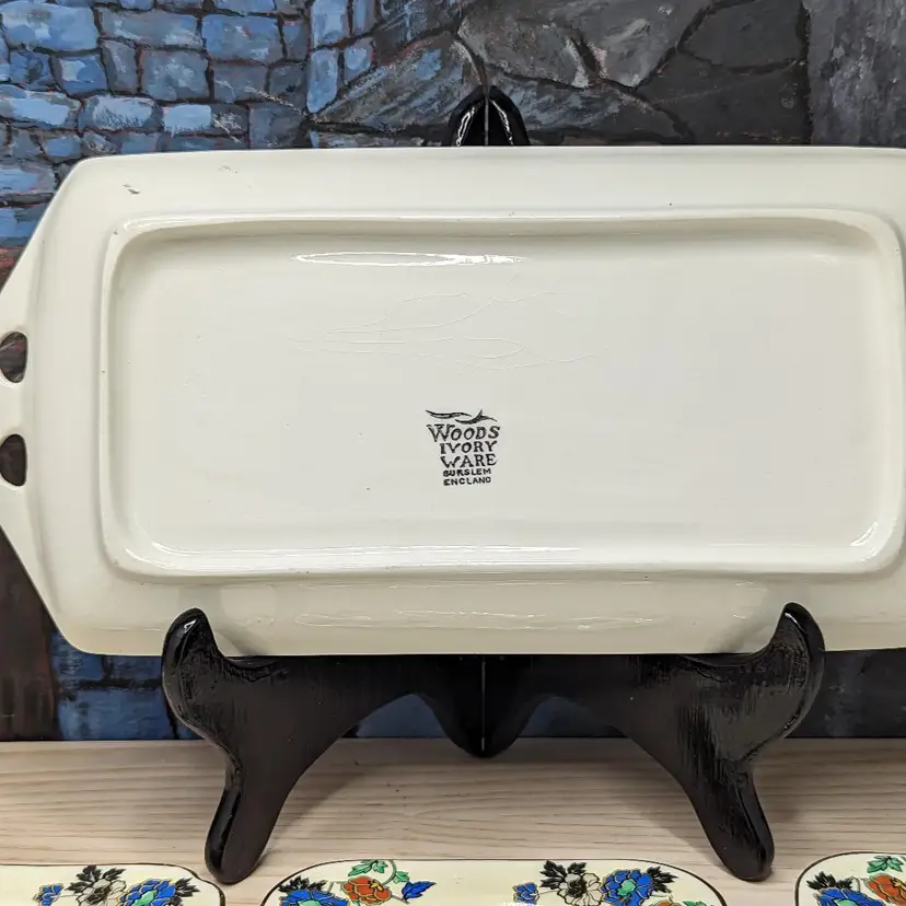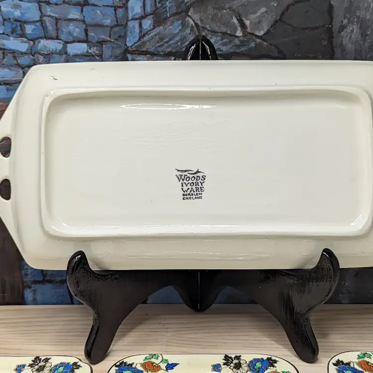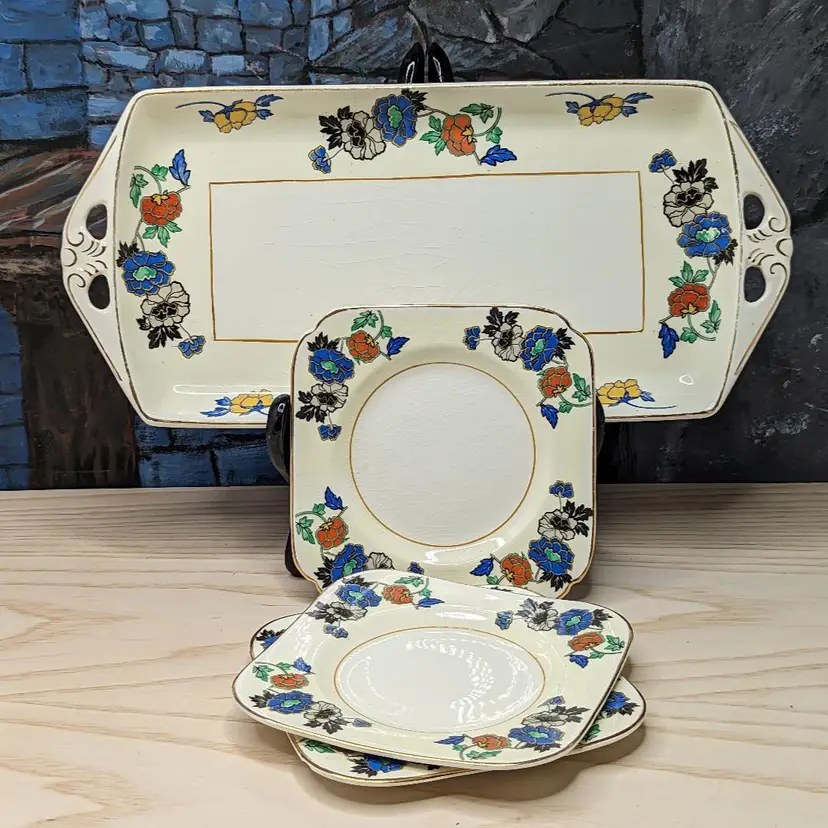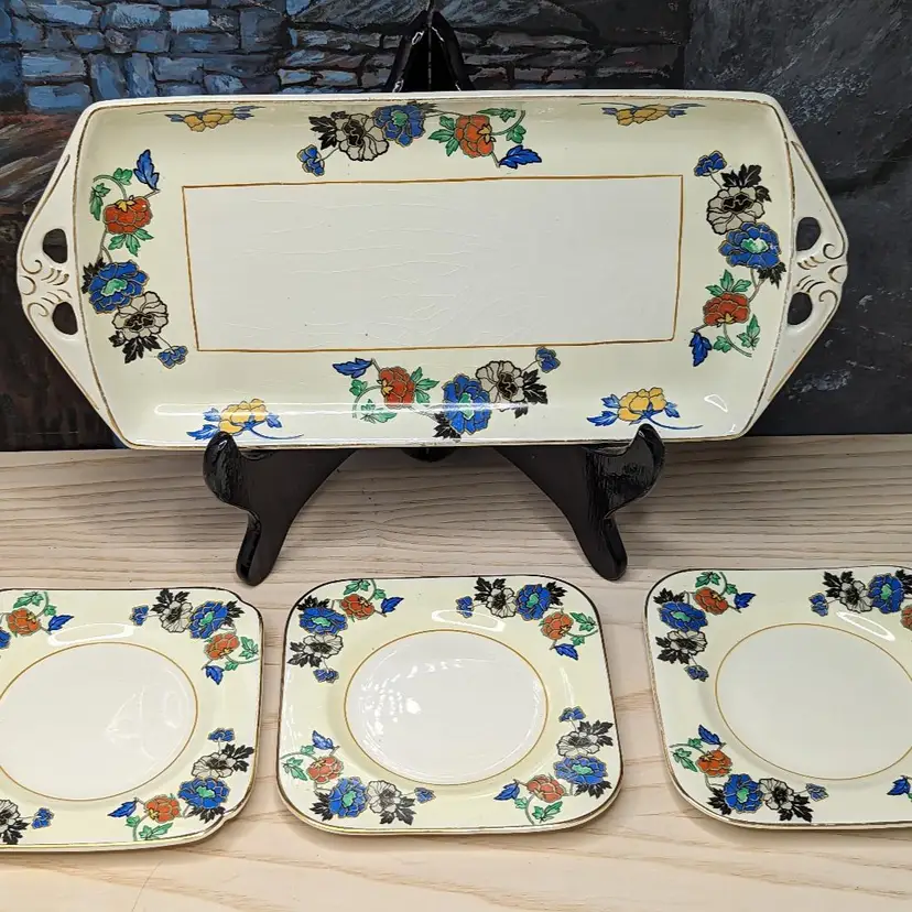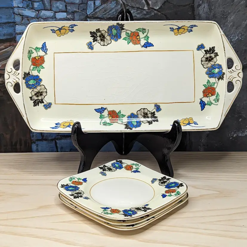 Woods Ivory Ware Burslem England 12.5" Tray 5" 3 Dessert Plates Set Blue Flowers. Perect for tea Party. Very good condition There are no chips or cracks except one plate has a chip on the under side of the rim. They do have crazing with age. please check the photos for details.
