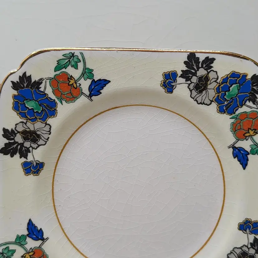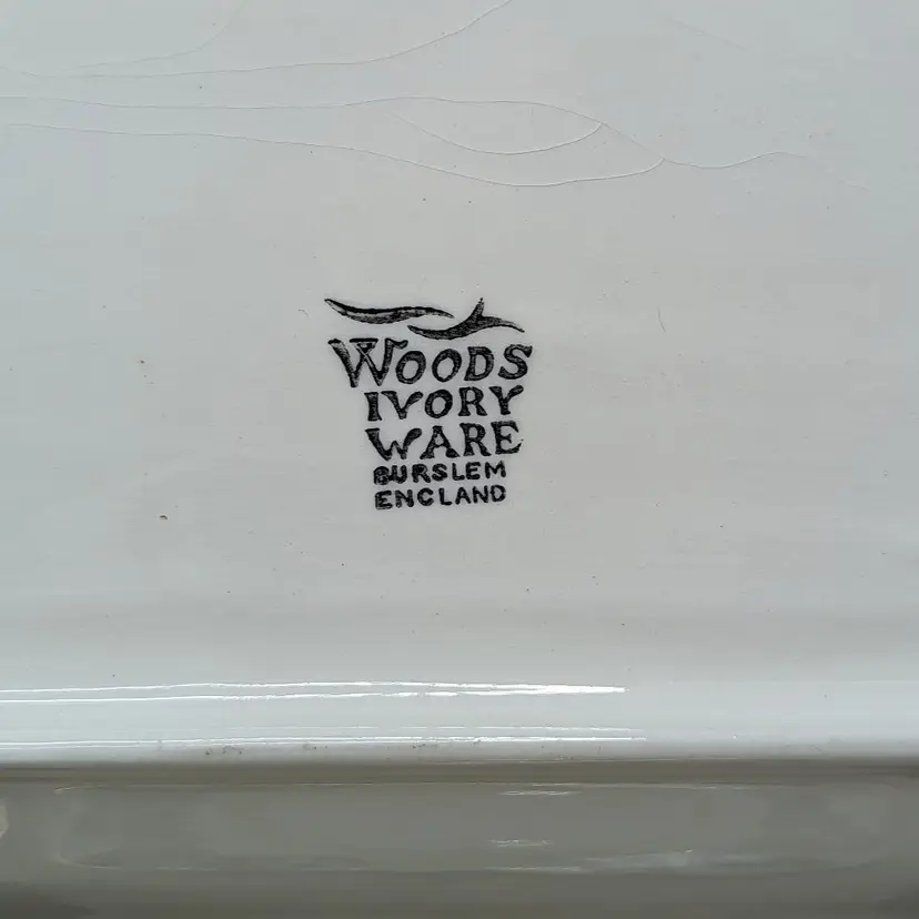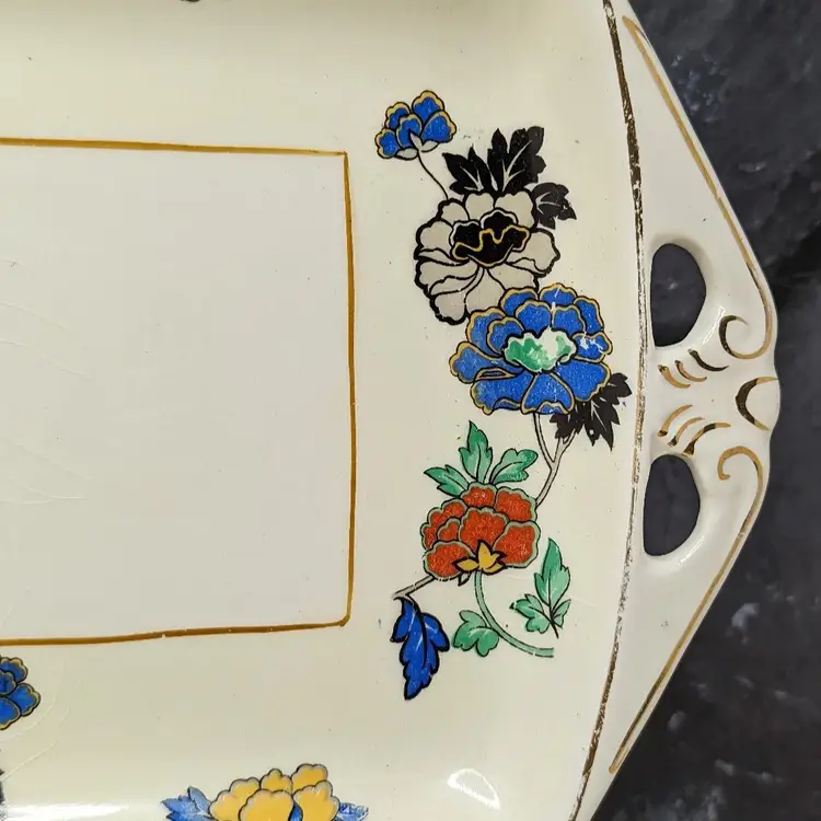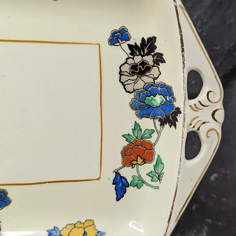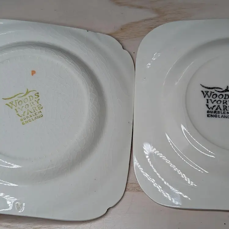 Woods Ivory Ware Burslem England 12.5" Tray 5" 3 Dessert Plates Set Blue Flowers. Perect for tea Party. Very good condition There are no chips or cracks except one plate has a chip on the under side of the rim. They do have crazing with age. please check the photos for details.