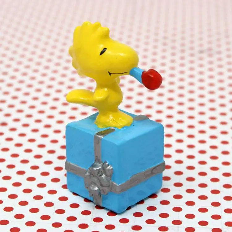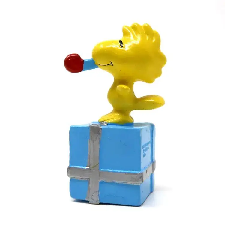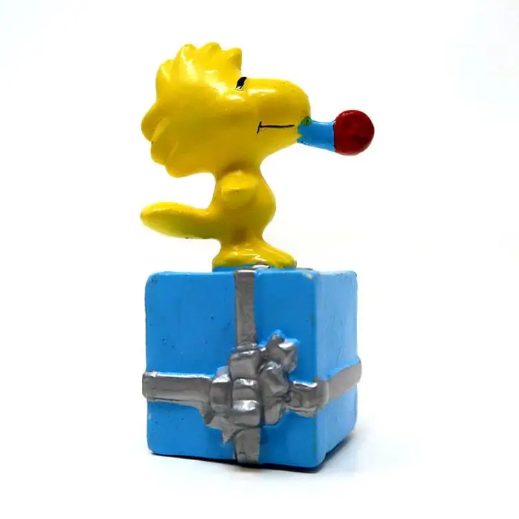 Celebrate in style with this charming Woodstock Birthday Figurine. Featuring Woodstock perched on a blue gift box with a party blower, this collectible is perfect for any Peanuts fan. Made of PVC and about 3" tall, it's a delightful addition to your Peanuts collection. Great for birthdays, a cake topper or just adding a touch of fun to your display!
