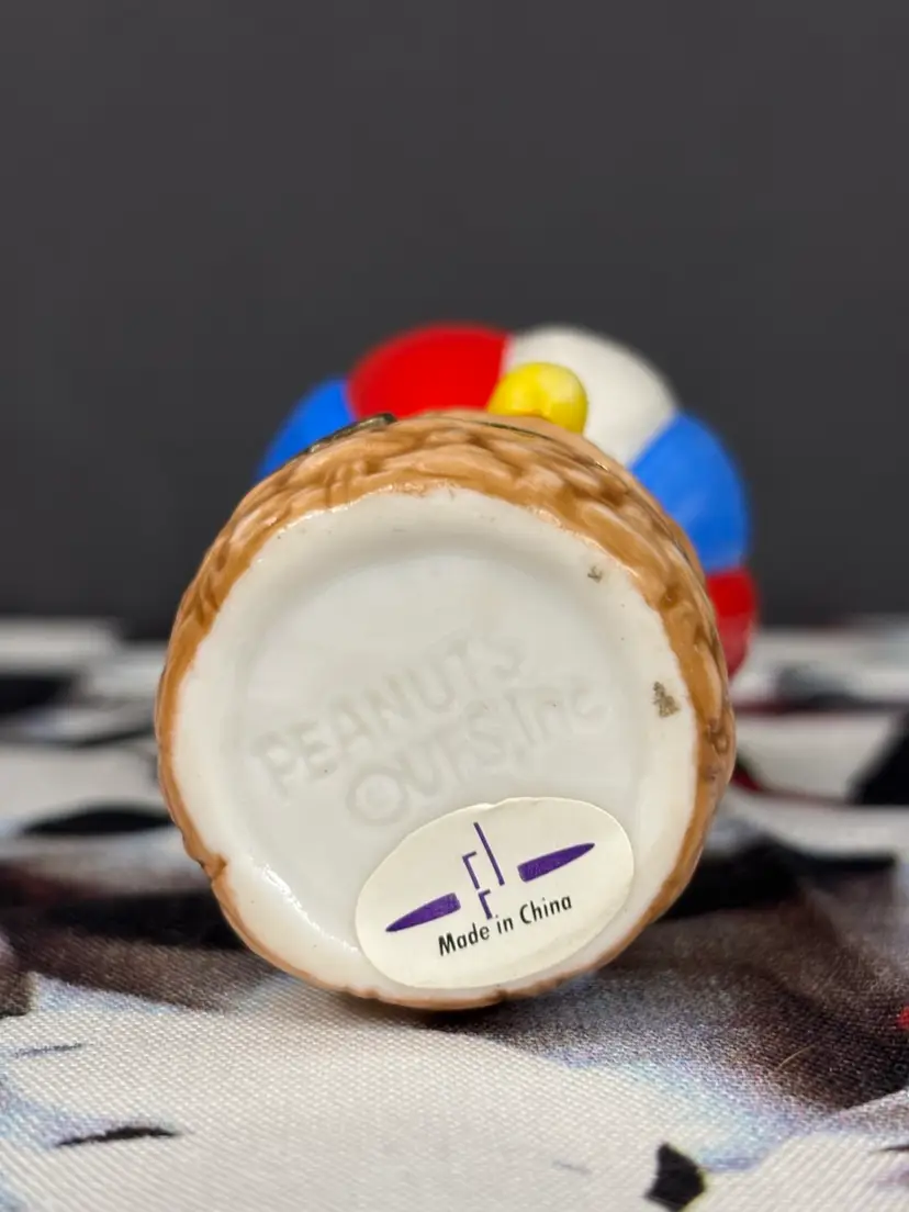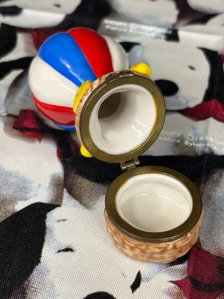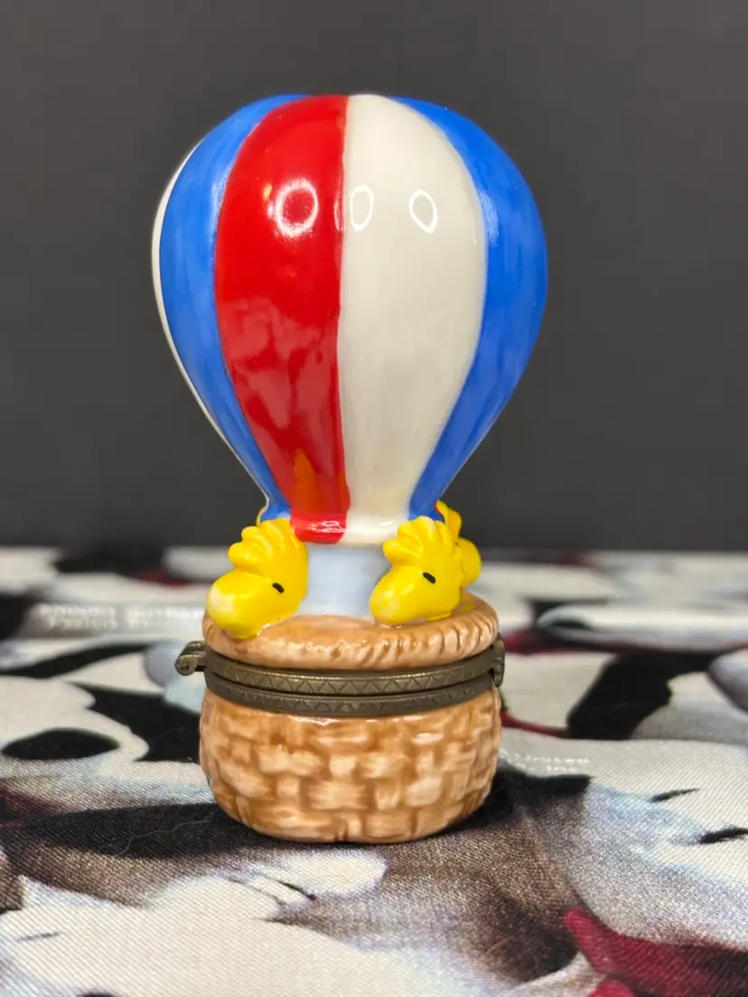 This is the cutest little figurine with Woodstock and friends riding in a hot air balloon. I ended up with two, so this one is looking for a new home. The hinge is loose, so it sometimes pops open when you pick it up. Otherwise, it is in very good condition with no chips or cracks. Add this fun figurine to your collection today!