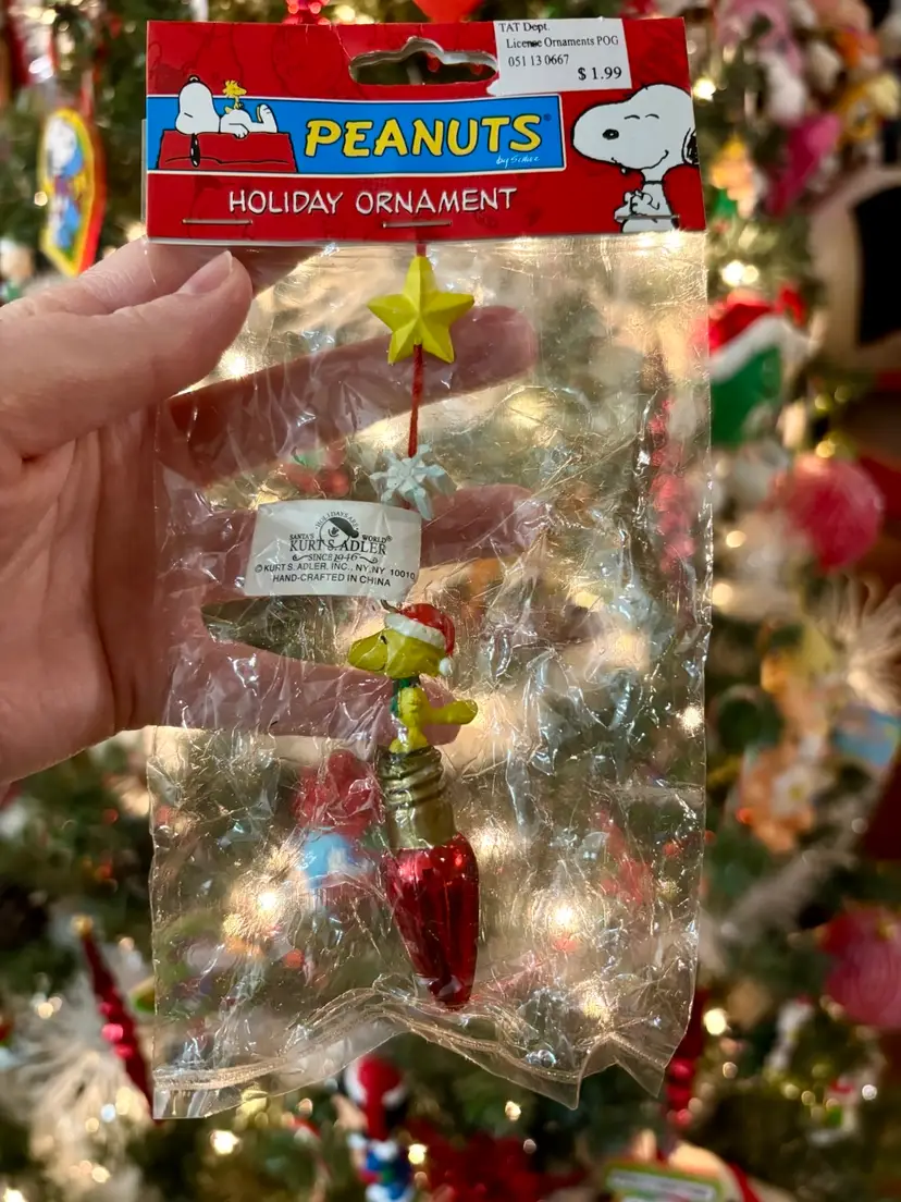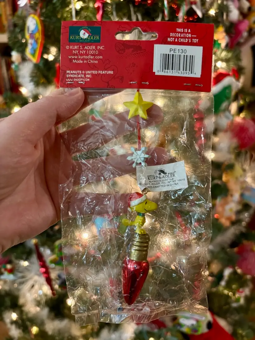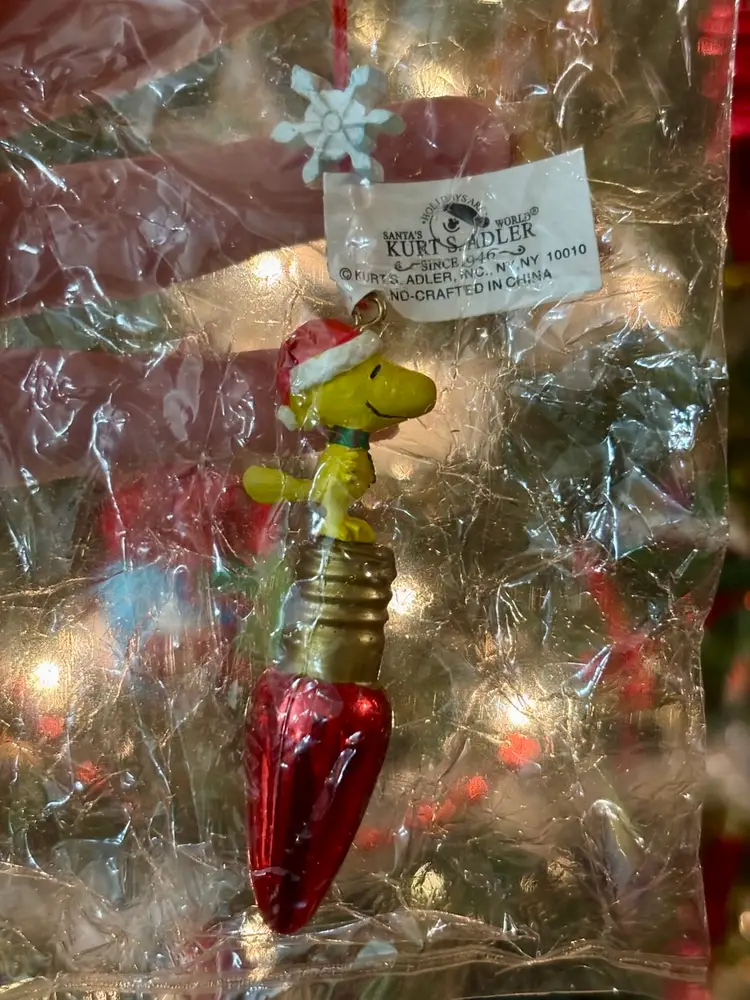This is a super cute Woodstock ornament from Kurt Adler. Woodstock is perched atop a red Christmas light bulb. New in package.