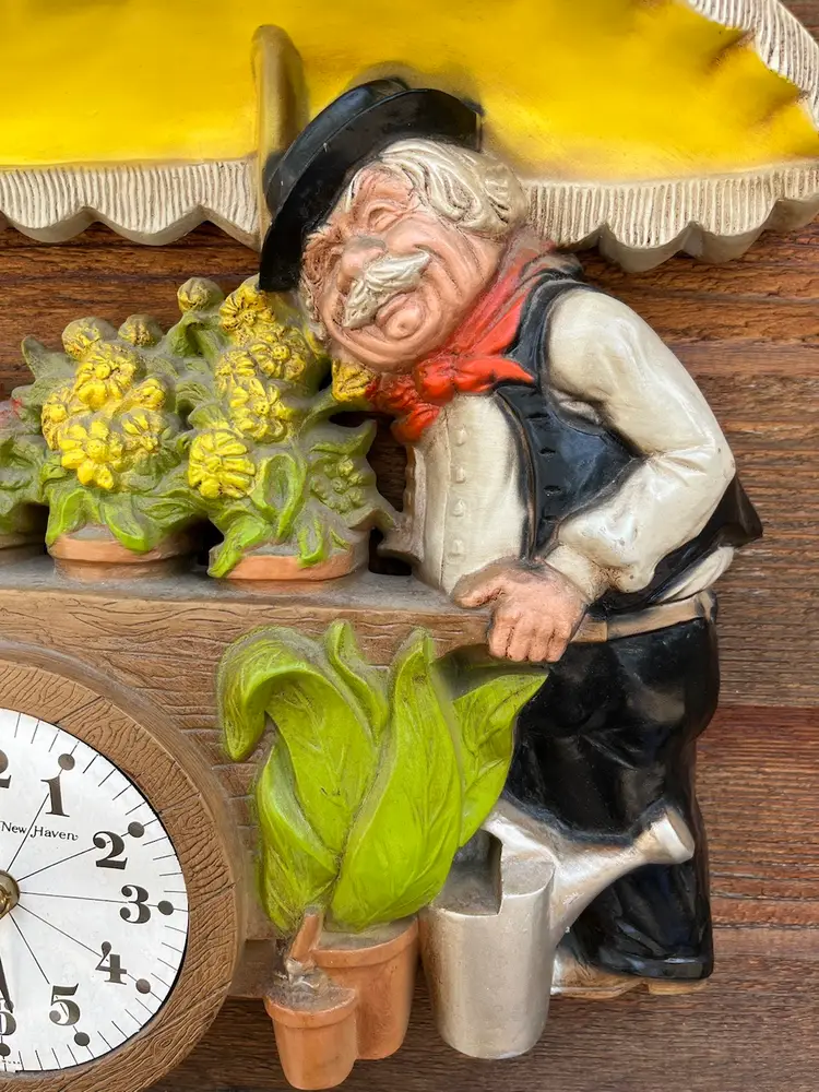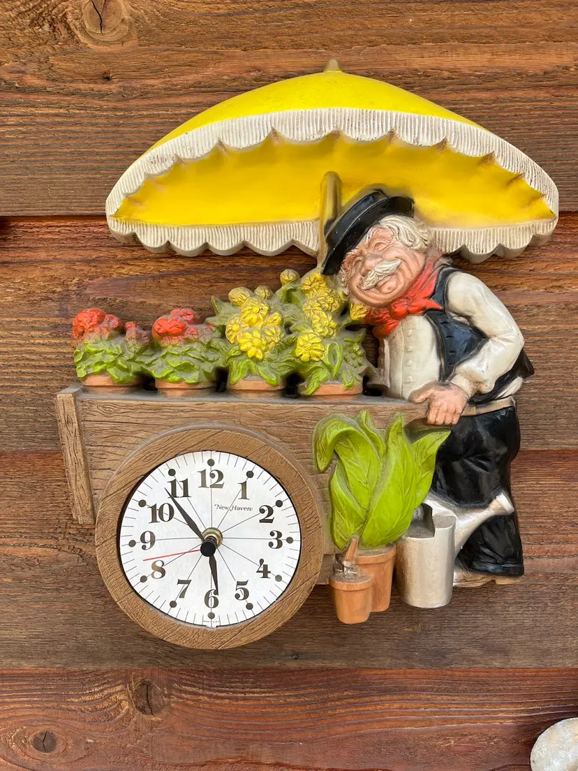 New Haven, 15”x13”, made in USA. Burwood plastic wall decor clock. Old man flowers cartfall peddler quartz battery powered. Works but missing clock face cover retro and good colorful condition 30/shipping 15/venmo