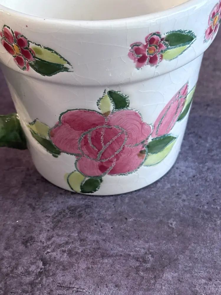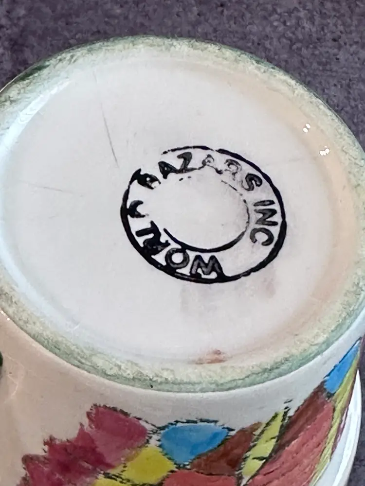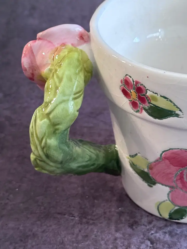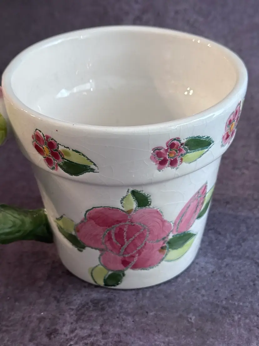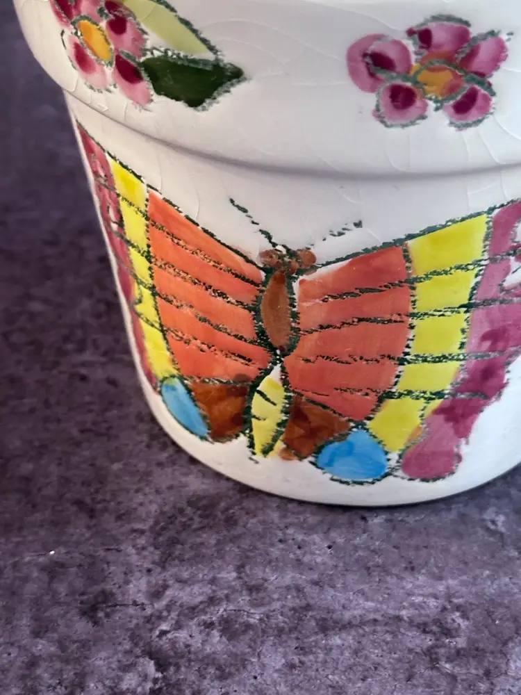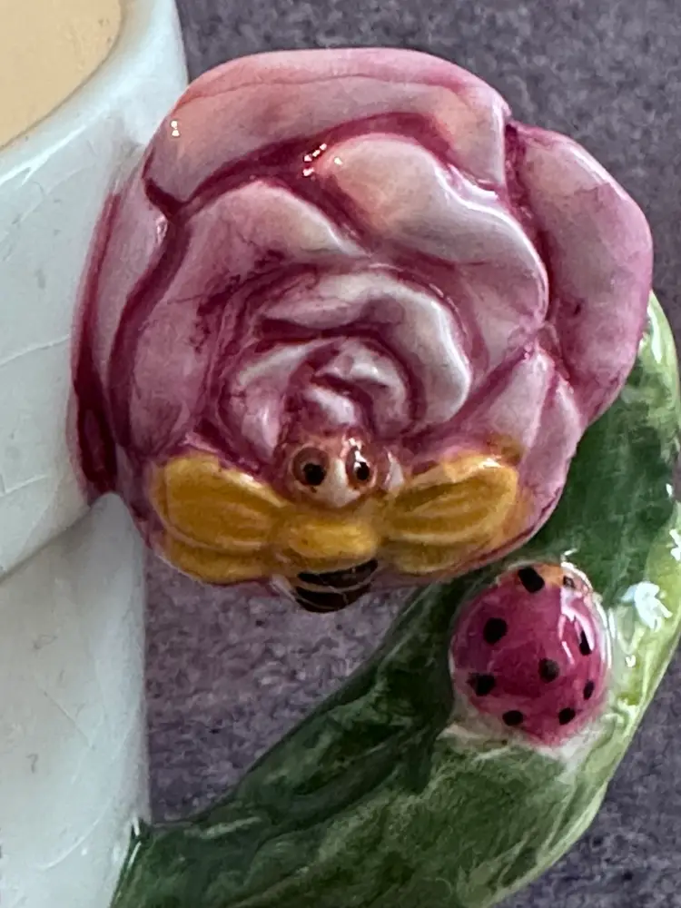 A very cute mug from world bizarre. Featuring butterflies, flowers, ladybugs, and bees on an ivory mug. There is some crazy but not a lot. No chips or cracks. Measures 3.75 inches tall and 4 inches wide across the top.