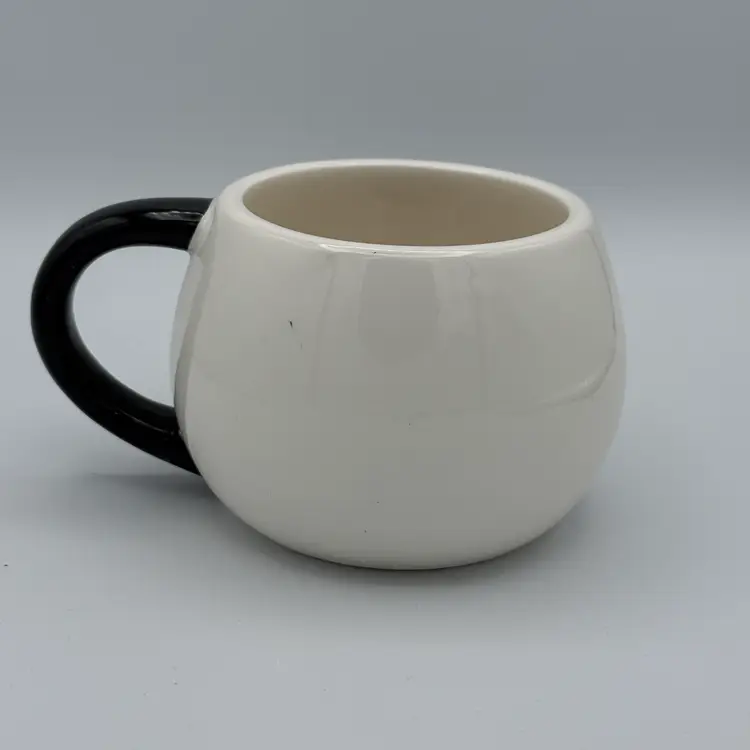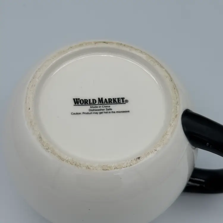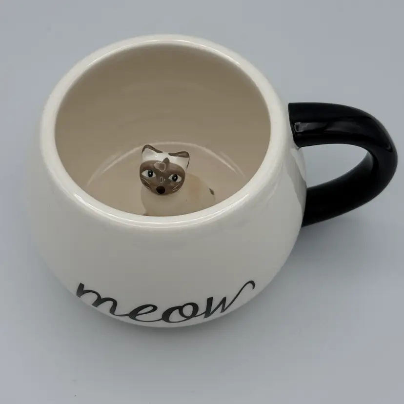 World Market "Meow" Coffee Mug. Ceramic/Earthenware Material. White With Black Handle and Black Text. Has a Small Kitten Figurine Inside the Cup. No Chips or Cracks.
