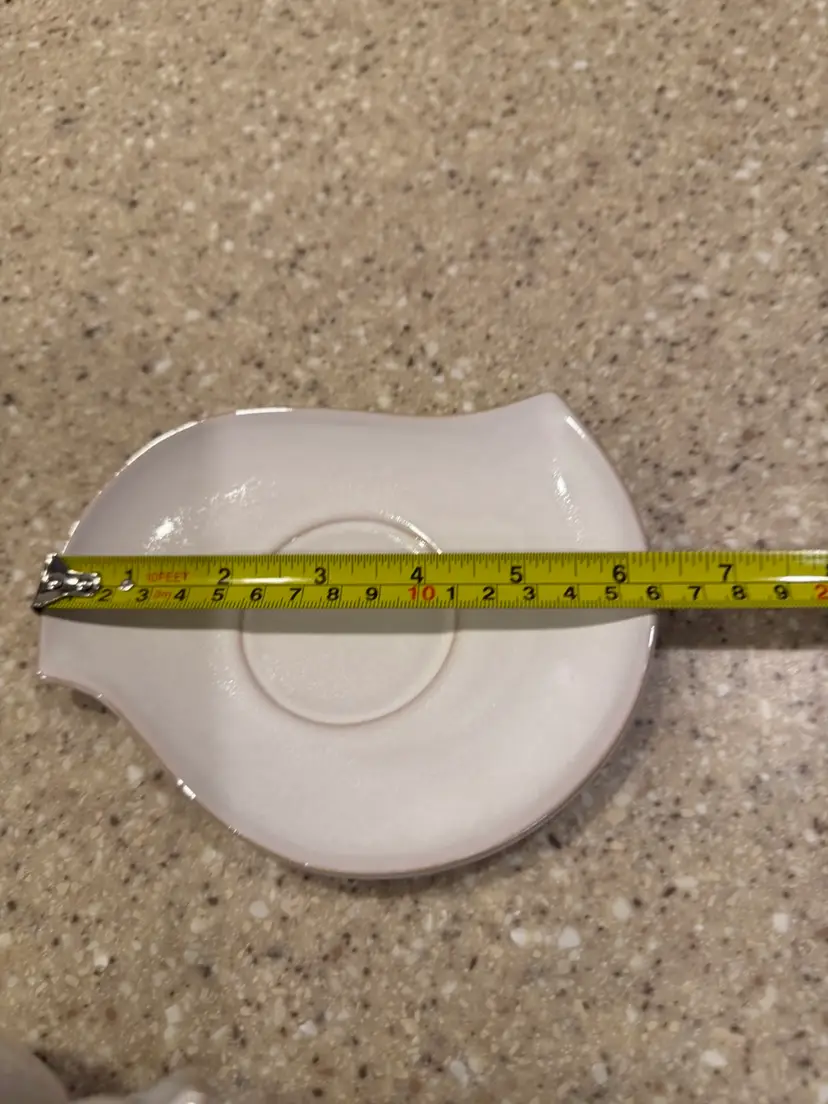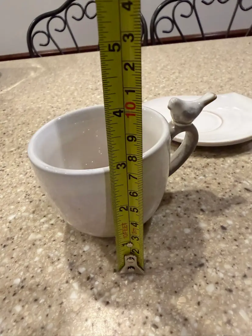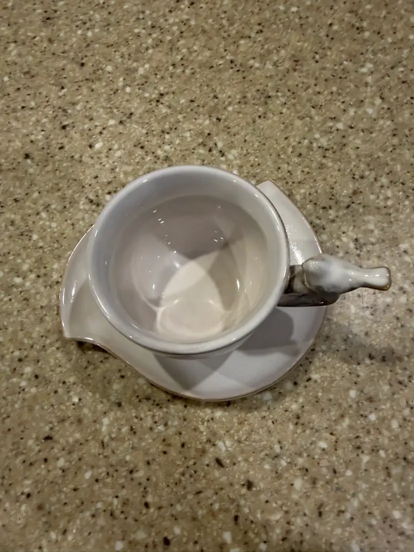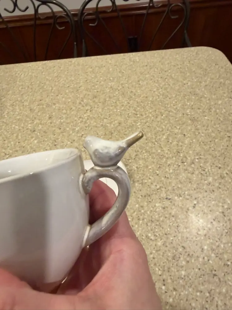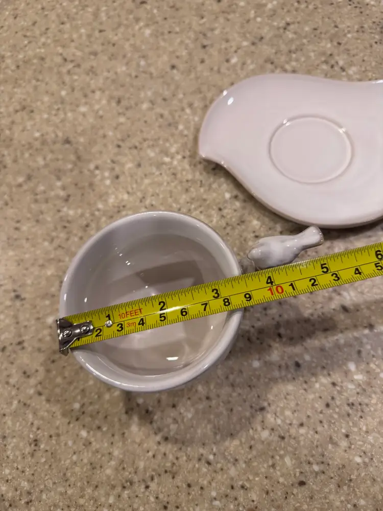 Discontinued, whimsical ceramic tickle with a bird on the handle and a cute saucer. In great condition.