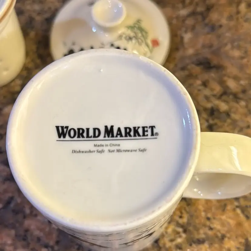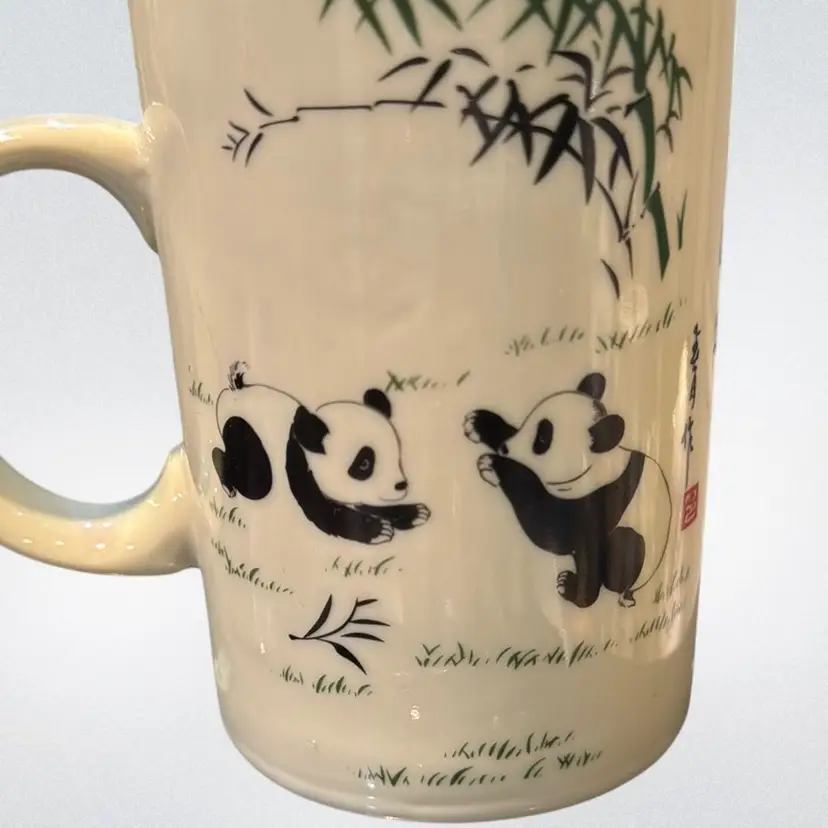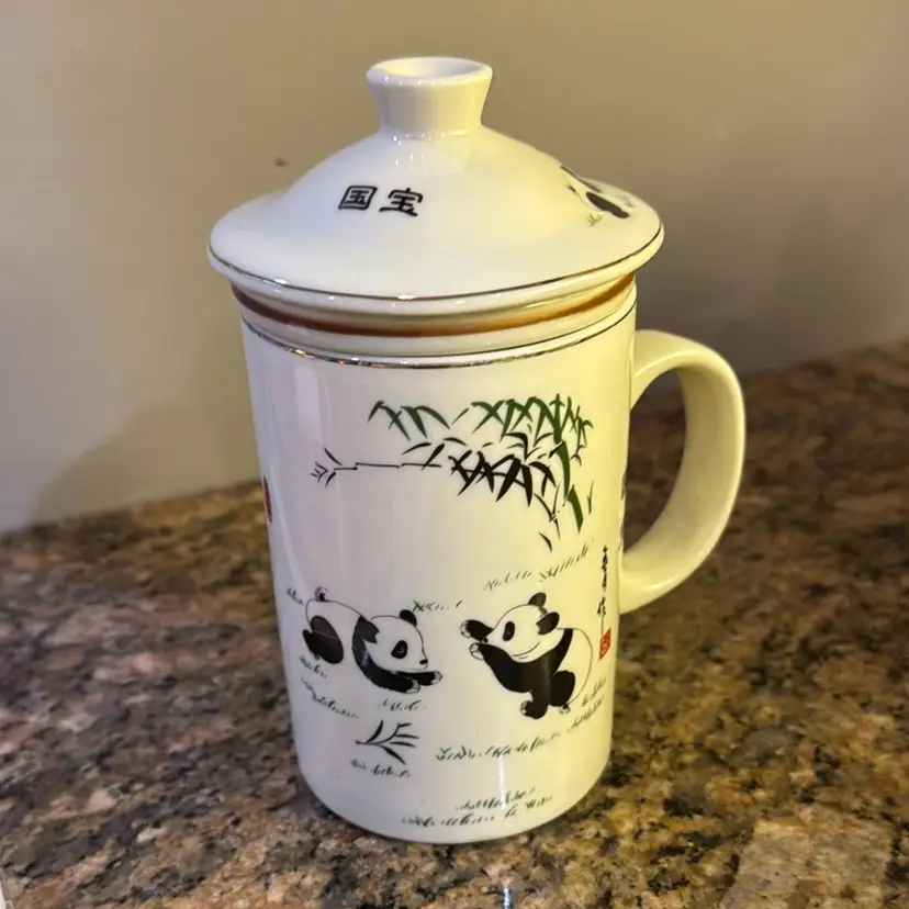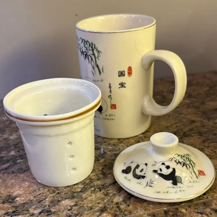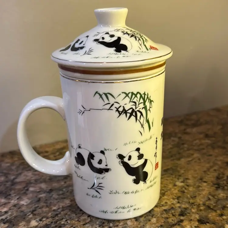 World Market three piece panda tea mug. Includes looseleaf, infuser and strainer and lid. No chips or cracks. Measures 6.25 inches tall.