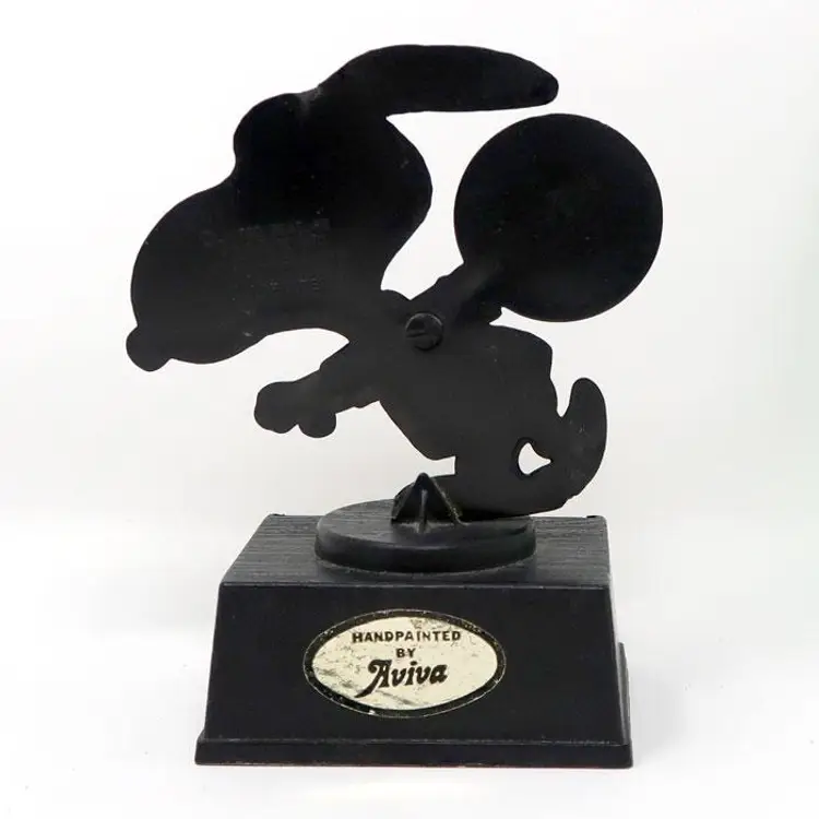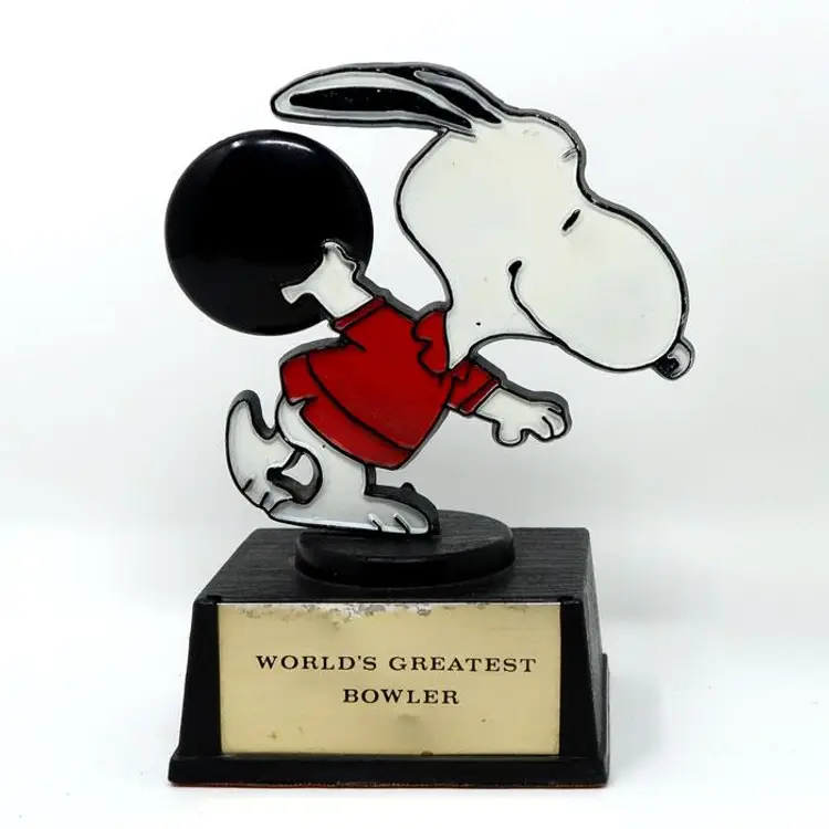Celebrate your love for Snoopy and bowling with this 'World's Greatest Bowler' trophy. Featuring Snoopy in his classic red shirt, this collectible is perfect for any Peanuts fan who enjoys a good game of bowling. A great addition to your Peanuts collection or a fun gift for a fellow fan. This Peanuts comic strip trophy was made by Aviva in the 1970s. It shows some discoloration on the plaque and some flecks of missing paint on Snoopy.