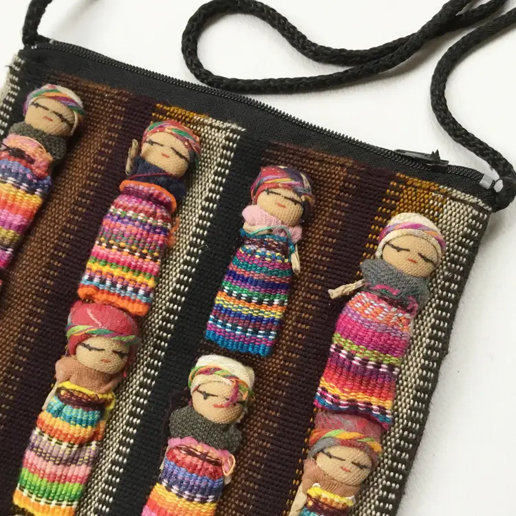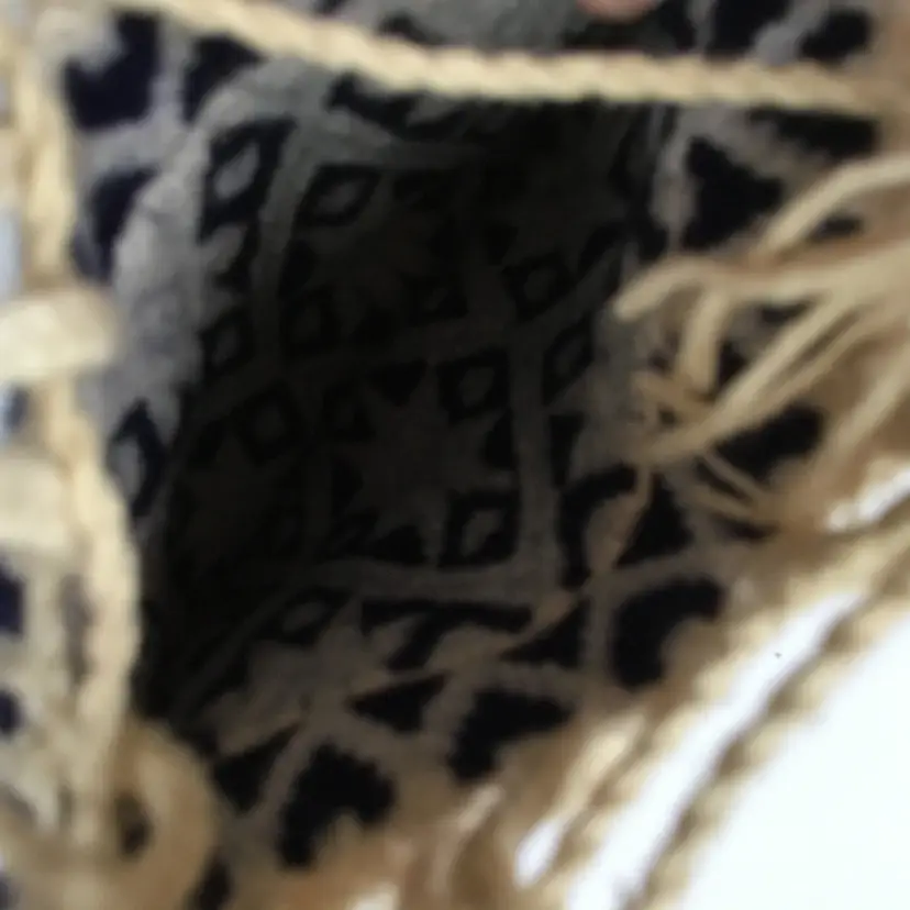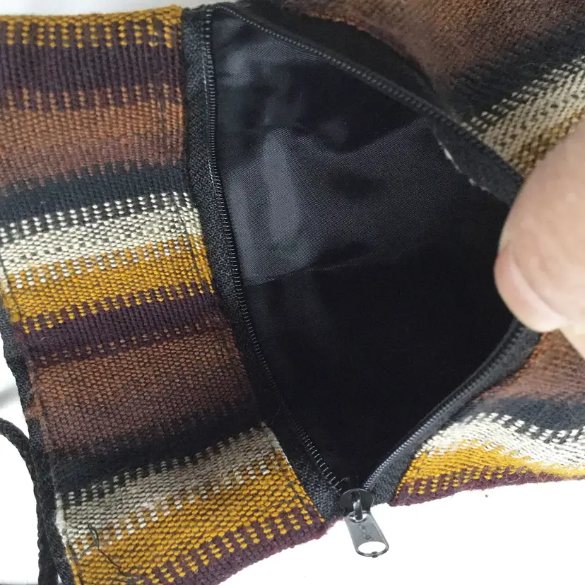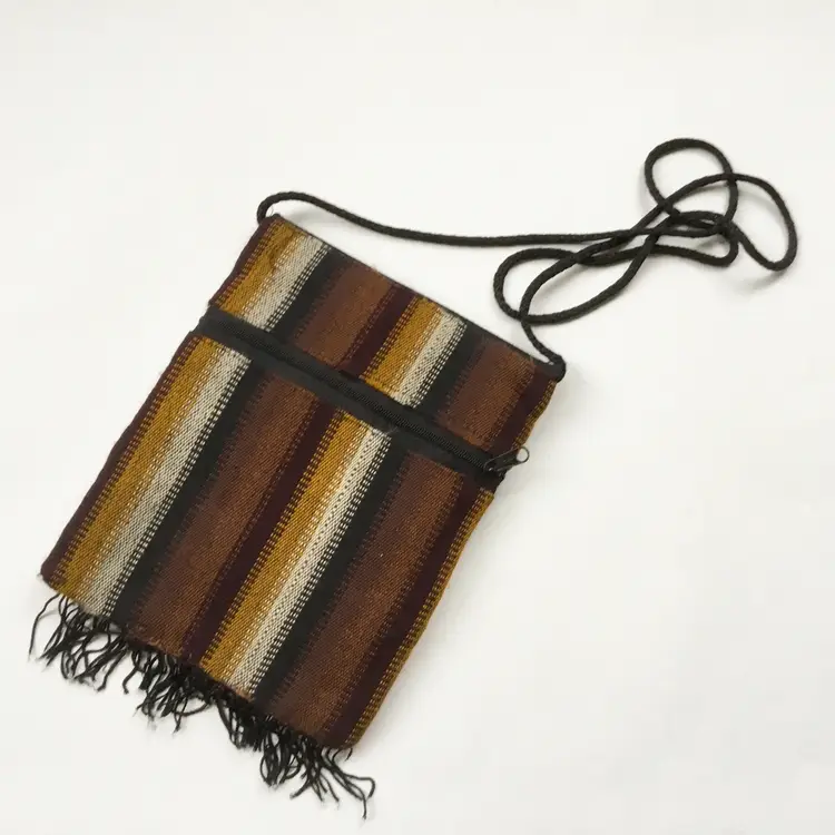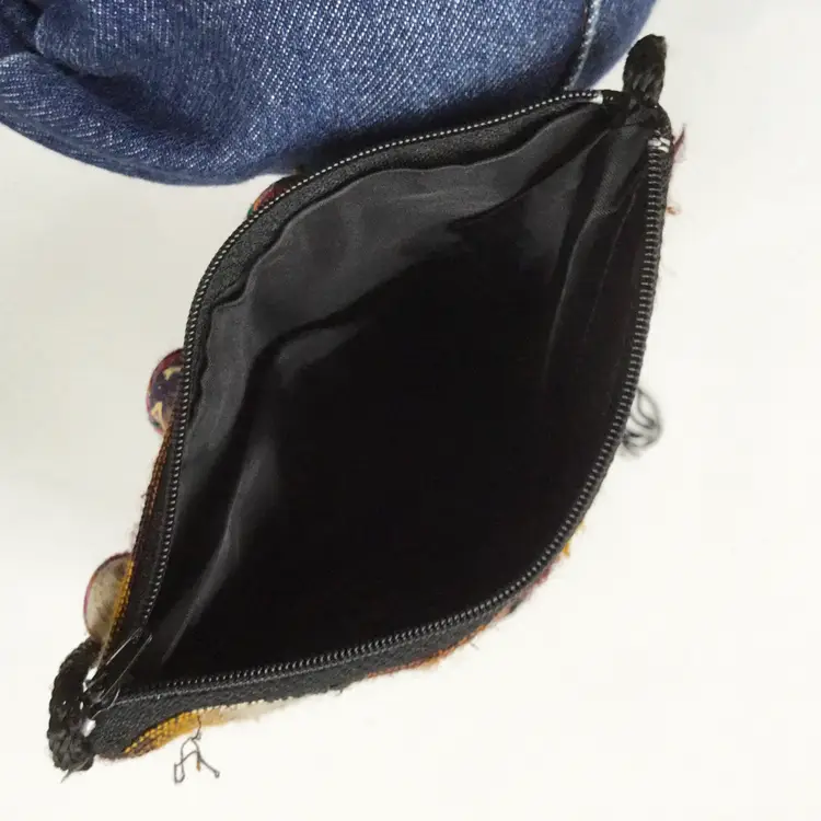 Features a main zipper compartment, a side zipper pocket and black fringe at the bottom.