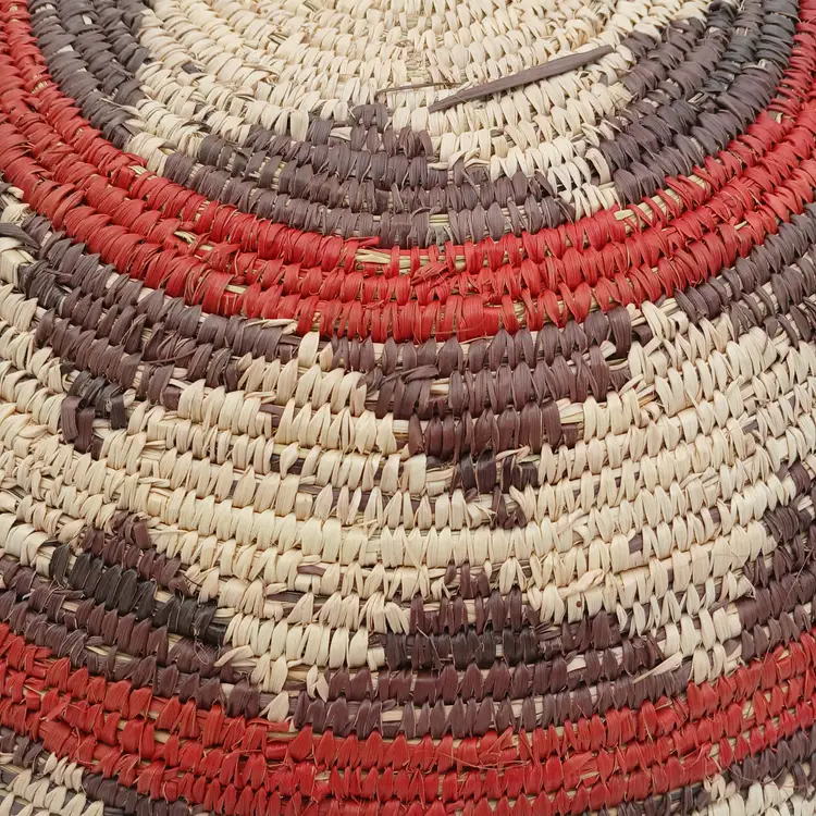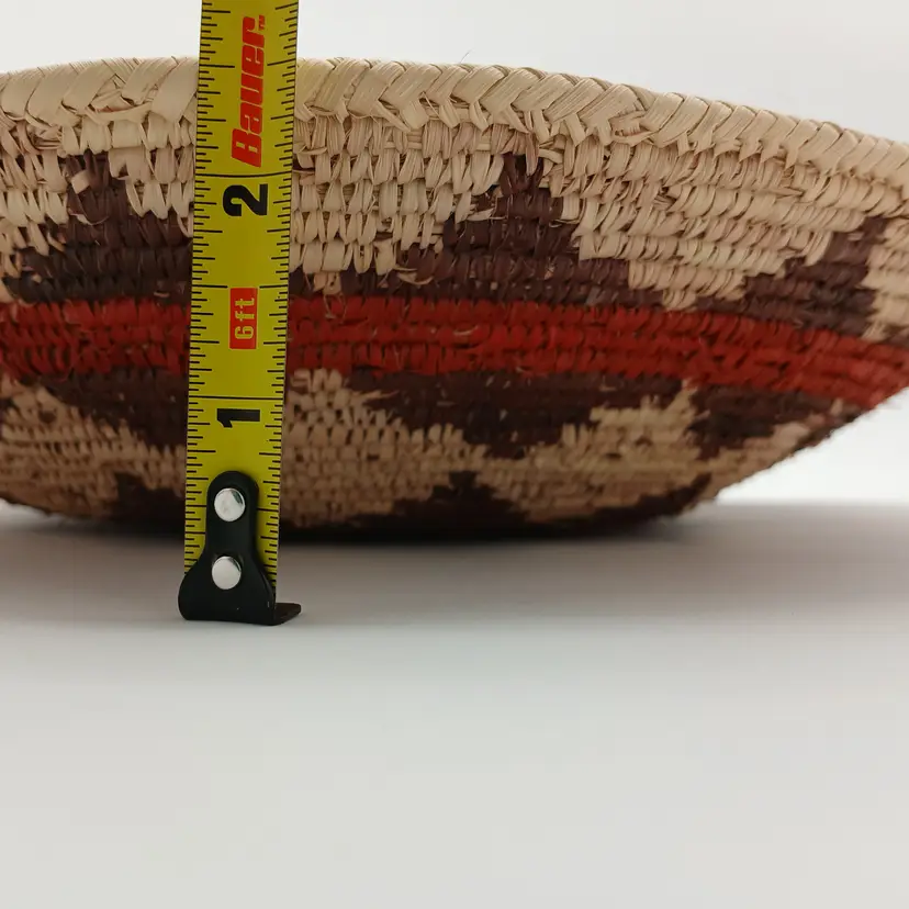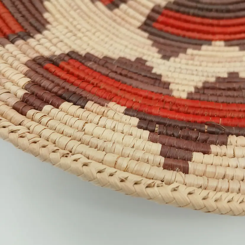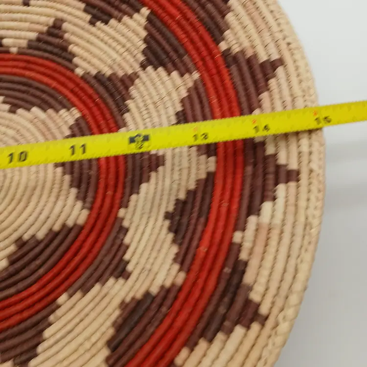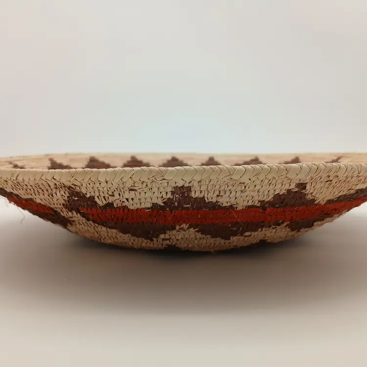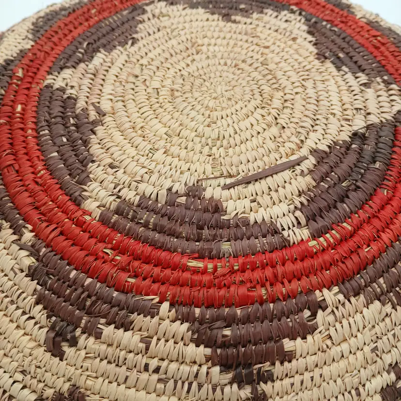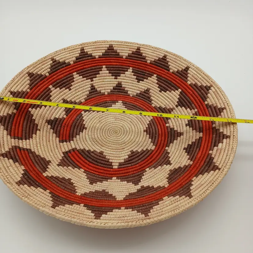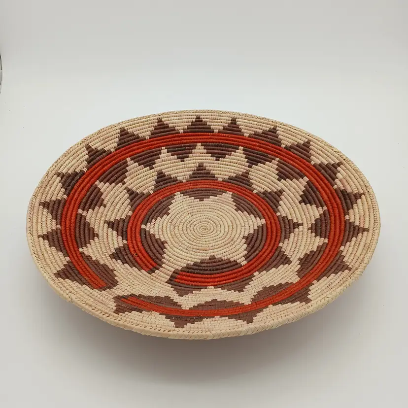 This basket is likely Pakistani or African in origin and is patterned after a Navajo Wedding Basket. This basket is NOT of Navajo or any Native American origin. It is, however, a beautiful woven basket about 15" in diameter and about 3" high. I have included photos of the outside of the basket here too. Please ask questions and see the photos.