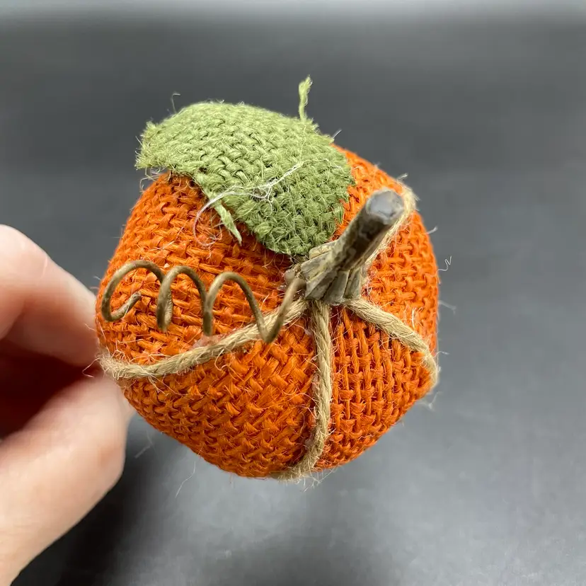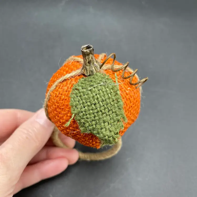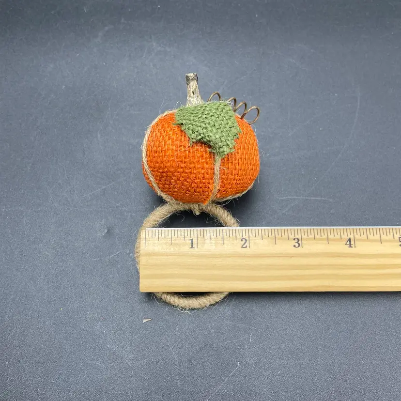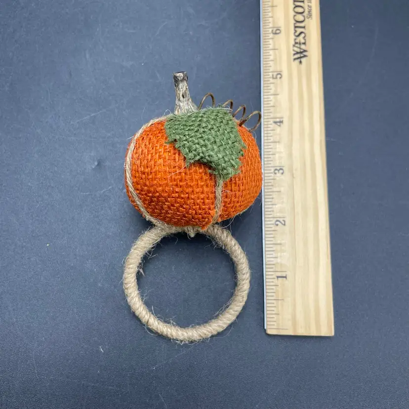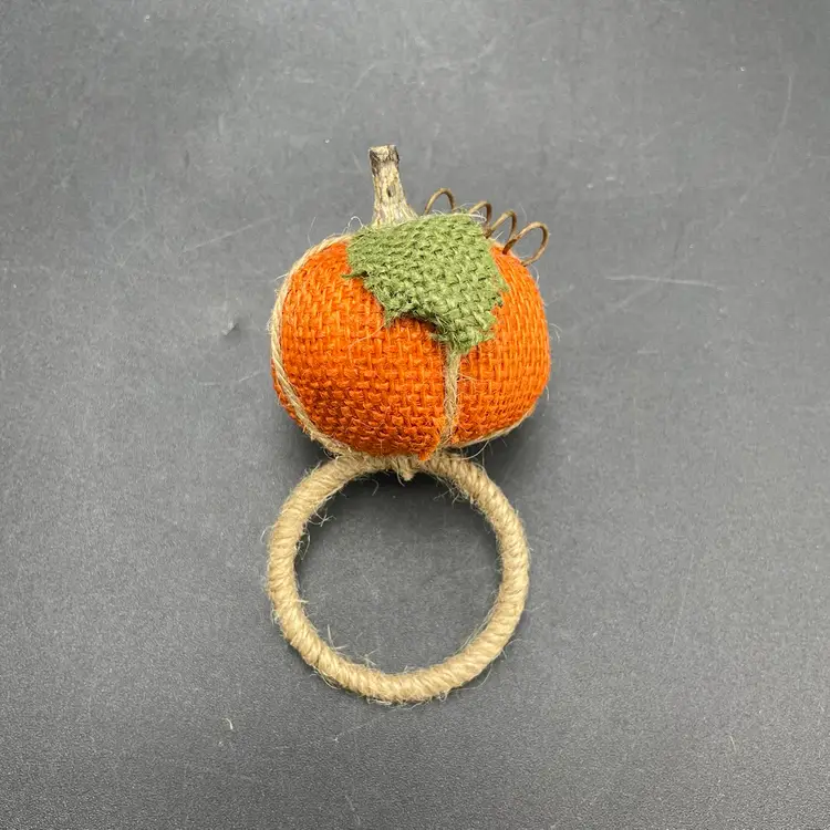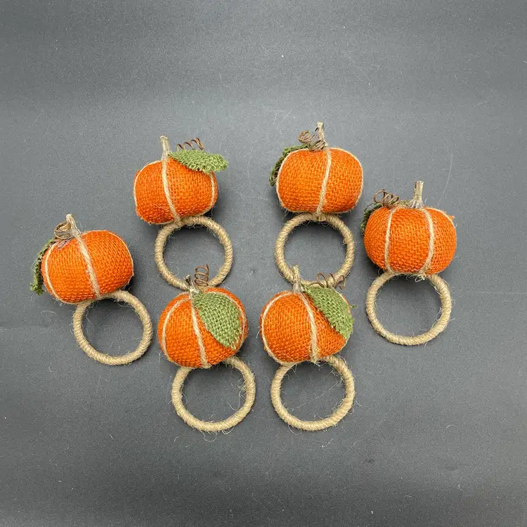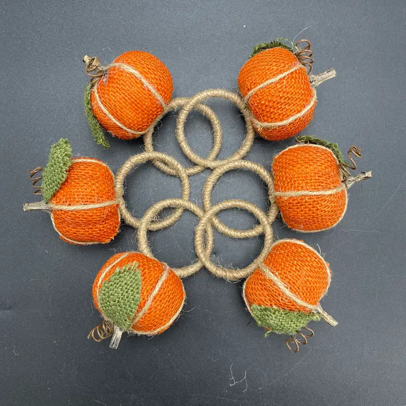 This is a set of 6 woven burlap pumpkin napkin rings. Each measure approximately 5" long x 2" across the ring. No major flaws. Smoke free home.