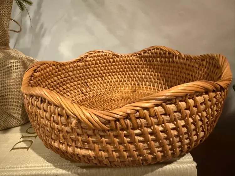 This beautifully handmade woven rattan fruit basket adds a touch of natural elegance to any kitchen or dining area. Perfect for displaying fresh fruits, vegetables, or even decorative items. Its sturdy construction and intricate wave-like design make it a unique and practical centerpiece. Excellent condition, ready to use in your home.