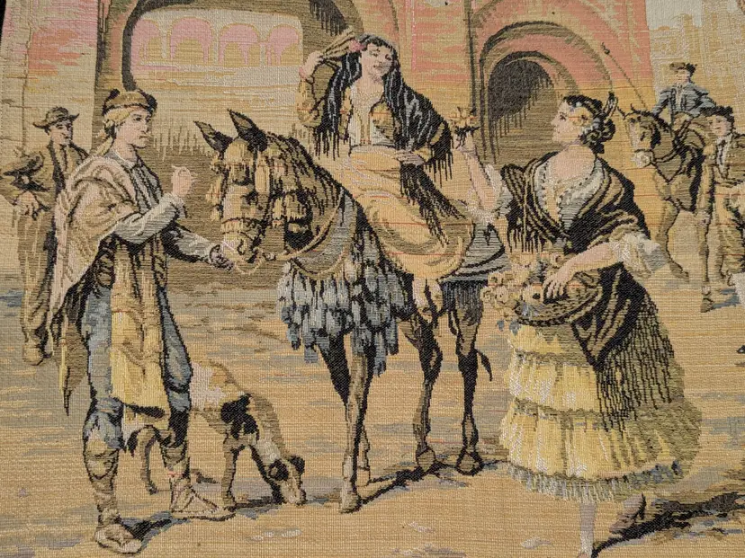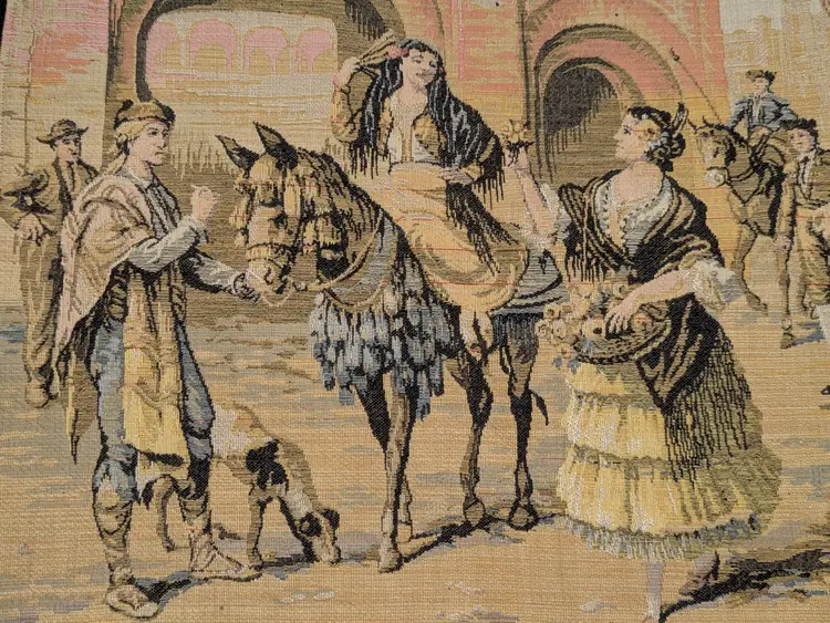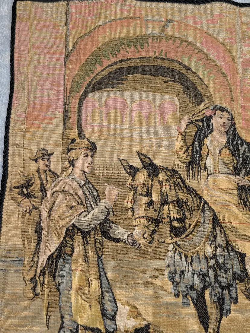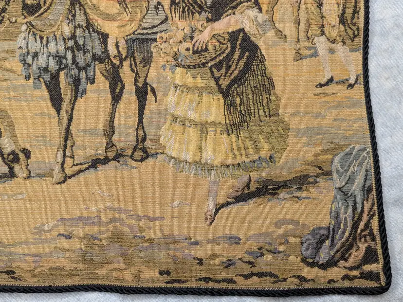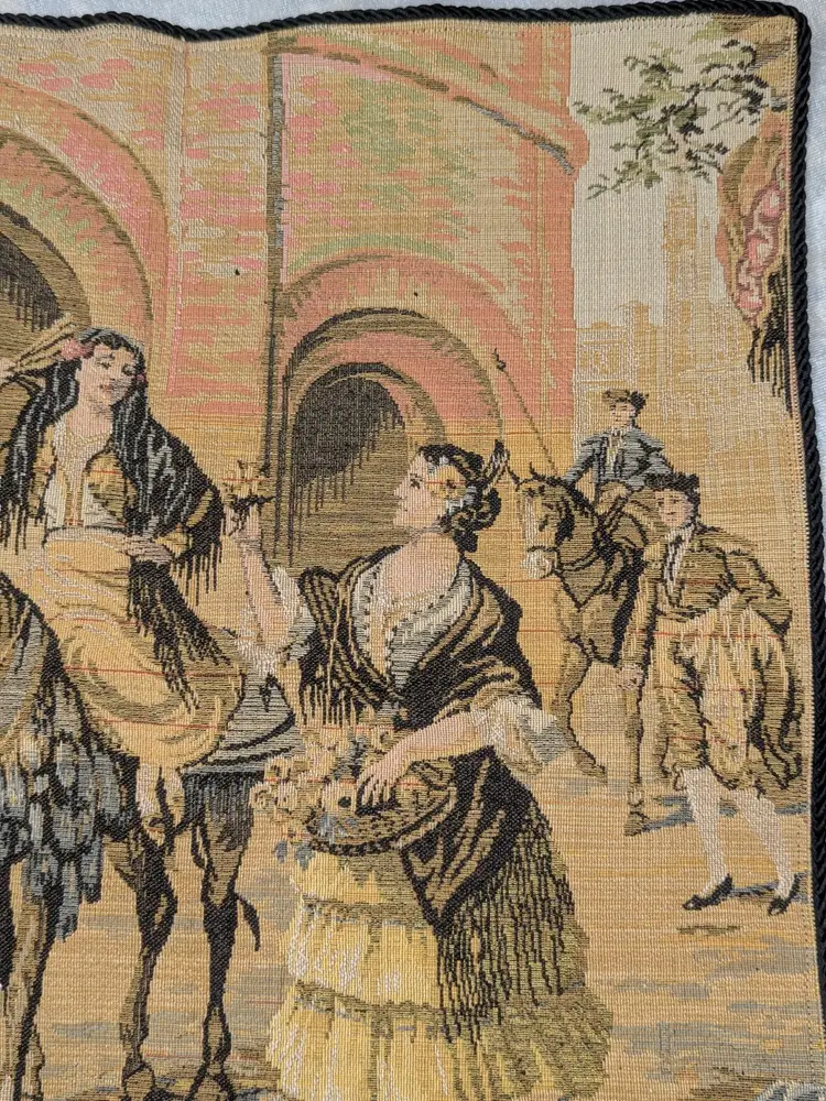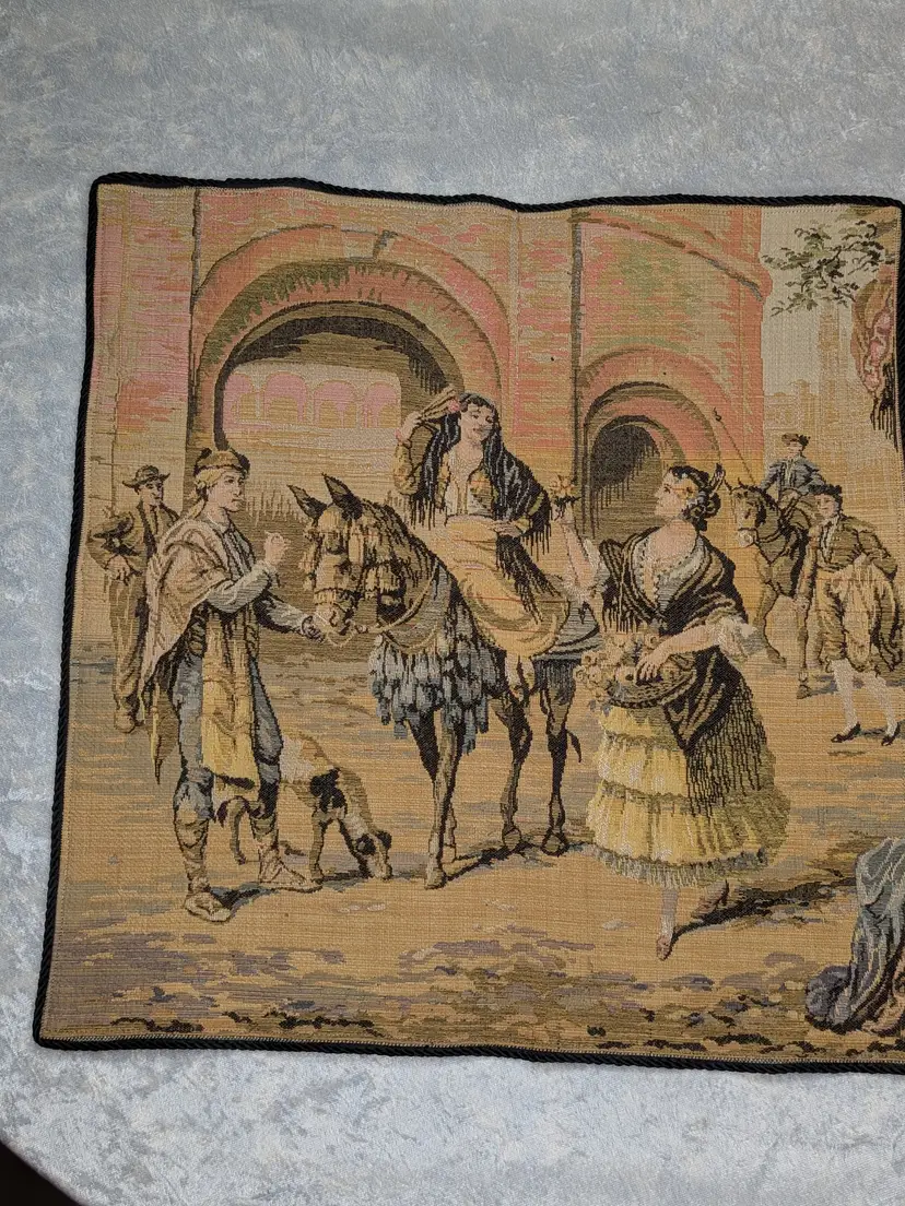 Woven Tapestry Spanish Street Scene Flamenco Dancers Horse Dog Made in Belgium 18"x18" Soldiers Vintage It has a braided trim along the edge and Bias tape along the edge of the back. Wall Decor or pillow or table mat. Perfect for Castle , Renaissance, old world decor Very good condition Can be hung on the wall or made into a pillow. There are no holes or wear. Please check the photos for details. Comes from a smoke free home.