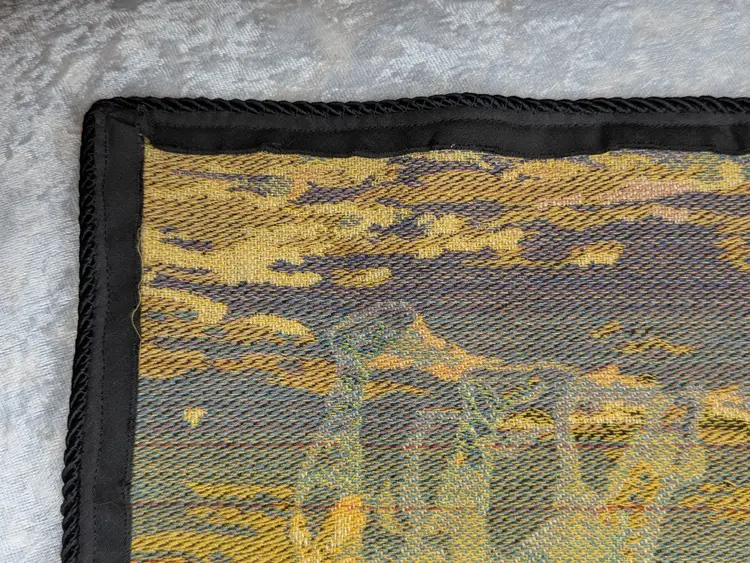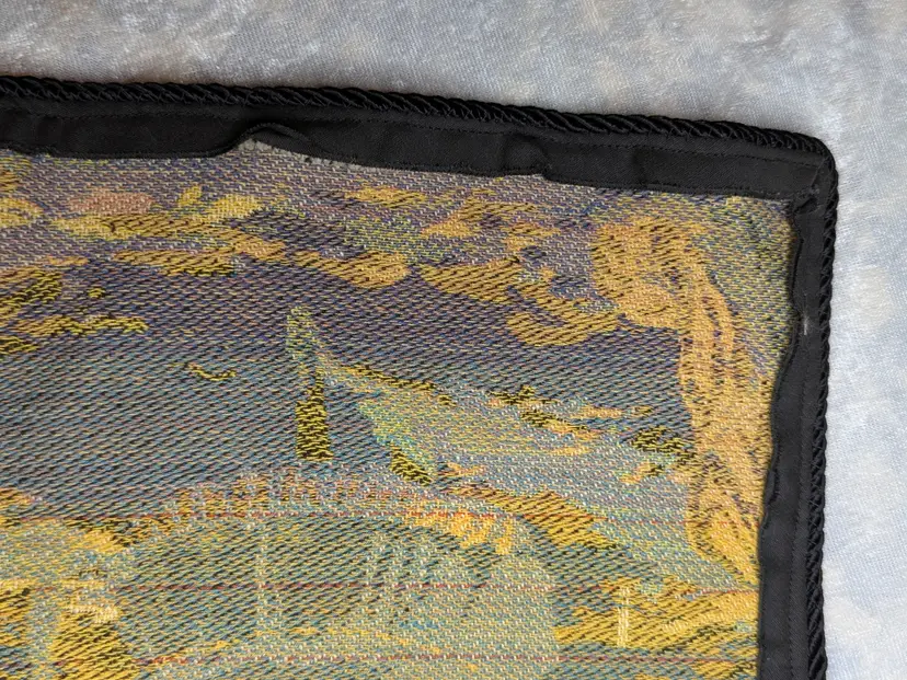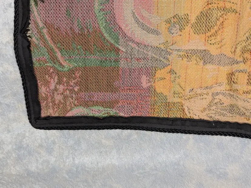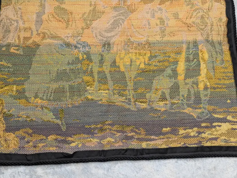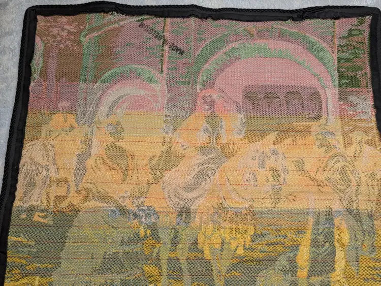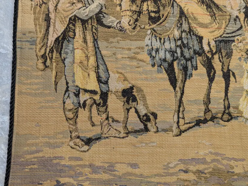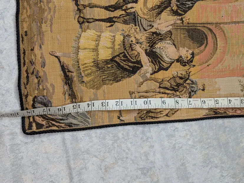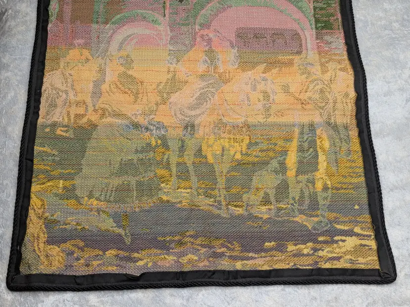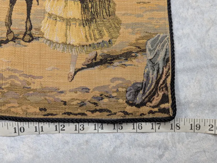 Woven Tapestry Spanish Street Scene Flamenco Dancers Horse Dog Made in Belgium 18"x18" Soldiers Vintage It has a braided trim along the edge and Bias tape along the edge of the back. Wall Decor or pillow or table mat. Perfect for Castle , Renaissance, old world decor Very good condition Can be hung on the wall or made into a pillow. There are no holes or wear. Please check the photos for details. Comes from a smoke free home.