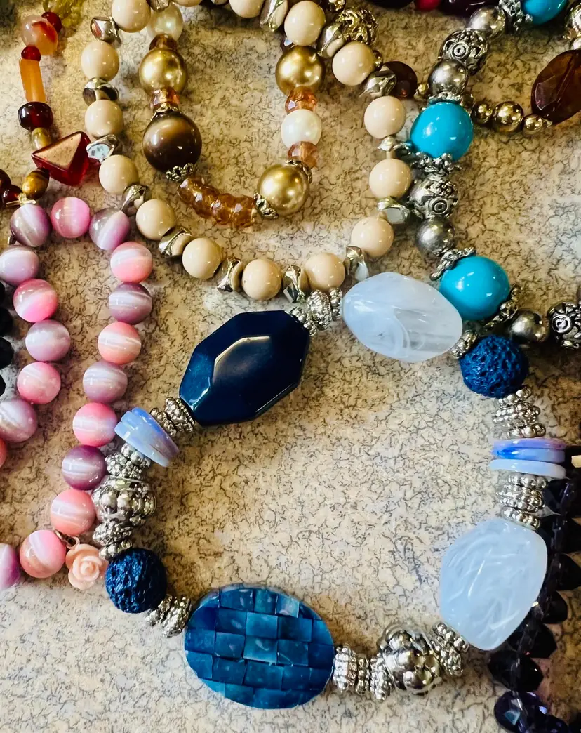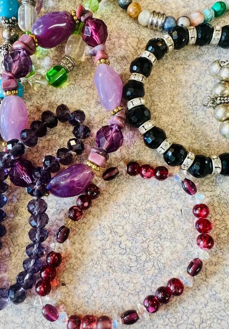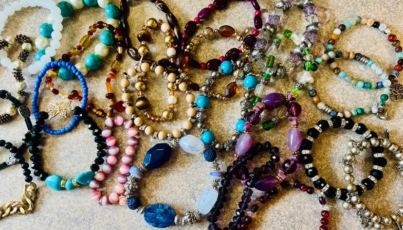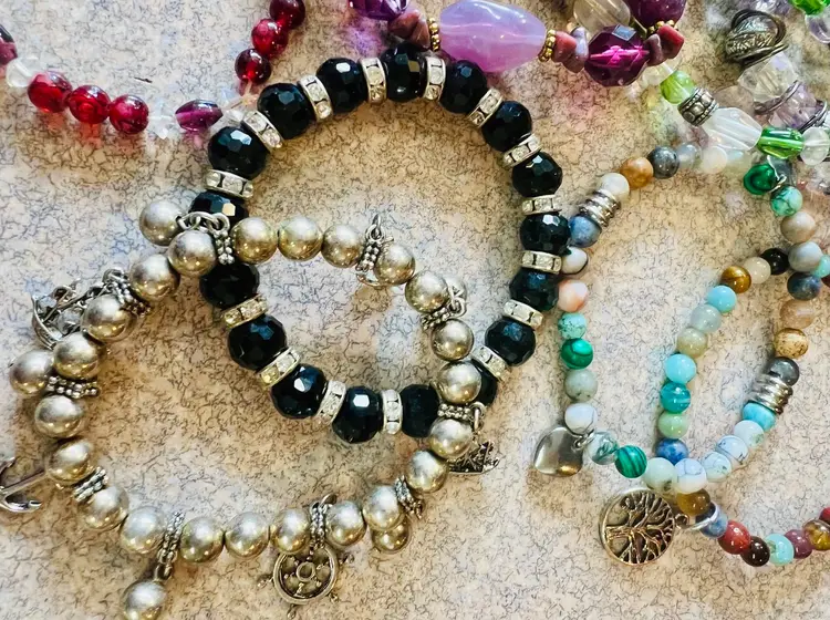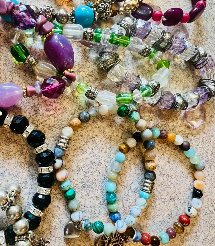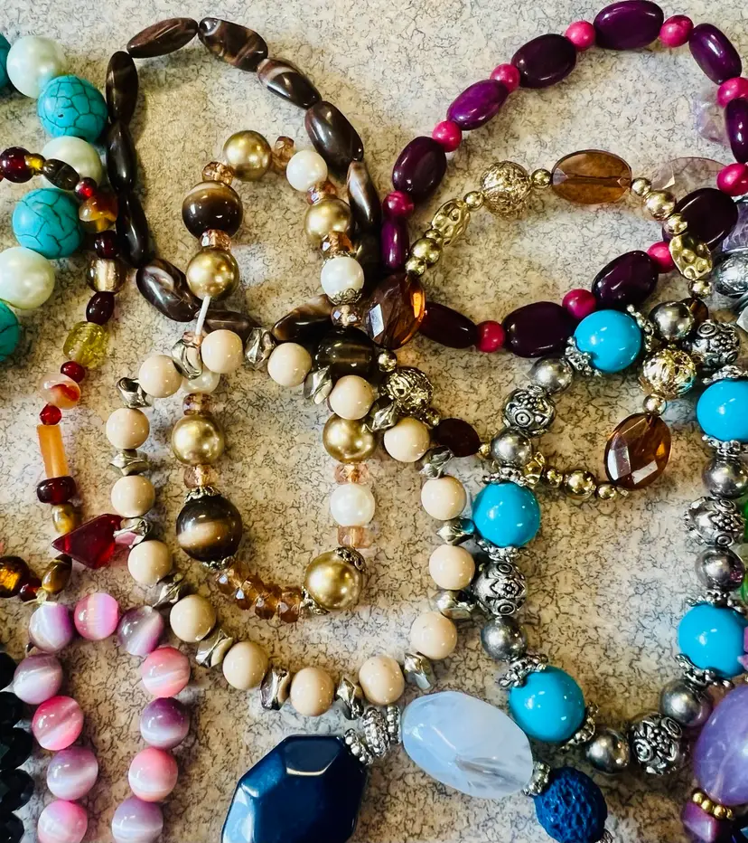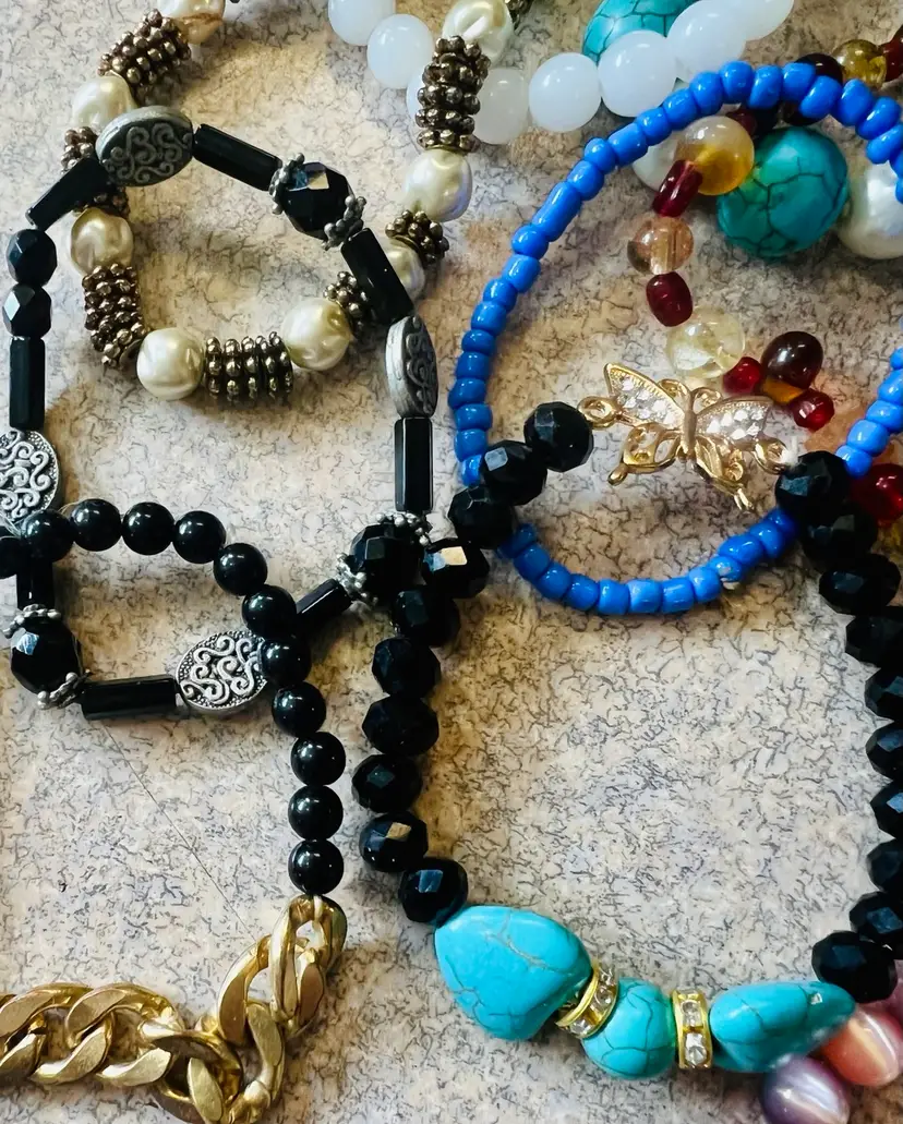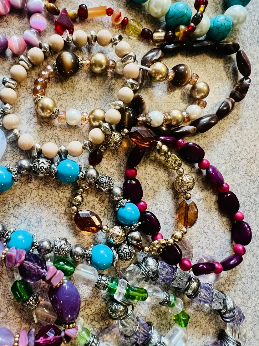 Great lot of wearable stretch bracelets. Also a great lot for jewelry artists! Real stone, glass, crystal or more! Some cute charms too!