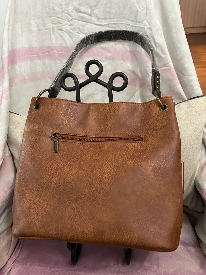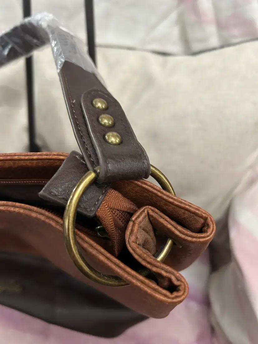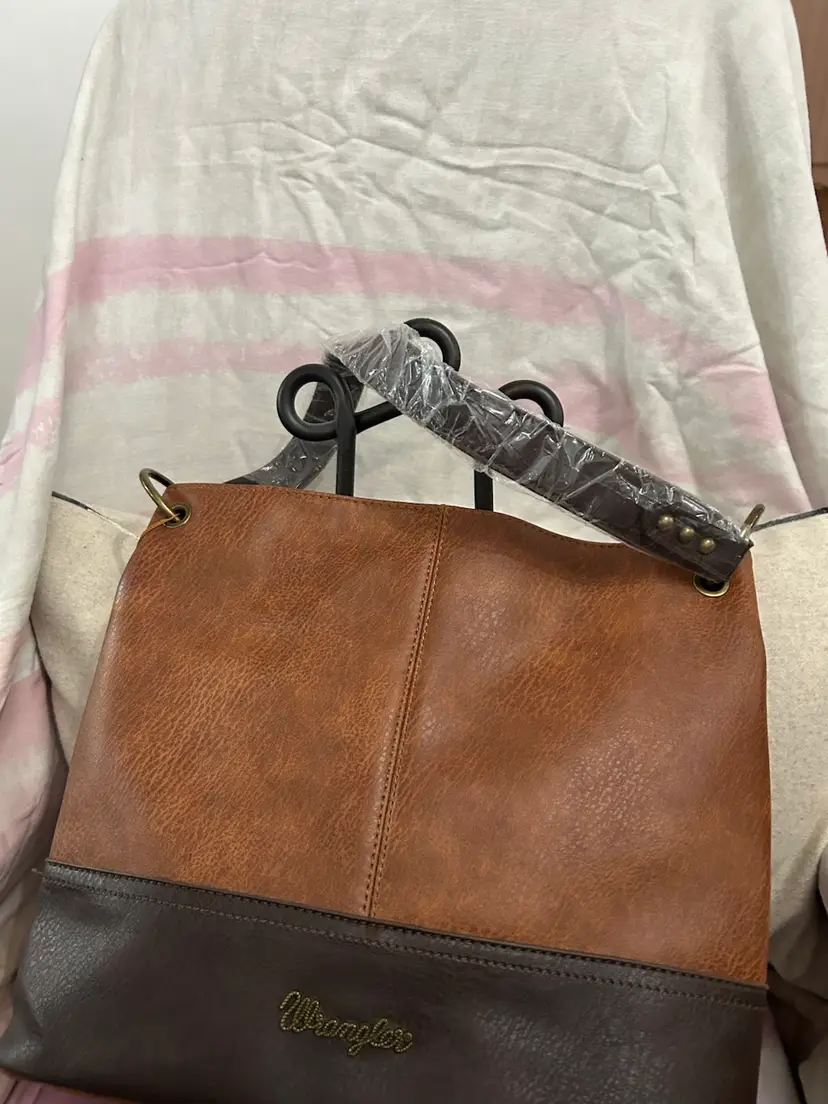 Wrangler Montana West hobo bag brown and dark brown vegan leather Still has tags… new never used Great bag to carry more than basics so you are prepared while stylish Measures appropriately 12.5 “ x 11.5”