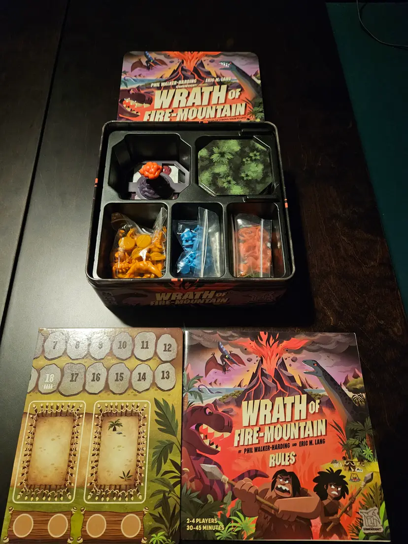 Contains: 44 Cave people 16 Dinosaurs 16 Base rings 1 Volcano Base 16 Dinosaur cards 3 Volcano Map Tiles 15 Map Tiles 1 Board 4 Reference Cards 1 Rules of Play