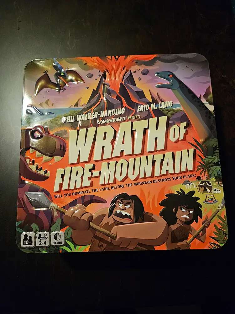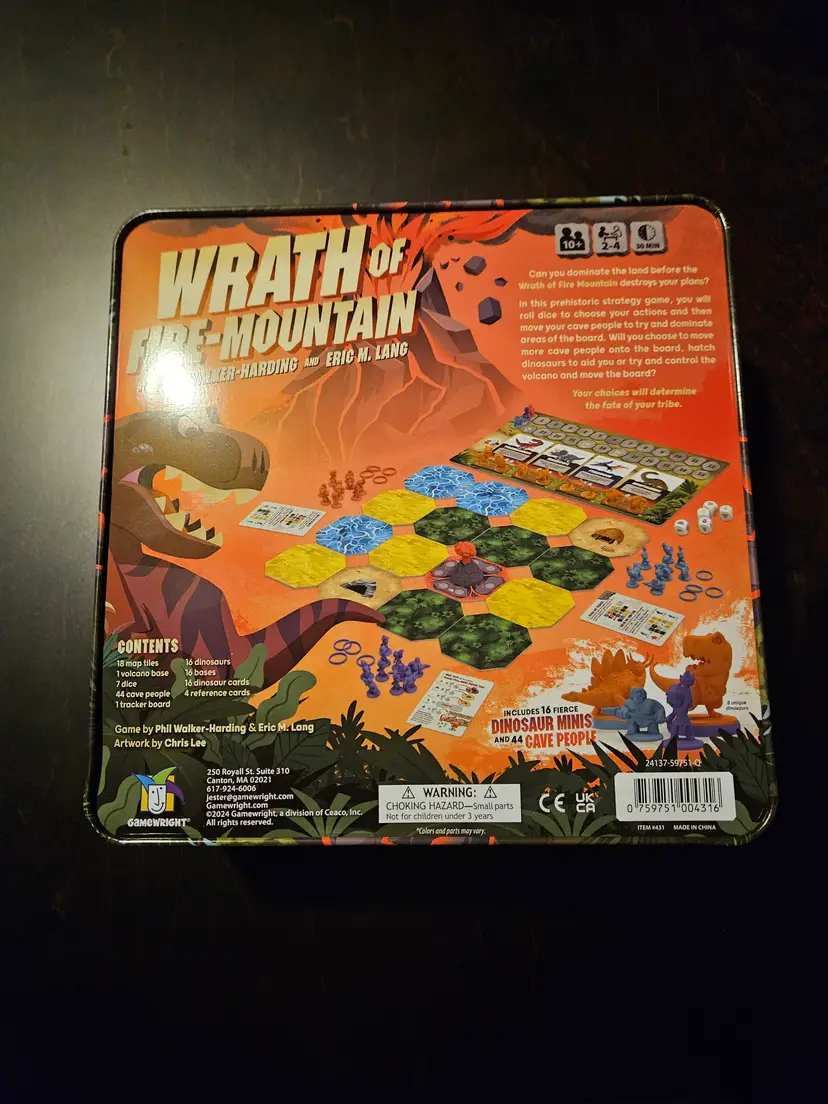 Will you dominate the land before the Wrath of Fire Mountain destroys your plans? A strategy game where you'll roll the dice to choose your actions and then move your cave-people strategically to take advantage of the board. You will explore the lands for dominance, hatch dinosaurs for extra power, or beseech the volcano for help. But beware - whomever controls the fire-mountain each turn can change the board and the fate of each player. The player with the most points at the end of the game - WINS!