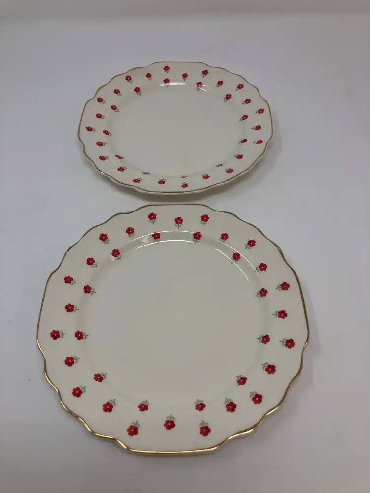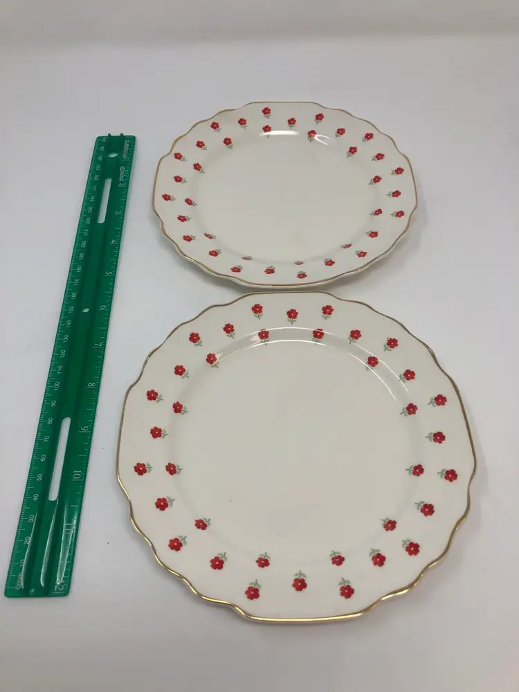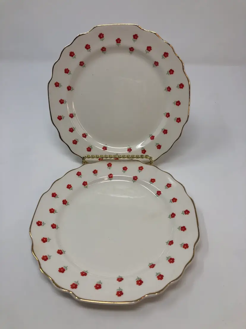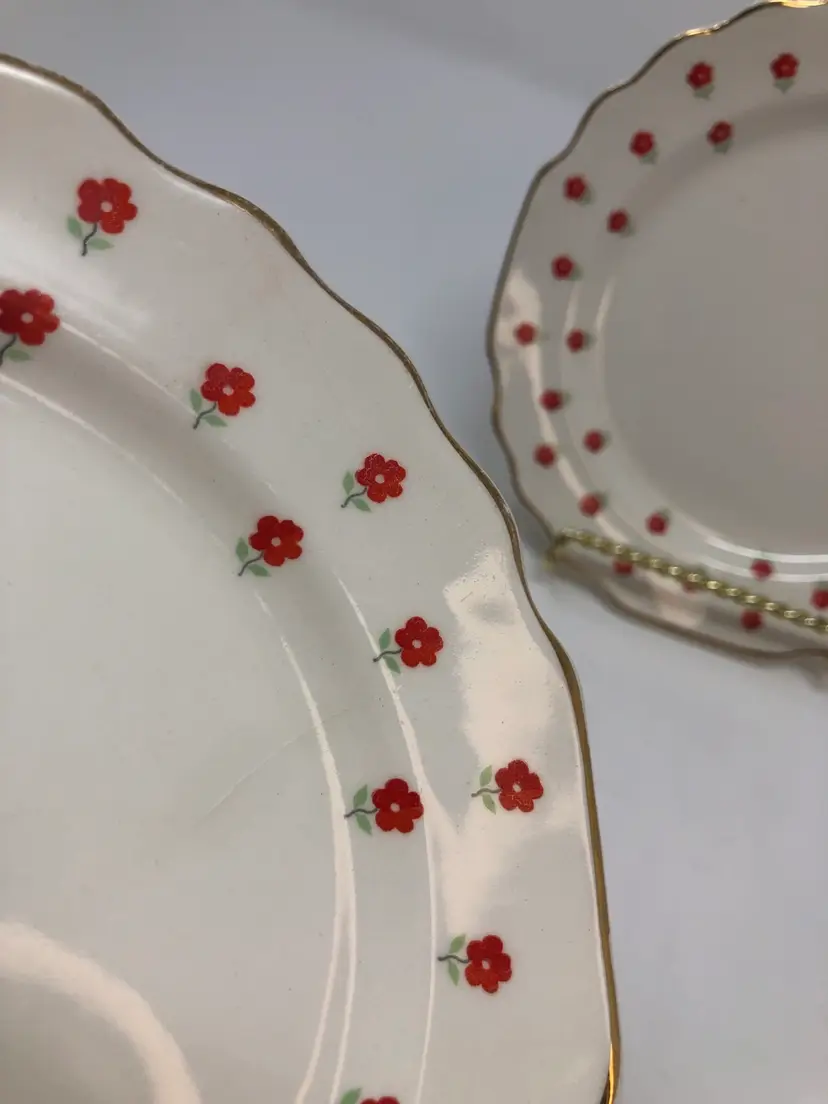 So cheery! These pretty little posy plates feature bright red blooms and gold trim around the edges. Made in the USA by WS George Pottery Company, this pattern was discontinued in the 1950’s. One plate has a chip and a small crack as shown in photos.