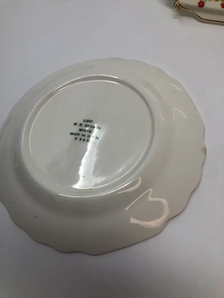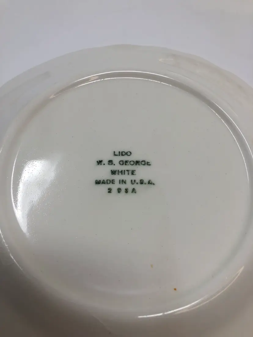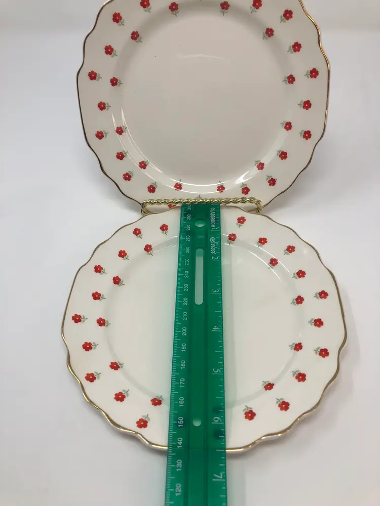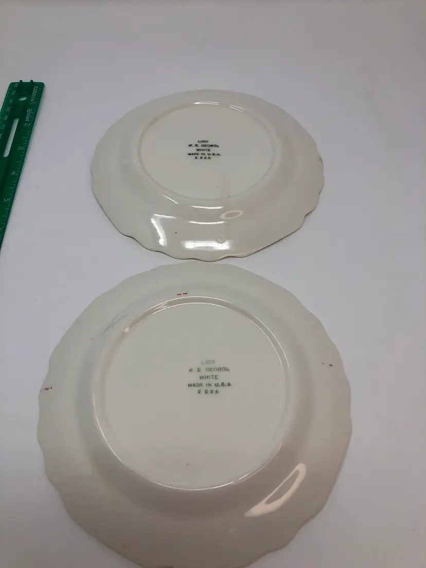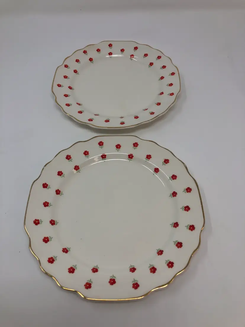 So cheery! These pretty little posy plates feature bright red blooms and gold trim around the edges. Made in the USA by WS George Pottery Company, this pattern was discontinued in the 1950’s. One plate has a chip and a small crack as shown in photos.