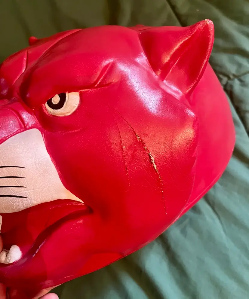 Please look at all the photos prior to deciding to make a purchase. This is a pre-owned item with crackling, “claw” cheek tear, and ear tip wear along with possible dust/grime. It has been in a garage storage for some time. Buyer is strongly encouraged to review the photos and decide for themselves its condition as my interpretation may not align with yours. Prior to a purchase, questions not answered in photos, details, description are welcome.