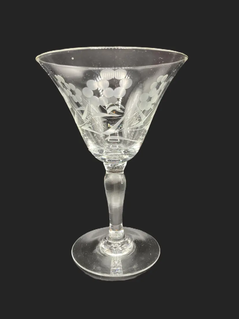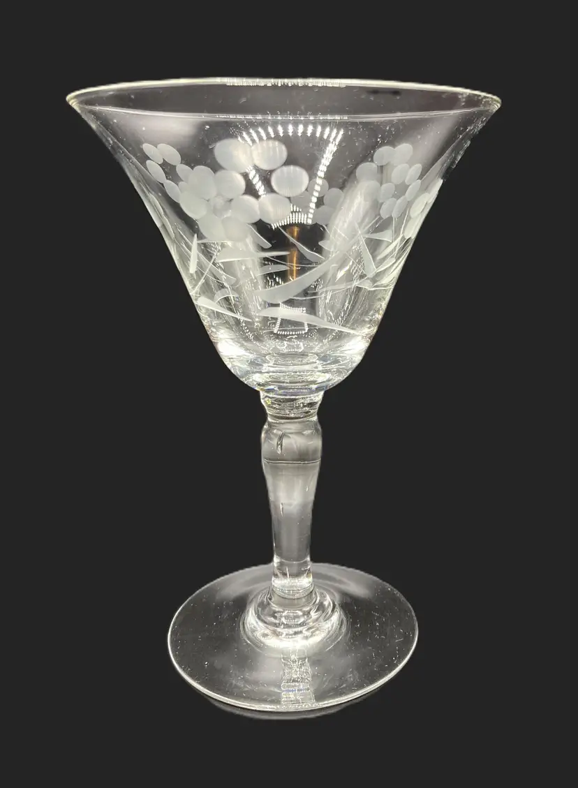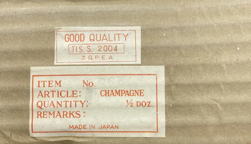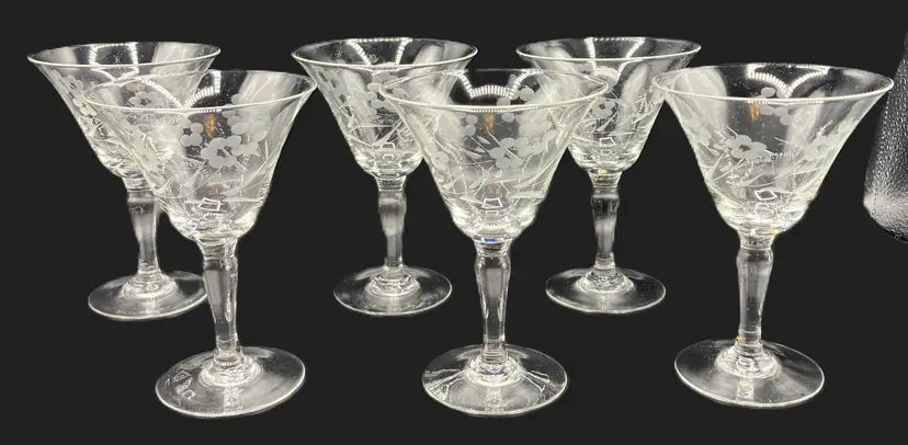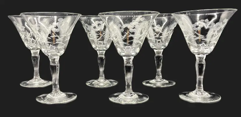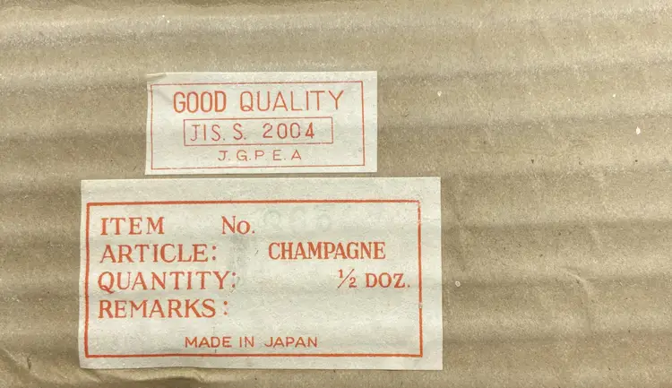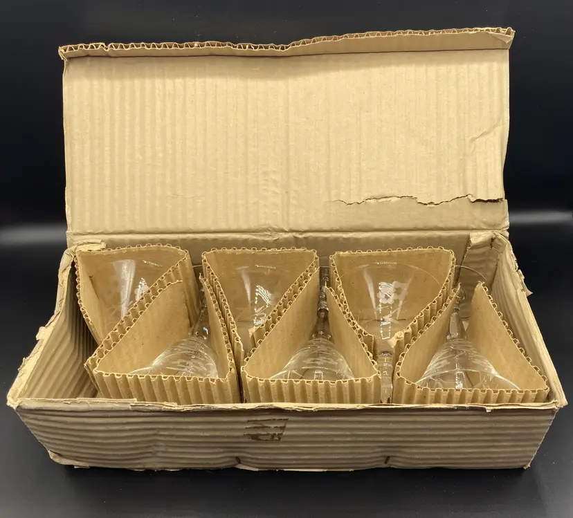These champagne glasses are in good condition, never used and still in original box. There is one glass that has a manufacturing defect but does not affect the functionality. The original box is in fair condition. Please see pictures for specific details. Each glass measures approximately 5" tall x 3 1/2" wide at the top x 2 3/8" wide at the bottom.