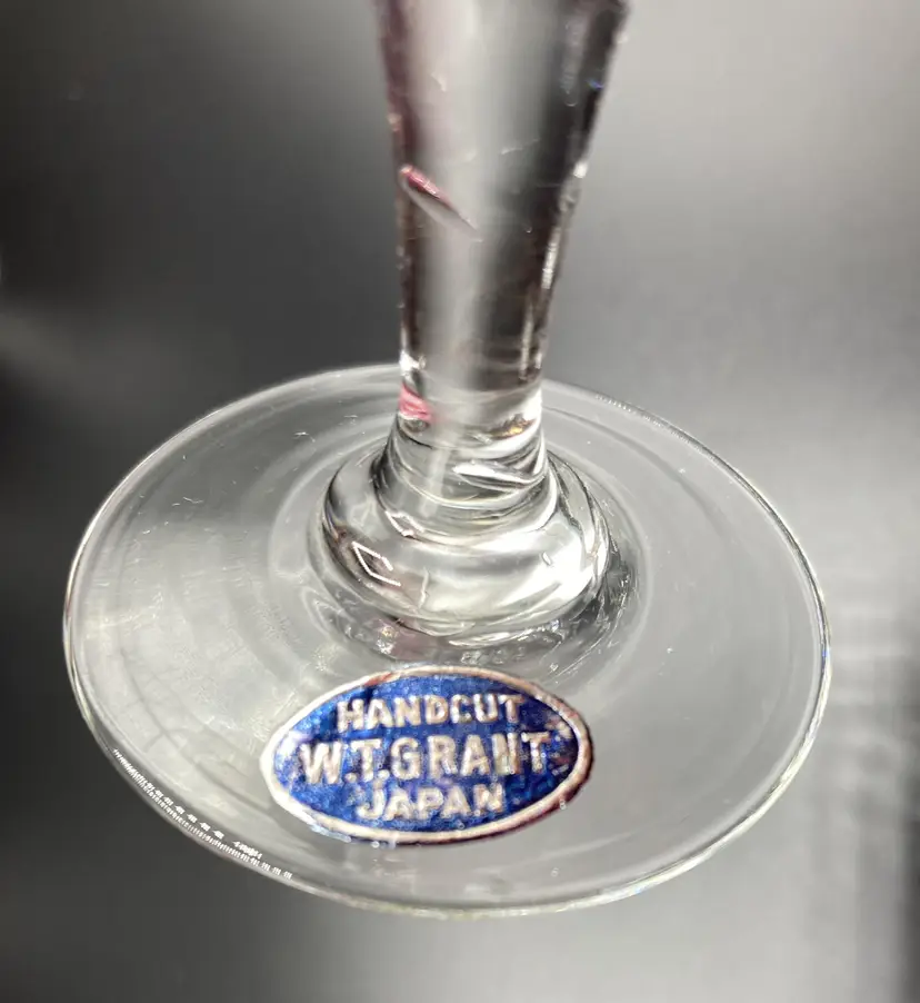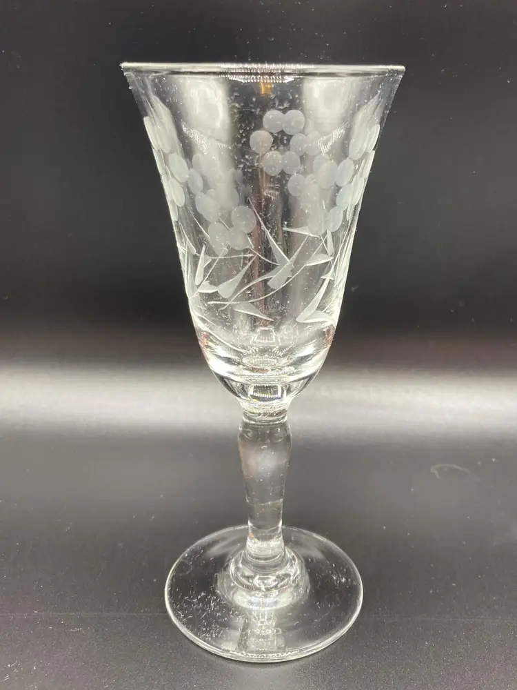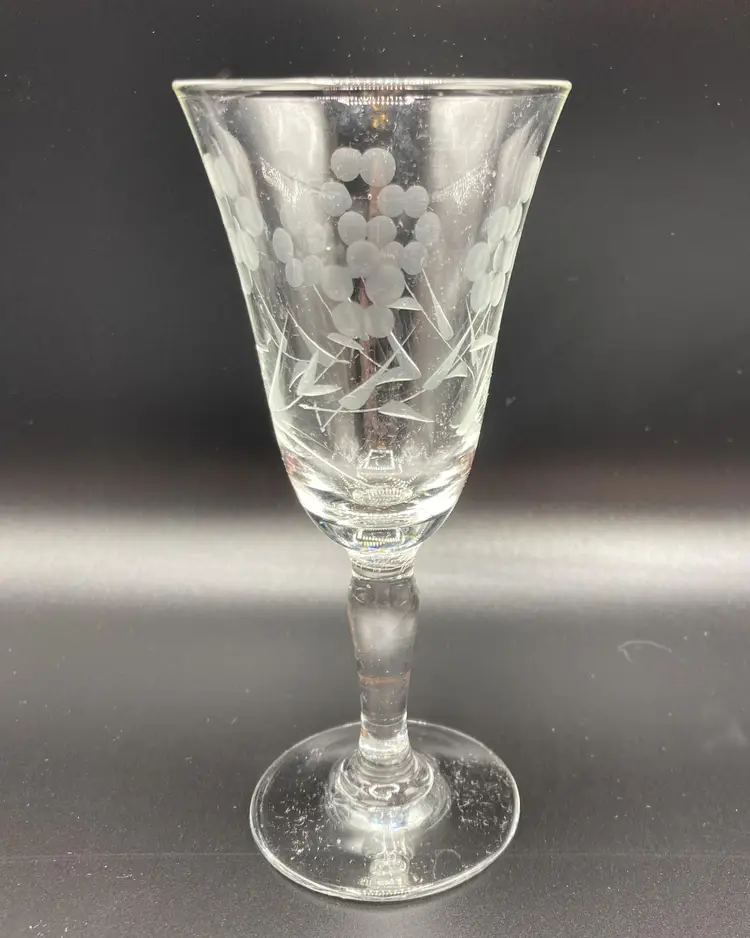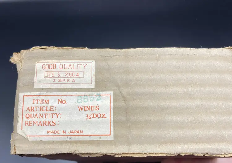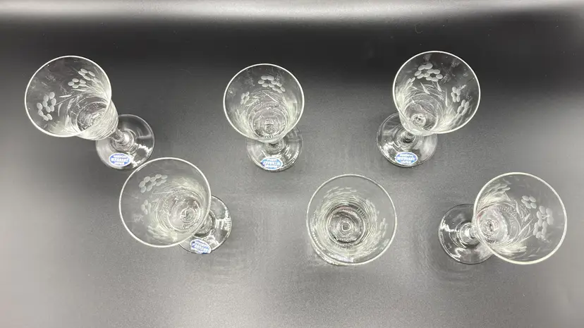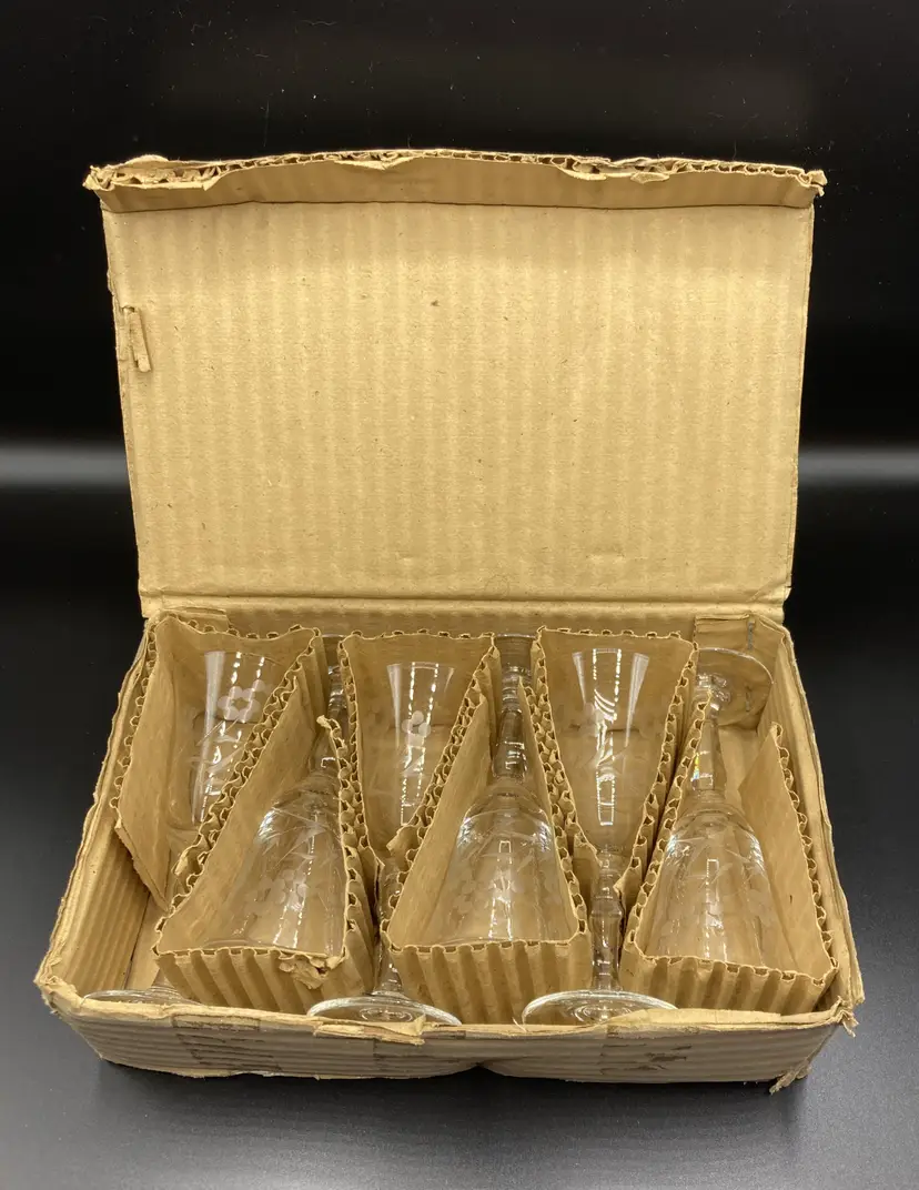 These wine glasses are in good condition, never used and still in original box. The original box is in fair condition. Please see pictures for specific details. Each glass measures approximately 4 7/8" tall x 2 1/8" wide at the top x 1 7/8" wide at the bottom.