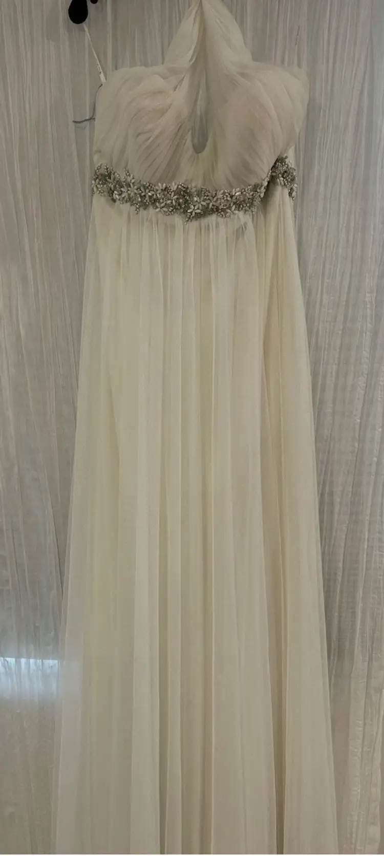 The Wtoo Wedding Gown in size 6 is a stunning off-white gown designed by Watters. With a sleeveless design and a halter top silhouette, this gown exudes elegance and sophistication perfect for a formal occasion like a wedding. The regular size 6 ensures a comfortable and flattering fit for the bride. This gown is sure to make a bride look and feel stunning on her special day. This was a sample wedding dress out of a bridal boutique so you will see in the pictures that there is some wear.