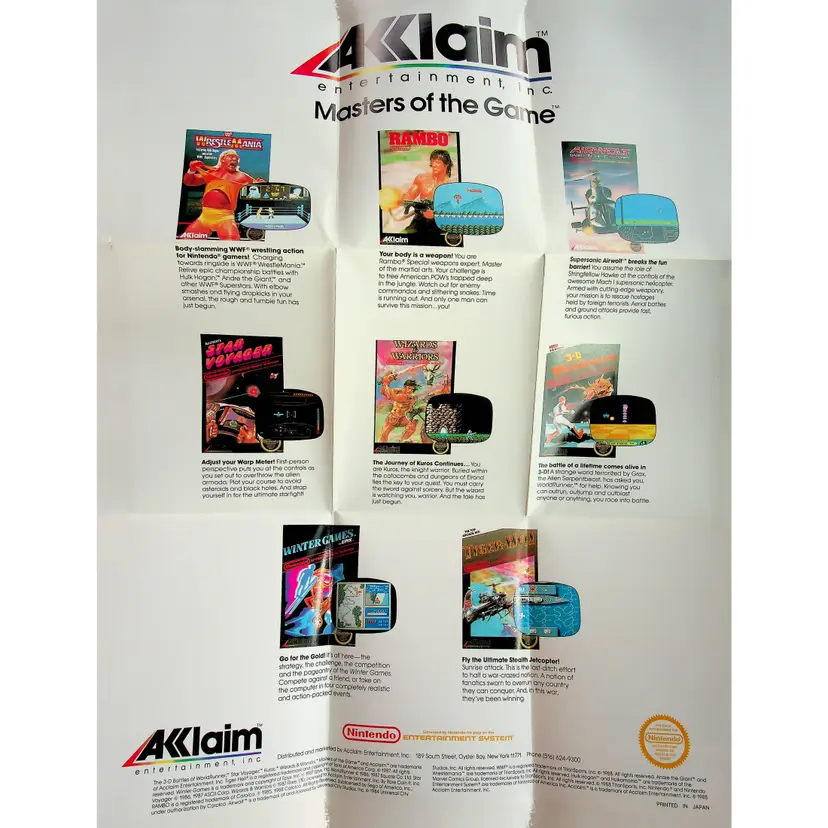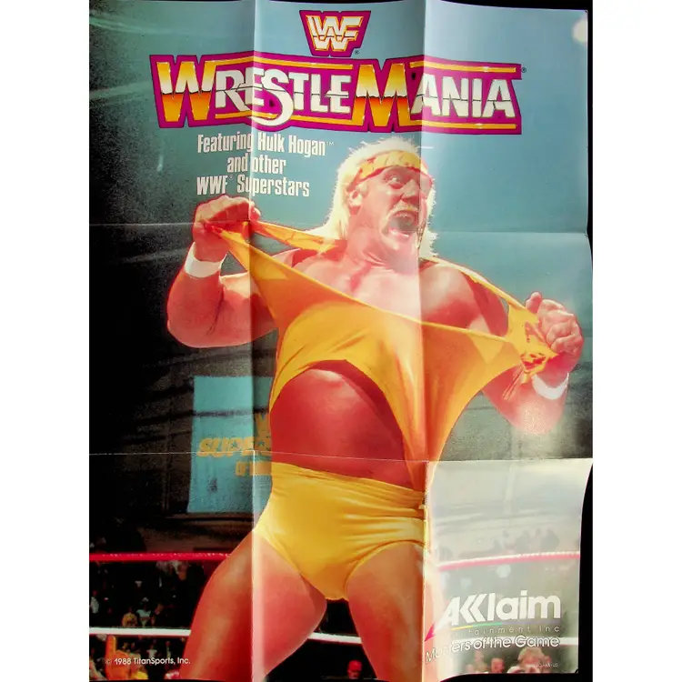 From Aklaim Entertainment, Inc. Masters of the Game: a paper poster for the "Wrestle Mania" game, on the Nintendo Entertainment System. Ad features Hulk Hogan and other WWF superstars. The ad was printed in English in Japan and is dated 1988. Code number is ACL-HN-US.