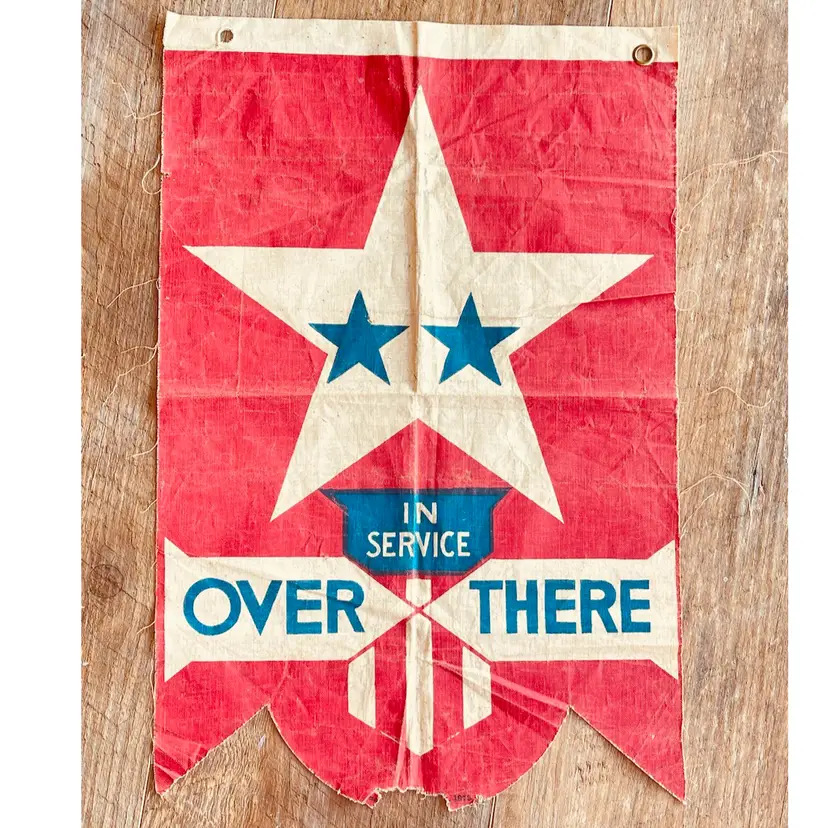 WWI Blue Star Service Flag Patriotic Window Banner – “Over There” Design (11” x 8.75”) This authentic WWI-era Blue Star Service Flag was displayed by families to honor loved ones serving overseas. The banner features a striking red background with a large white star, containing two blue stars representing family members in active military service. Beneath the star is the phrase “In Service,” with “Over There” proudly displayed at the bottom, signifying soldiers deployed abroad. Measuring 11” x 8.75”, this banner is a touching piece of American military history, perfect for collectors of wartime memorabilia. The fabric shows age-related wear and minor fraying, adding to its vintage charm.