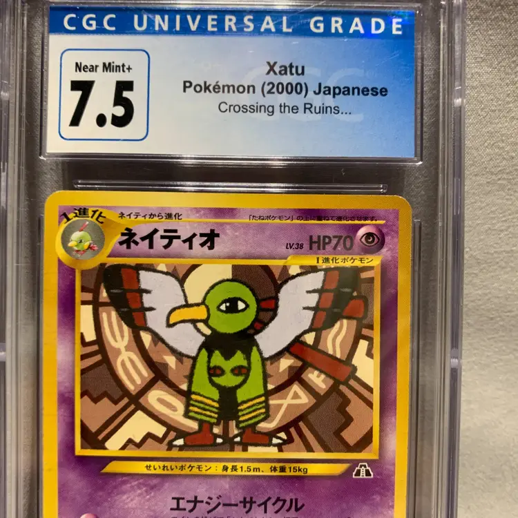 The Xatu 2000 Pokemon Japanese Vending Series 6 Crossing the Ruins card is a rare collectible from the Pokémon TCG, featuring a unique design by illustrator Sumiyoshi Kizuki. This ancient creature card, made of card stock in Japan, showcases intricate details and vibrant colors typical of the Pokémon franchise. With a CGC 7.5 rating, this card is a prized possession for any collector of rare and sought-after Pokémon cards.