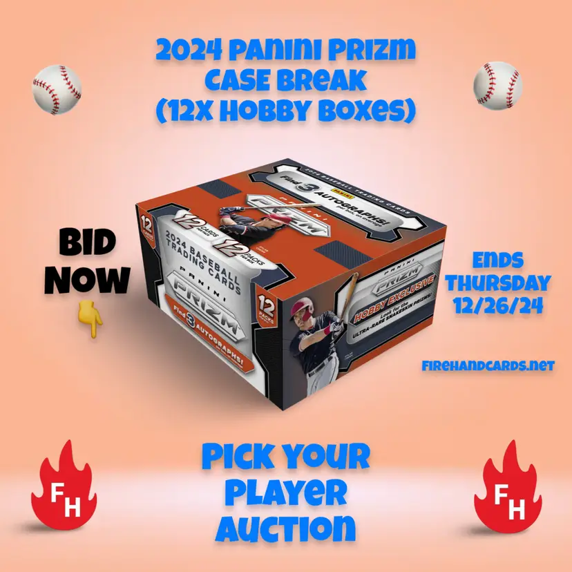 You are bidding on all the cards of the player listed in the title in this CASE (12x Hobby Boxes ) of 2024 Panini Prizm Baseball Cards. Auctions end Thursday night 12/26 & Case will be opened LIVE on Friday 12/27 during the day. Opening will be viewable & simulcast on Firehand Cards District as well as YouTube. US Shipping is $5.00 for your first auction spot won and only $.25 per additional spot won after that! Any spot won where no cards of the player are found in the box will receive a bonus card or pack from the Firehand collection. Any hit pulled (Cut Signatures etc) of a player who is NOT listed in the auction will be assigned by draw between all participants. Any multi-player autographs will be assigned by draw between the spots depicted on the card