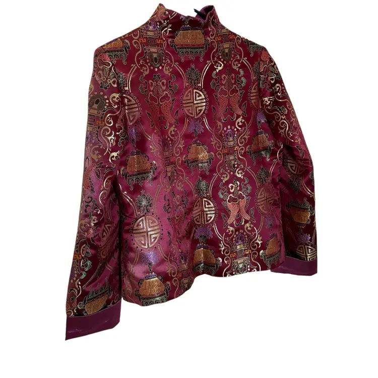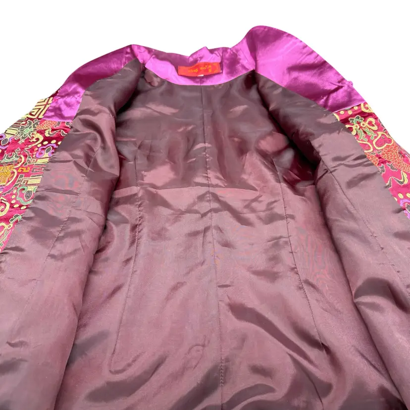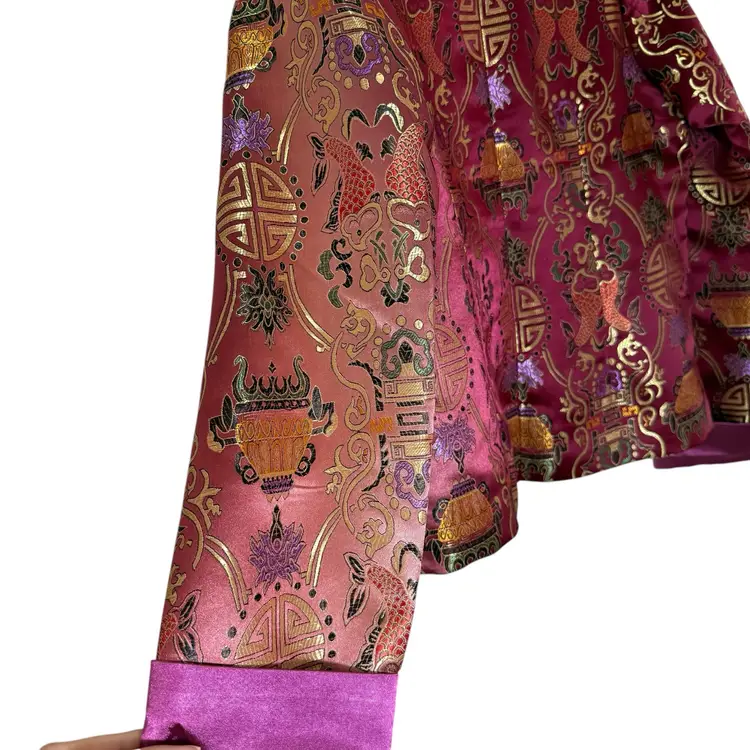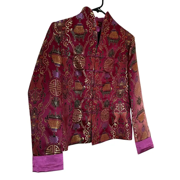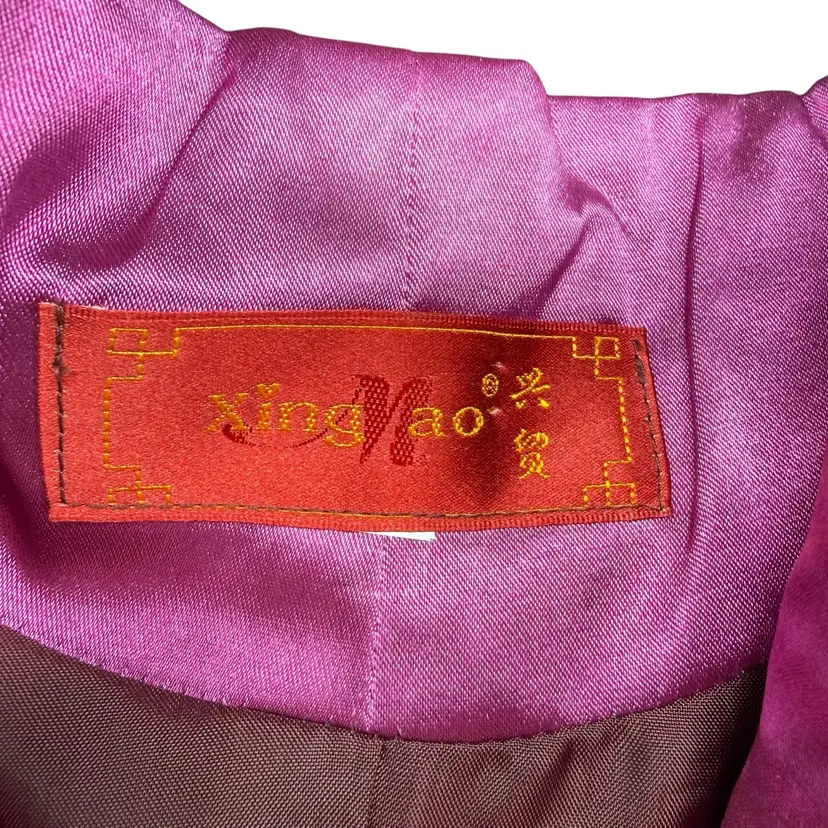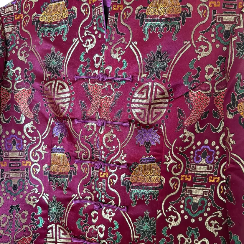 The Xing Mao Silk Brocade Traditional Tang Style Chinese Women's Jacket in size S/M is a stunning and vibrant piece that is perfect for various occasions. The jacket features ornate floral scrolling with double fish and shou symbols, stunning embroidery, padded shoulders, roll cuffs, and a mandarin collar. It is a luxurious and comfortable addition to any wardrobe. The vivid multicolor design and frog closures add a unique and traditional touch to this vintage-inspired piece, making it a standout piece for the winter, fall, and spring seasons.