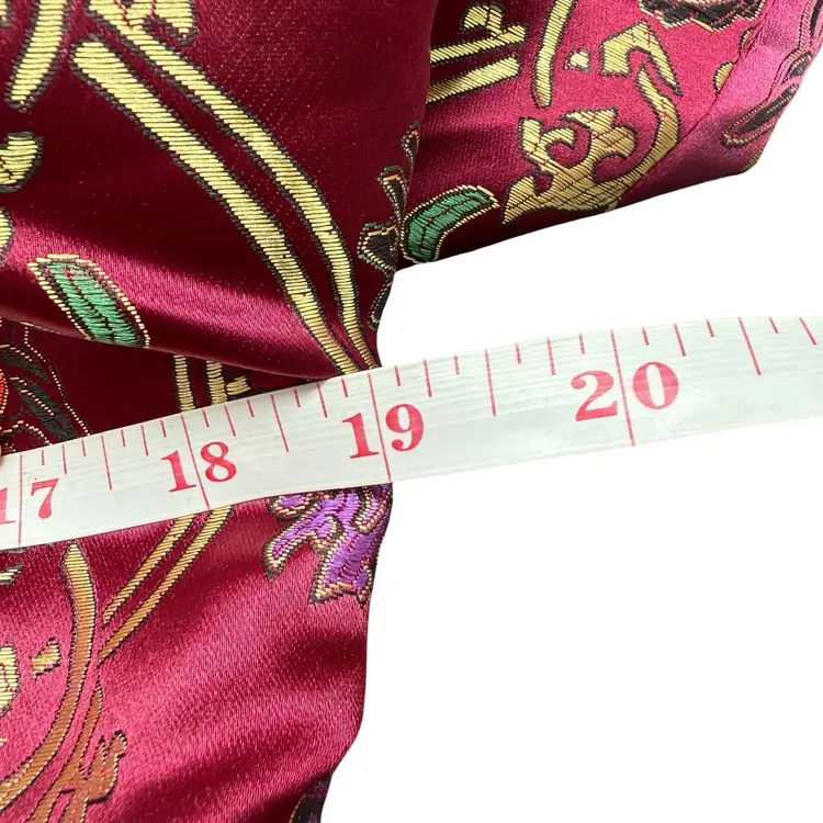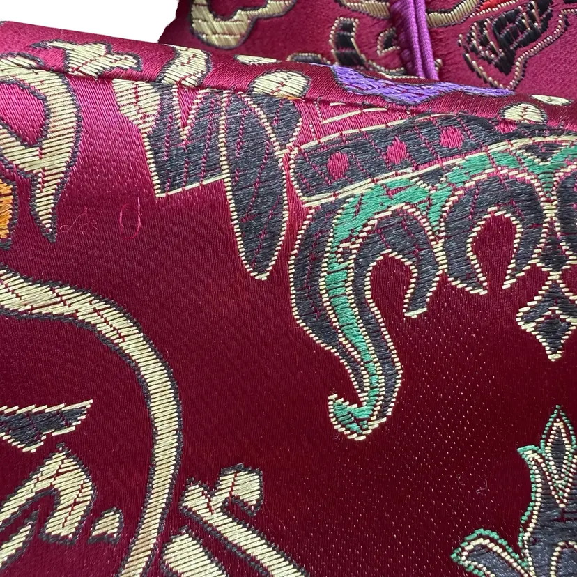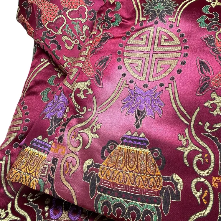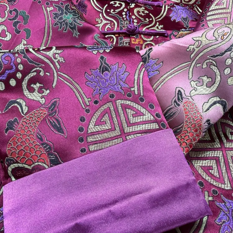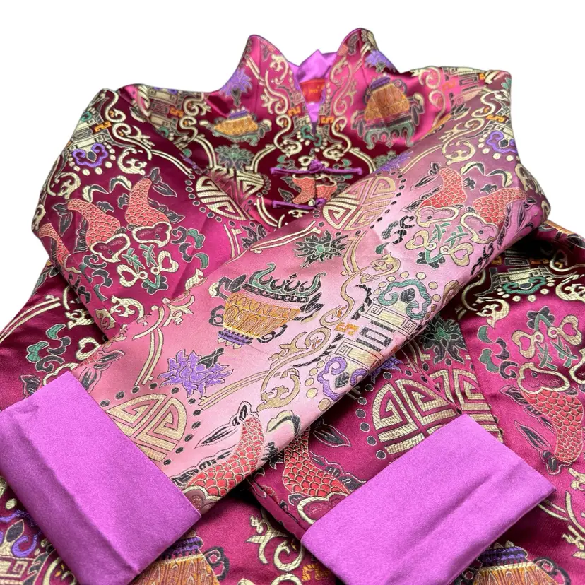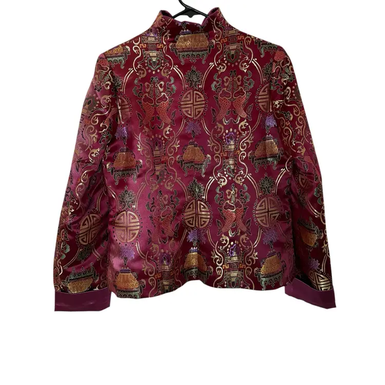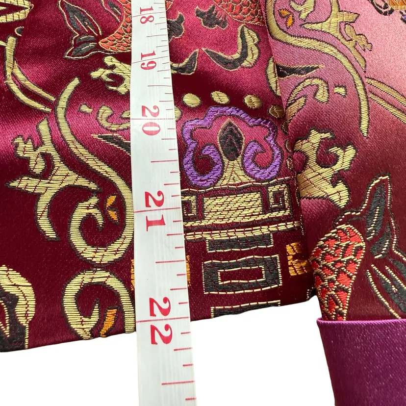 The Xing Mao Silk Brocade Traditional Tang Style Chinese Women's Jacket in size S/M is a stunning and vibrant piece that is perfect for various occasions. The jacket features ornate floral scrolling with double fish and shou symbols, stunning embroidery, padded shoulders, roll cuffs, and a mandarin collar. It is a luxurious and comfortable addition to any wardrobe. The vivid multicolor design and frog closures add a unique and traditional touch to this vintage-inspired piece, making it a standout piece for the winter, fall, and spring seasons.