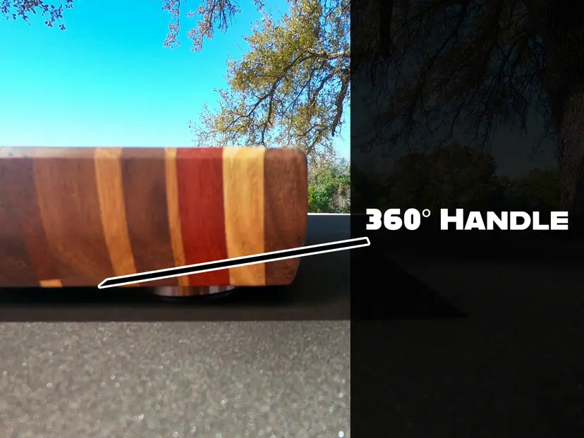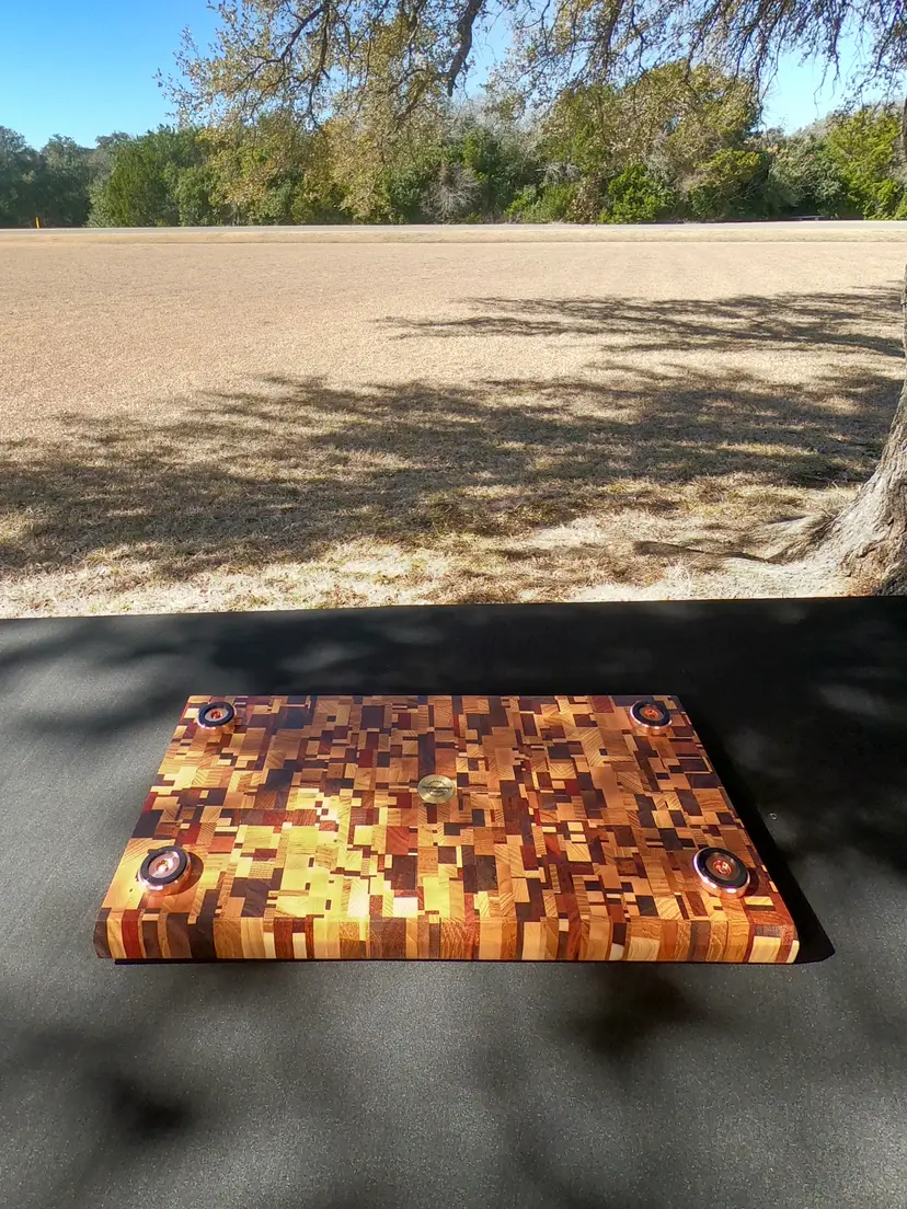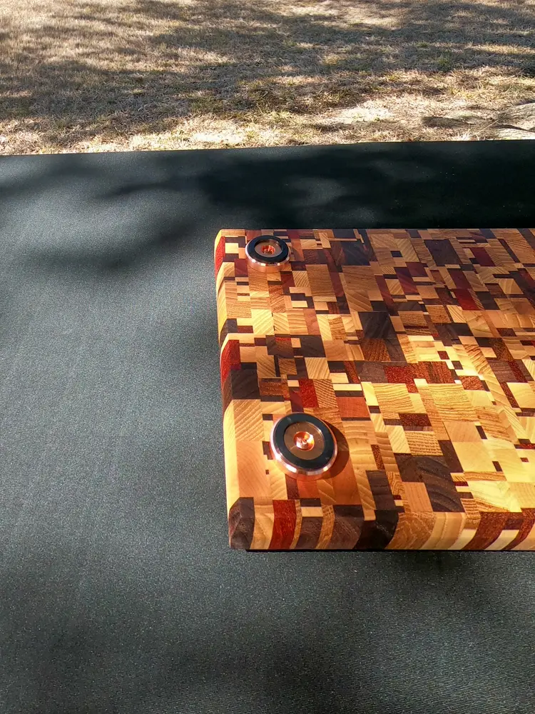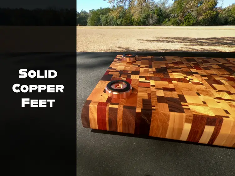 The Build The Wood: A heavy-duty mosaic of over 20 recycled exotic species, creating a vibrant, one-of-a-kind workspace. The Surface: Full end-grain orientation for maximum durability and blade protection. The Hardware: 1.5” solid copper feet with non-slip rubber bottoms. This elevates the board to allow airflow underneath and provides a rock-solid foundation that won’t budge during heavy prep. The Finish: Deep-saturated in a mineral oil bath and finished with a hand-applied food-safe wax.