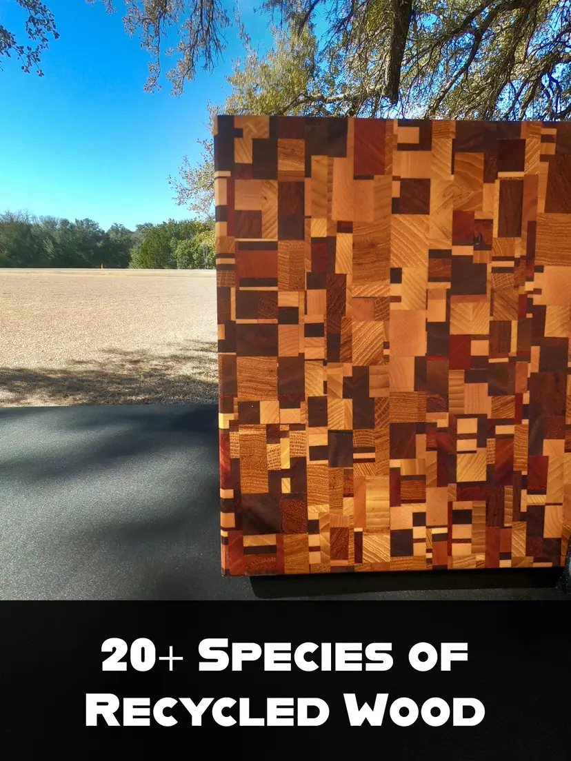 This board is built using a massive contrast of over 20 different species of recycled exotic hardwoods. Because I use reclaimed materials, this is a one of one board that has a completely unique "DNA"—you’re getting a mosaic of grain patterns and densities that you simply can't find in a single-species block.