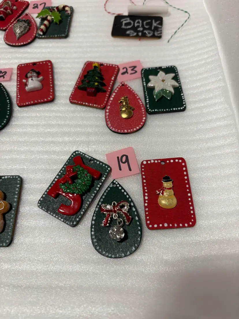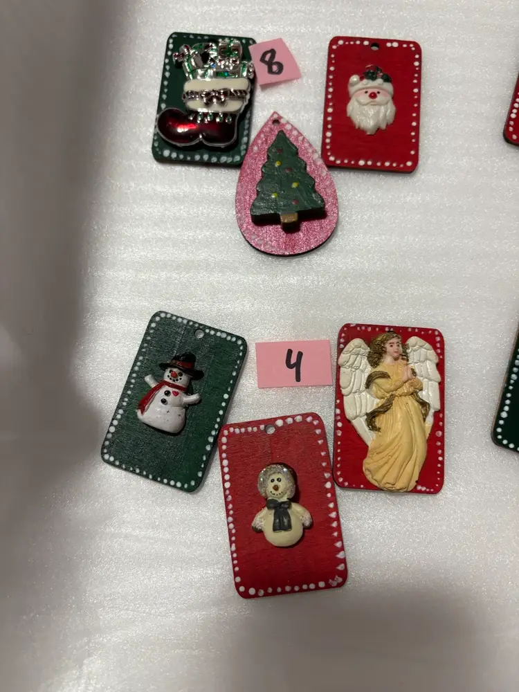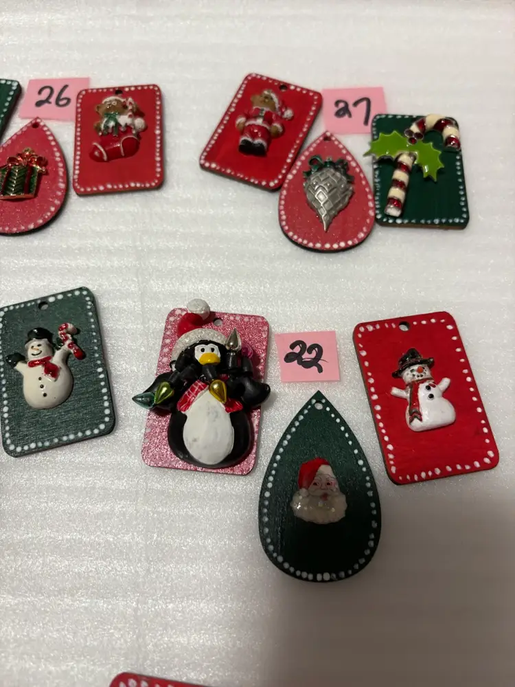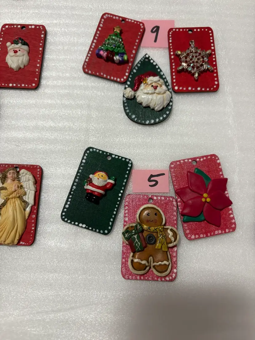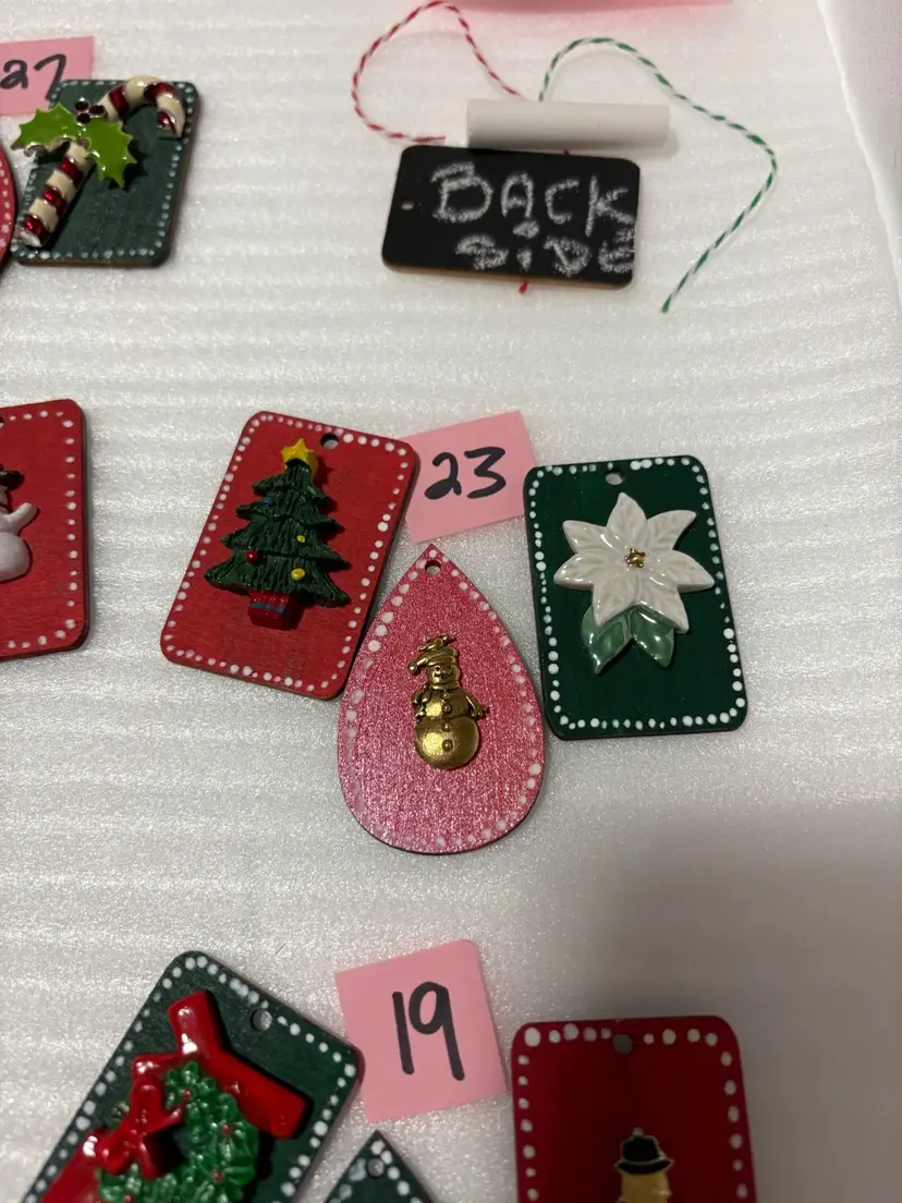 Hand painted/decorated 2x1 inch. Back side is chalkboard paint each set comes with piece of chalk and strings. Shipping $5for 1st set additional $1 for each set. Will add a few other listings with more sets.