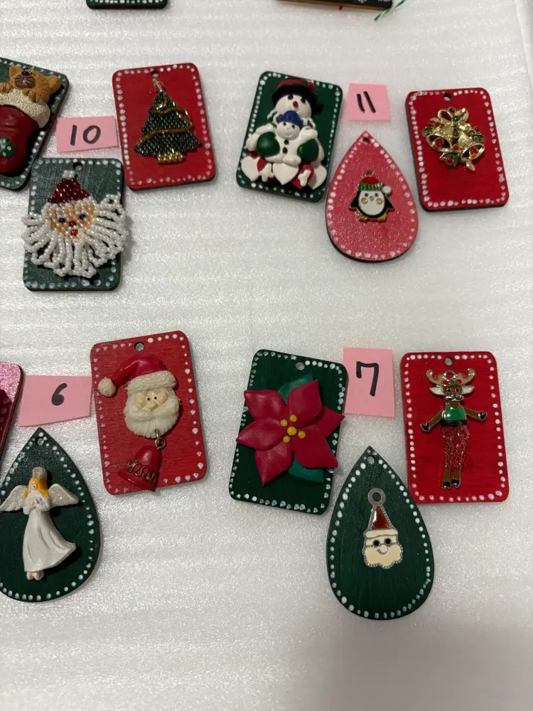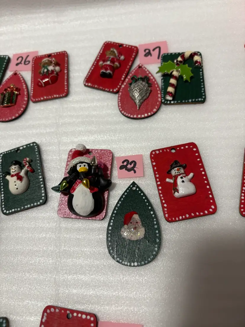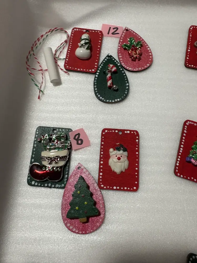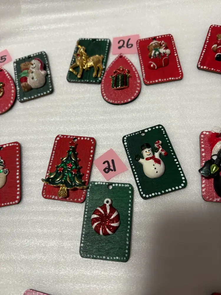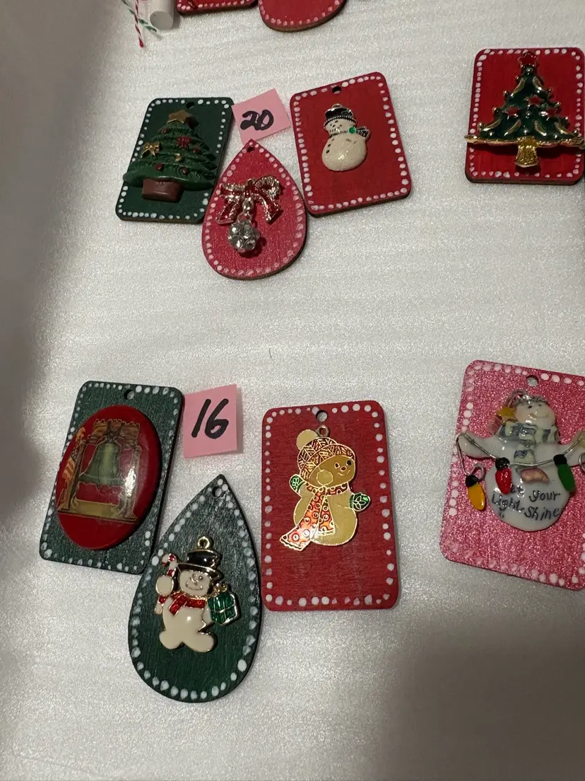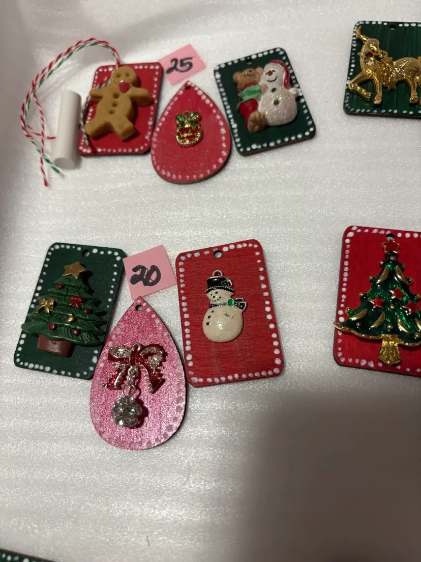 Hand painted/decorated 2x1 inch. Back side is chalkboard paint each set comes with piece of chalk and strings. Shipping $5for 1st set additional $1 for each set. Will add a few other listings with more sets.