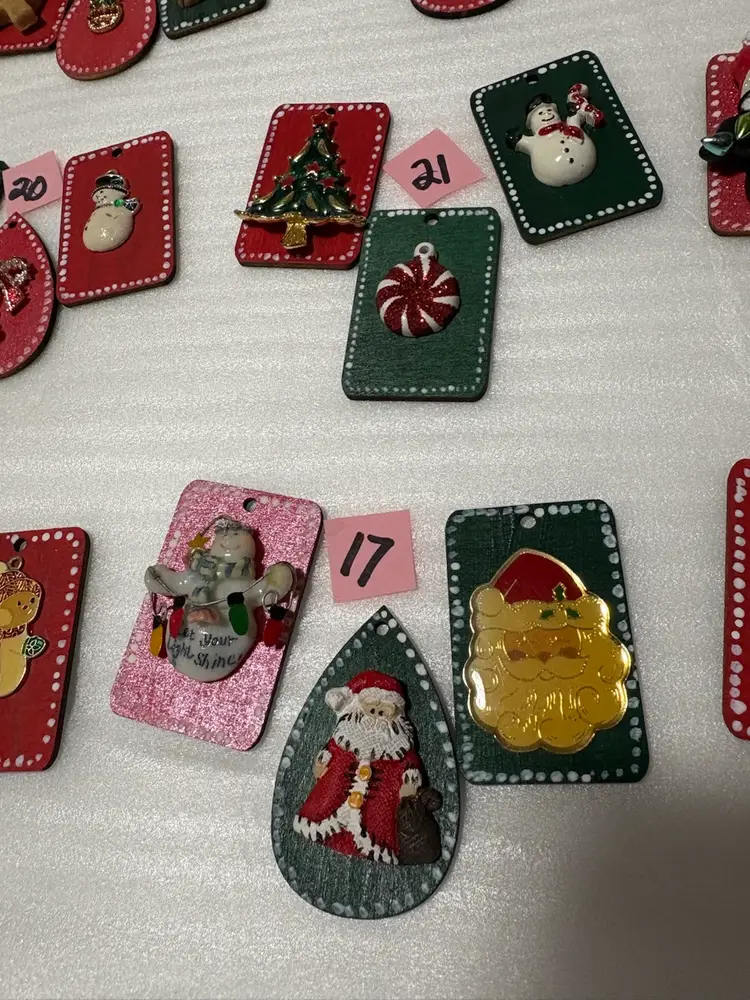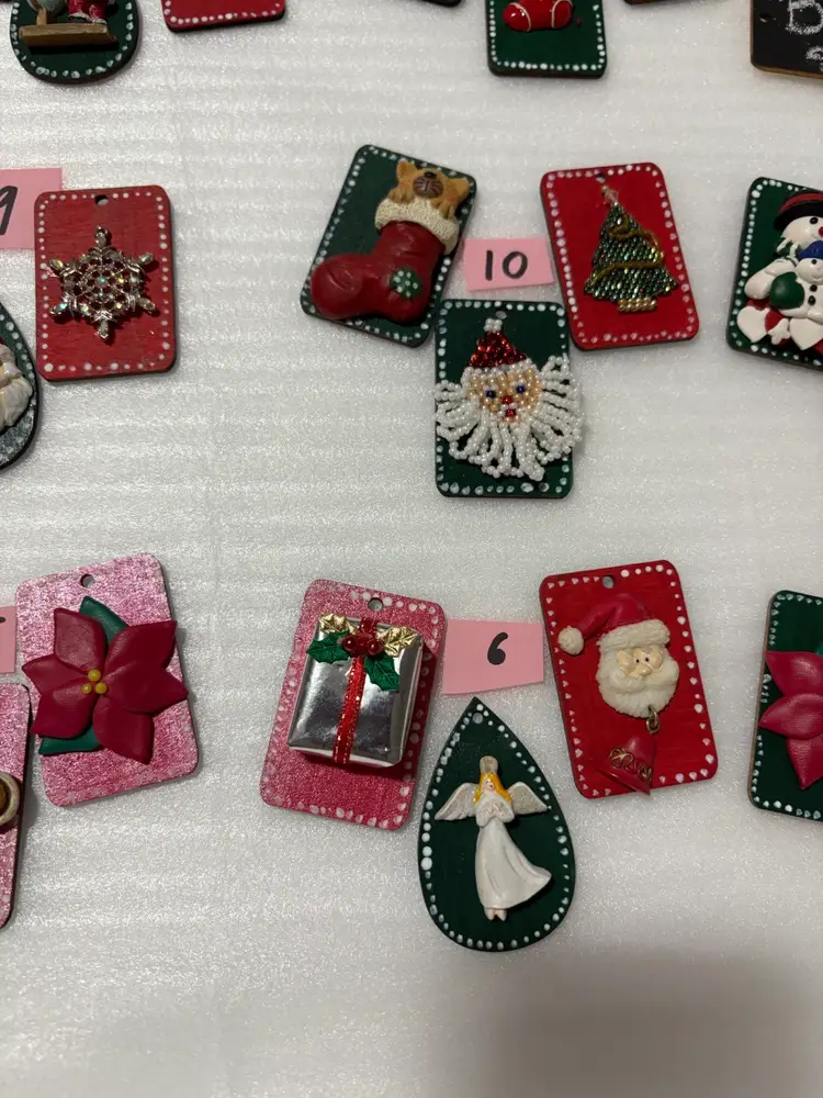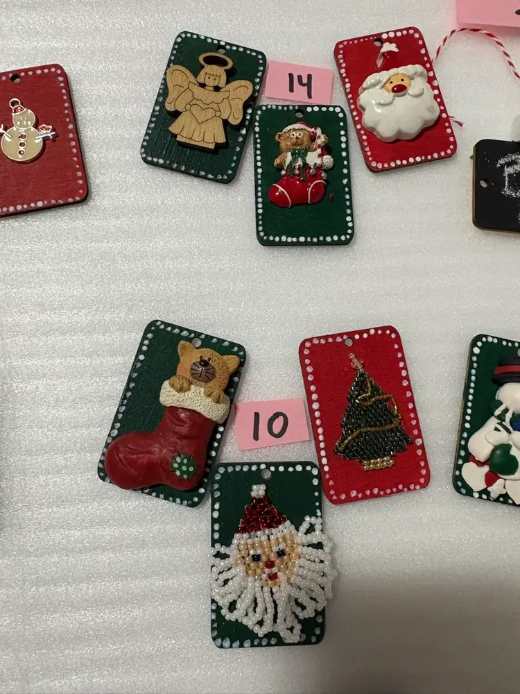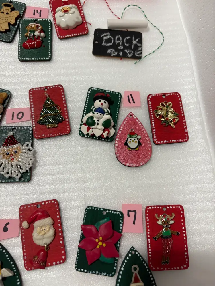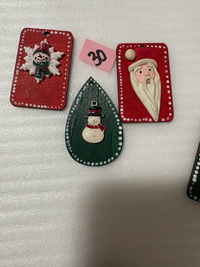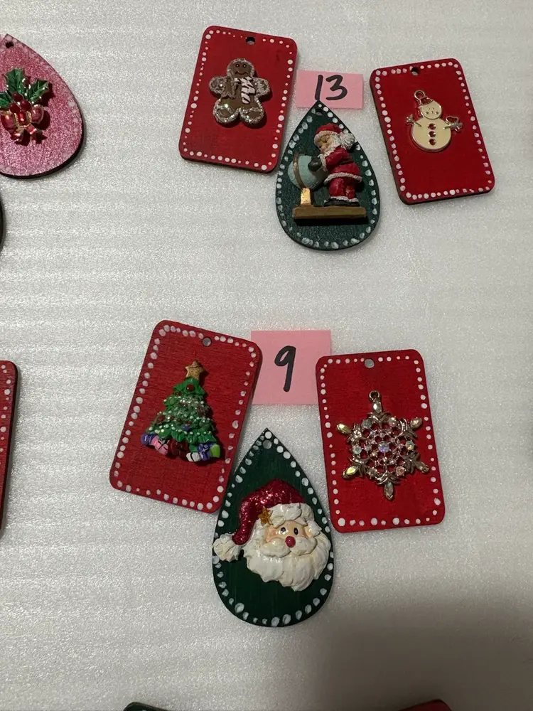 Hand painted/decorated 2x1 inch. Back side is chalkboard paint each set comes with piece of chalk and strings. Shipping $5for 1st set additional $1 for each set. Will add a few other listings with more sets.