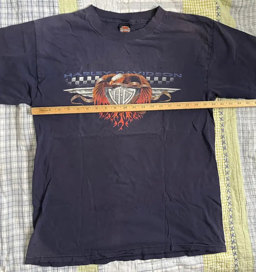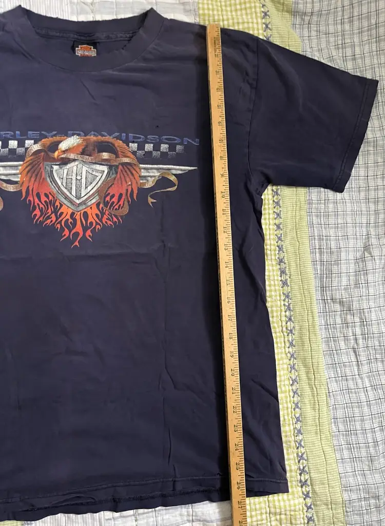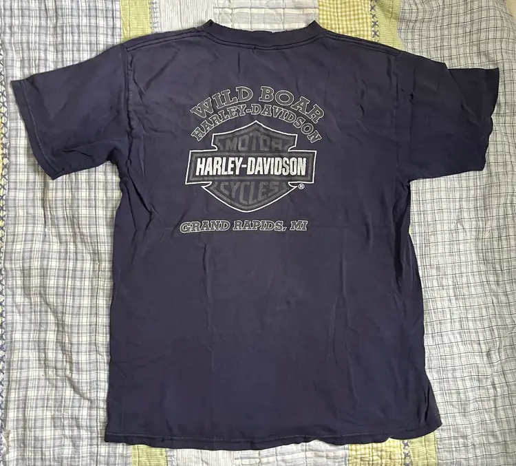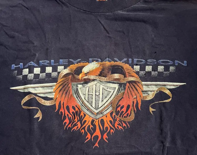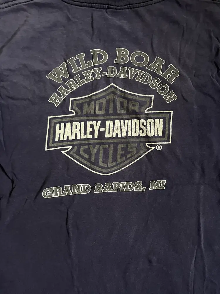 This vintage Y2K Harley Davidson Phoenix Eagle Checkerboard Flame Graphic T-shirt in size Large features a solid design with double-sided graphics - the back highlighting the (no-longer-open) Wild Boar Dealership out of Grand Rapids, Michigan, making it a unique piece for any motorcycle enthusiast. Made of cotton knit fabric, this shirt has a crew neck and short sleeves, ideal for all seasons. The deeper blue color shows distressing of sun fading and ragged edges and small holes give it a rugged, biker-inspired look. Perfect for fans of Harley-Davidson and those who appreciate a piece of motorcycling history.