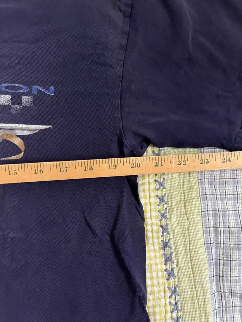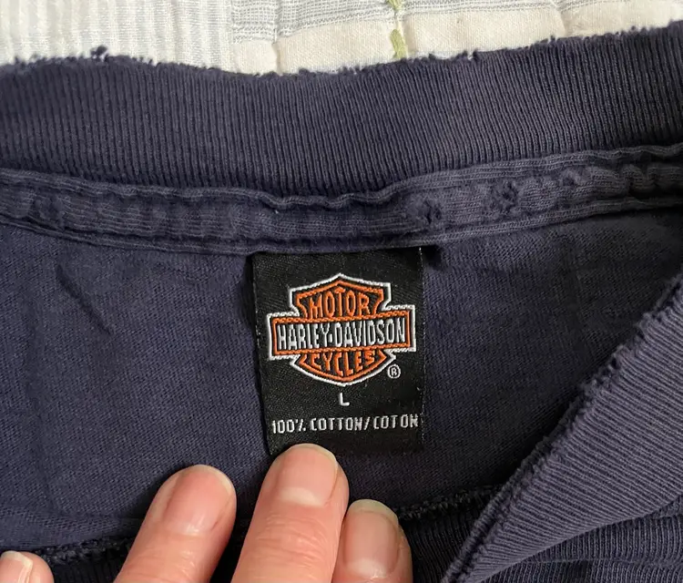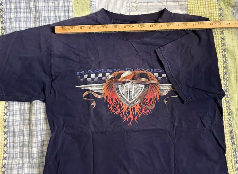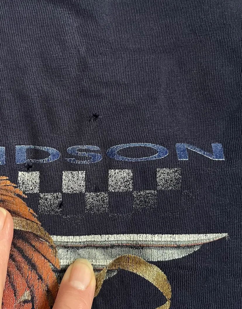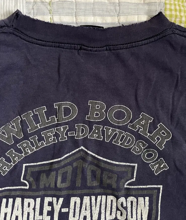This vintage Y2K Harley Davidson Phoenix Eagle Checkerboard Flame Graphic T-shirt in size Large features a solid design with double-sided graphics - the back highlighting the (no-longer-open) Wild Boar Dealership out of Grand Rapids, Michigan, making it a unique piece for any motorcycle enthusiast. Made of cotton knit fabric, this shirt has a crew neck and short sleeves, ideal for all seasons. The deeper blue color shows distressing of sun fading and ragged edges and small holes give it a rugged, biker-inspired look. Perfect for fans of Harley-Davidson and those who appreciate a piece of motorcycling history.